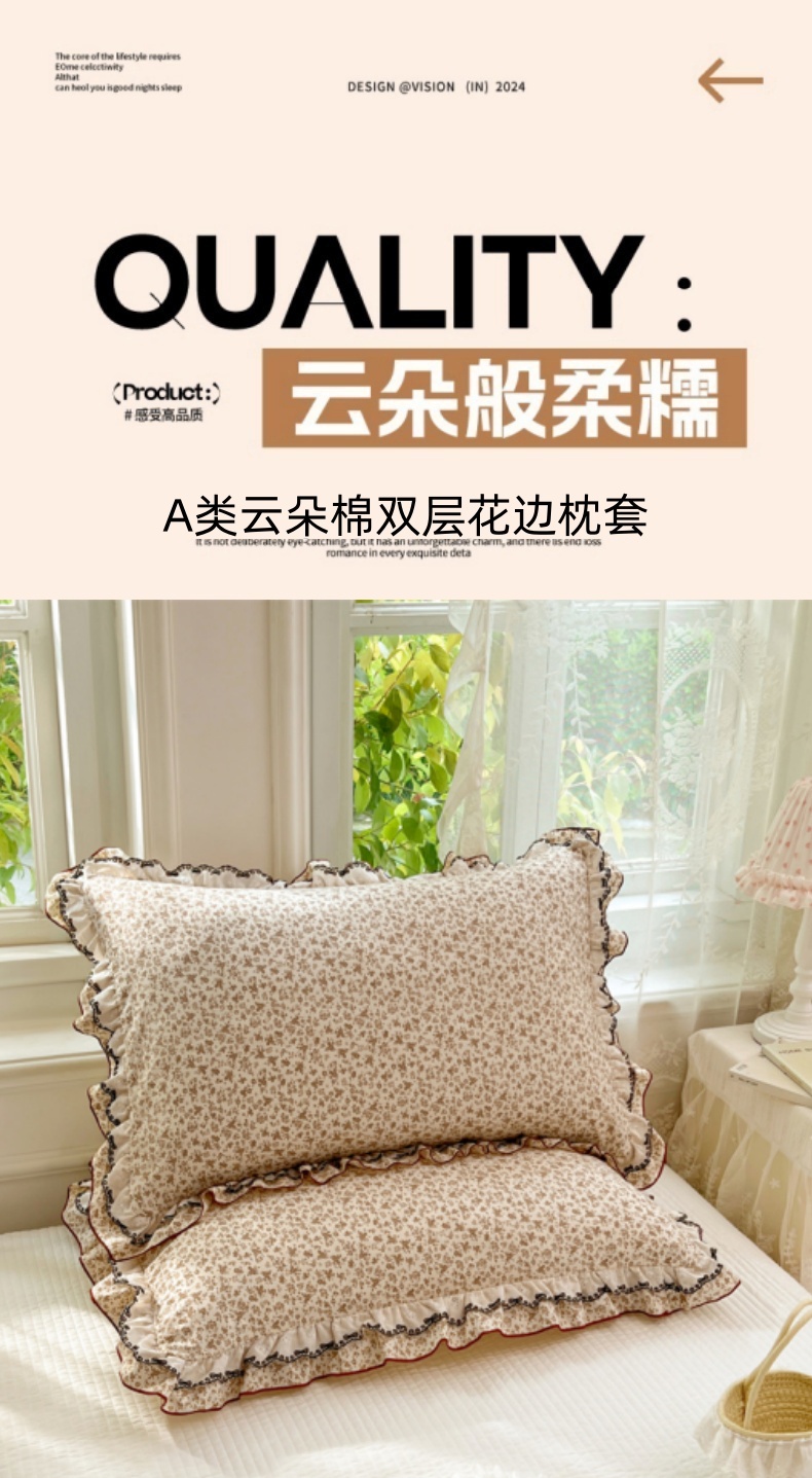 商品名称:圣比熊 2026新款A类云朵棉蕾丝双层花边枕套宿舍单人单只一只装枕芯48x74cm内胆套 浮影