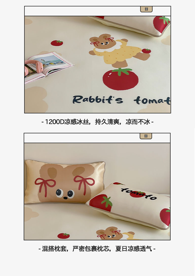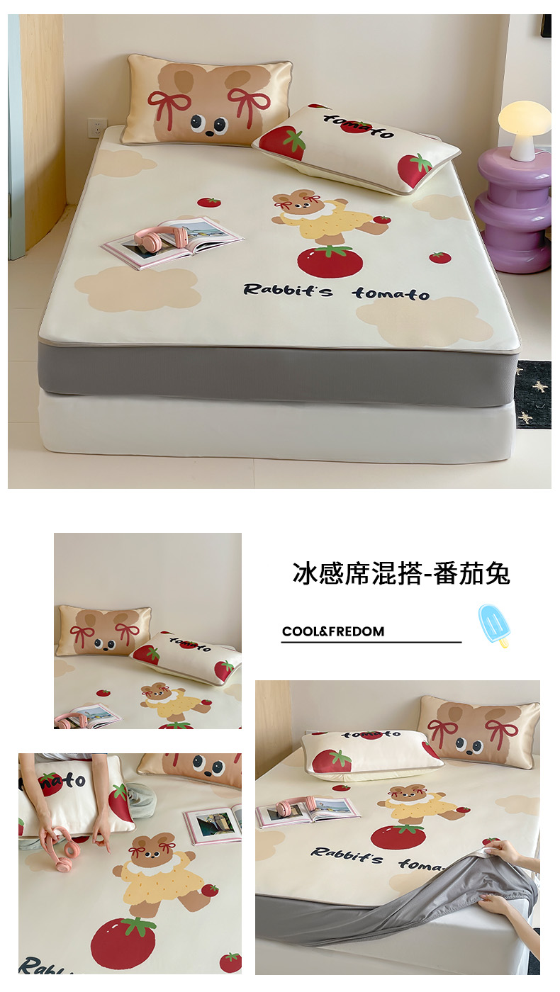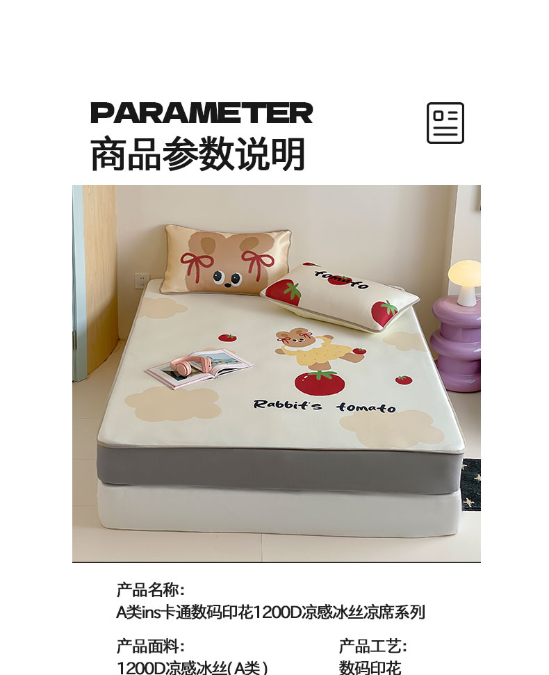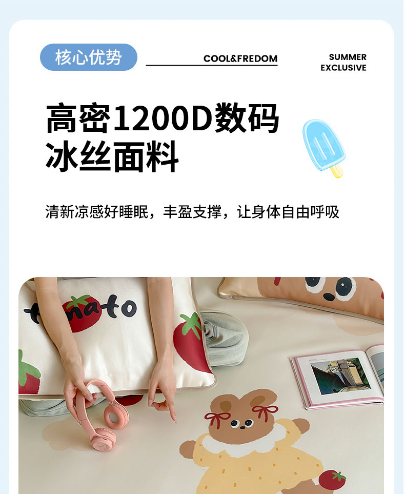 床上用品 > 凉席 > (总)桃子家居 2026新款A类ins博主卡通数码印花高级品质撞色中分子1200D冰感丝凉感席冰丝三件套平铺床笠系列