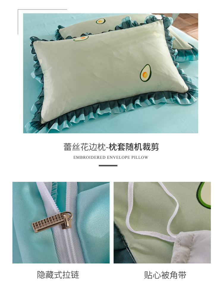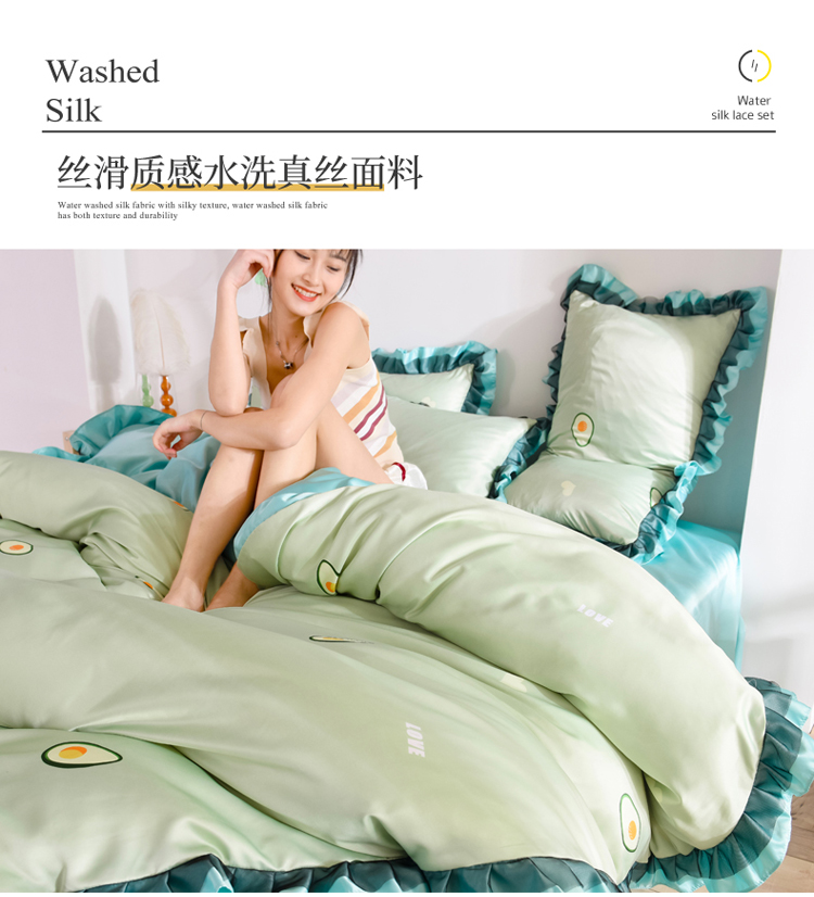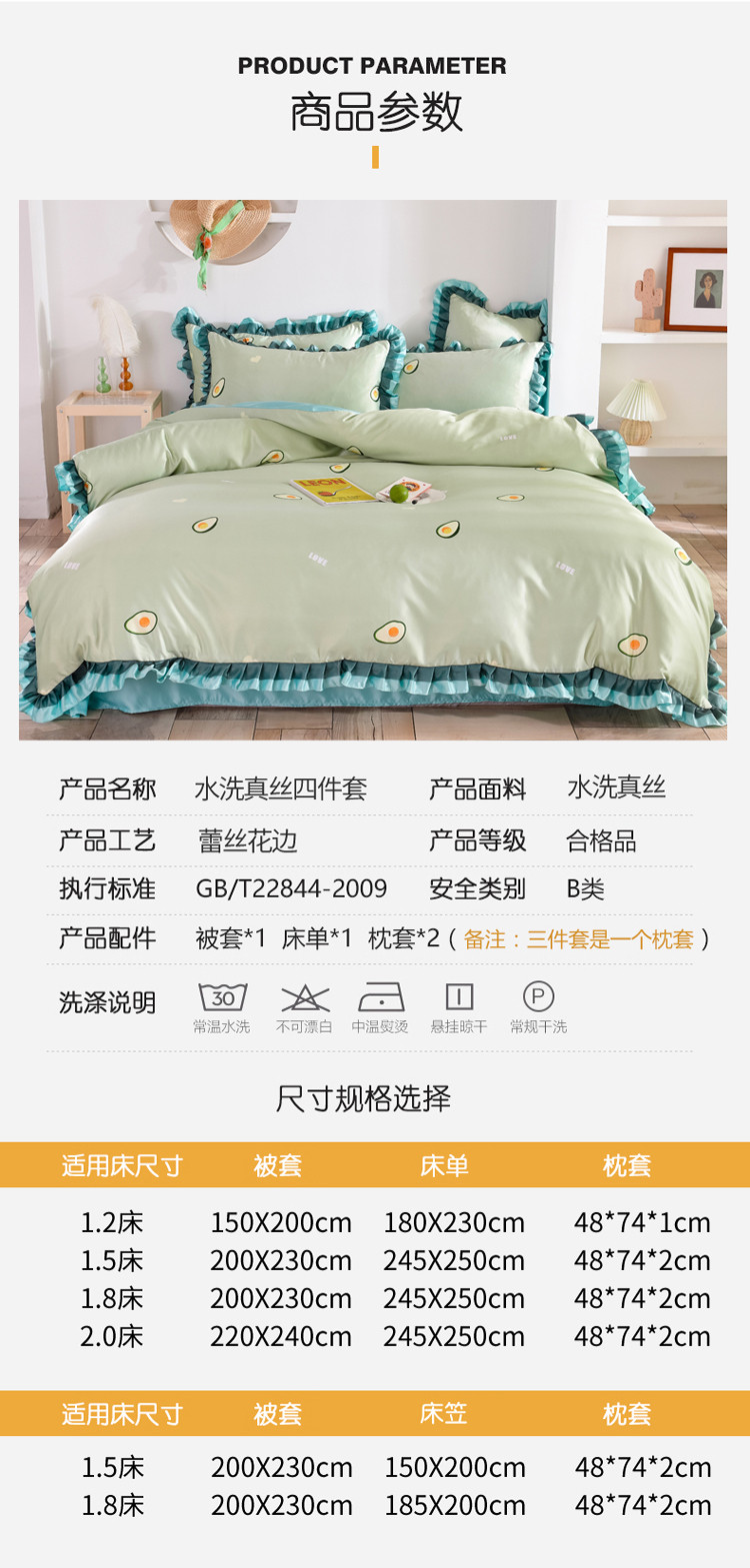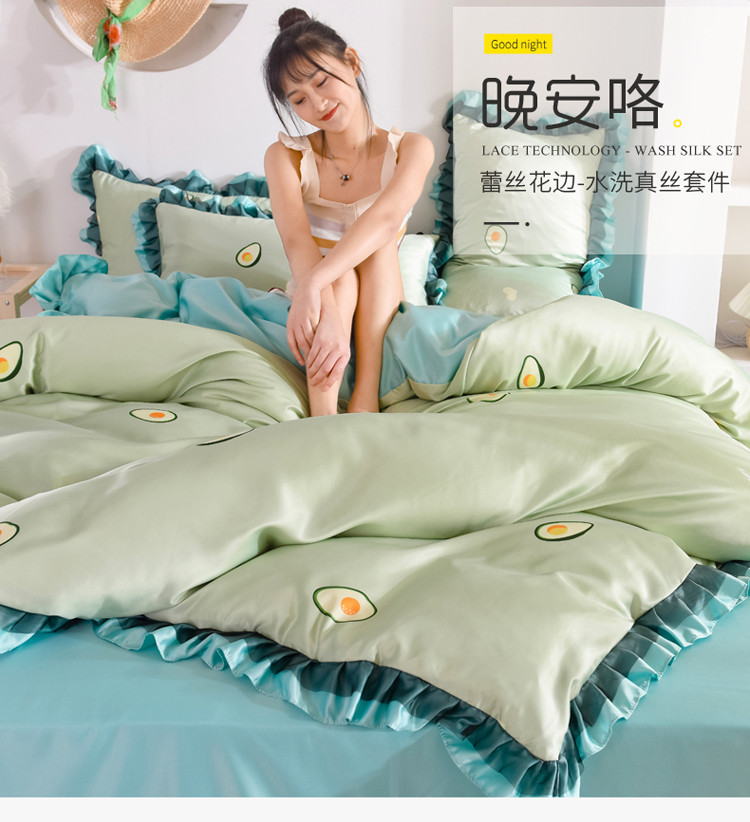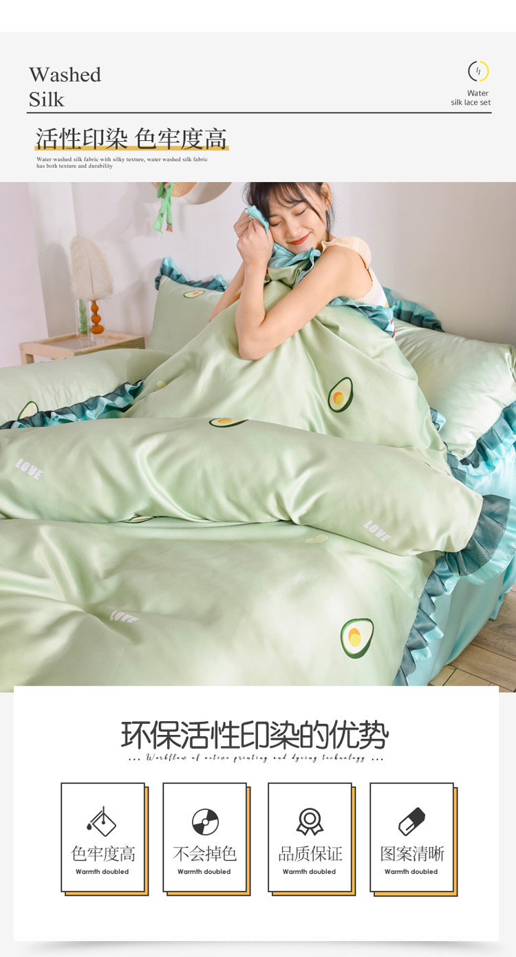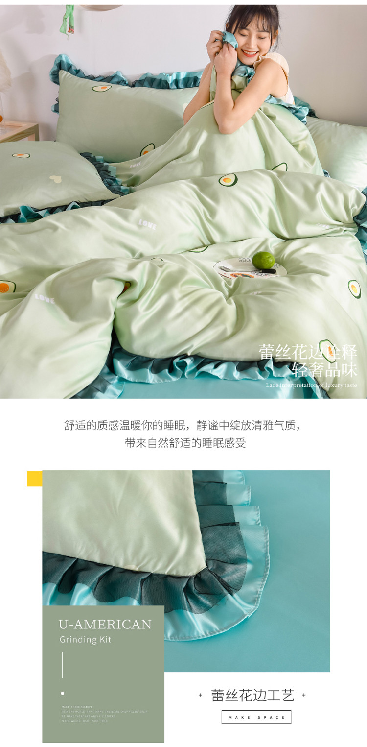 商品名称:欧冠 2020新款水洗真丝蕾丝花边款四件套 牛油果