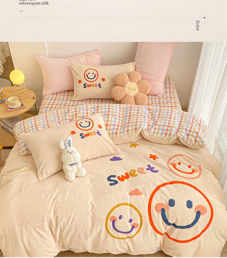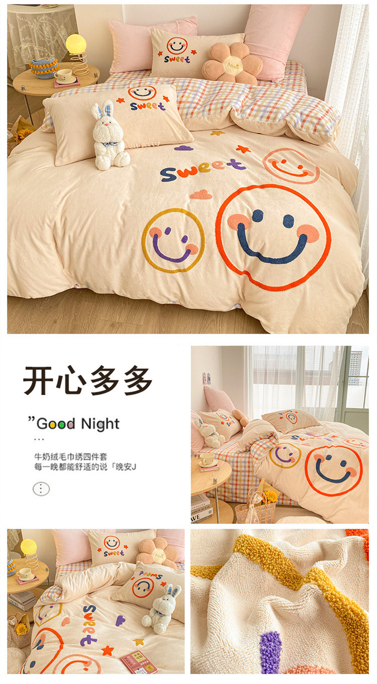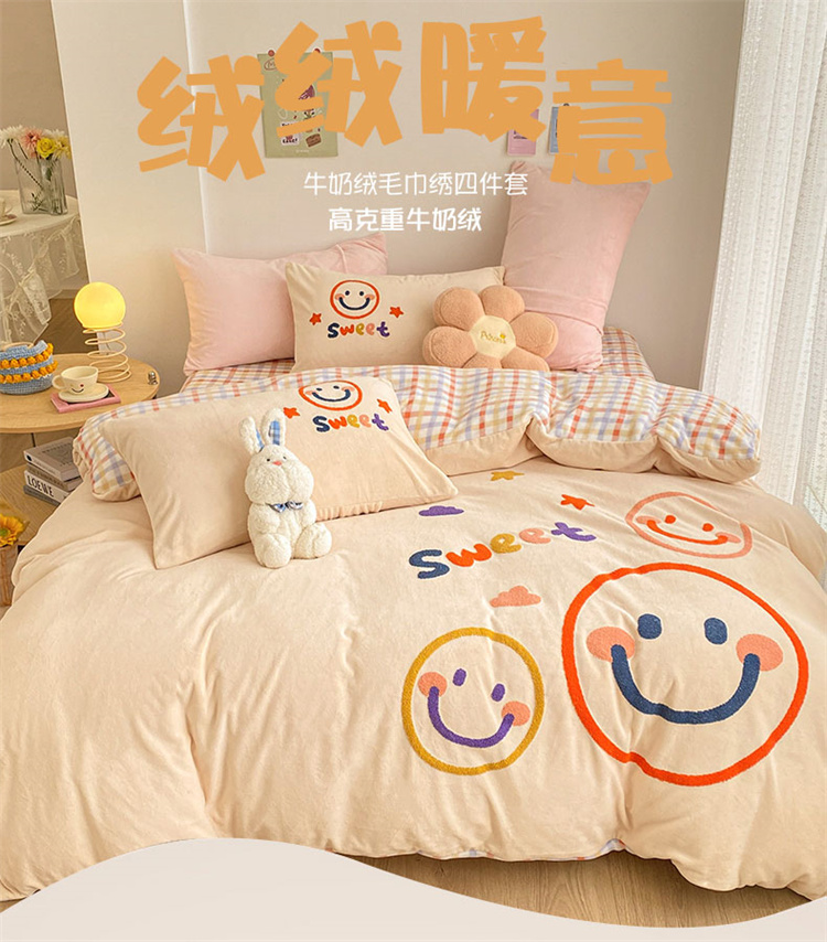 川悦生活 2021新款高克重牛奶绒毛巾绣四件套 开心多多