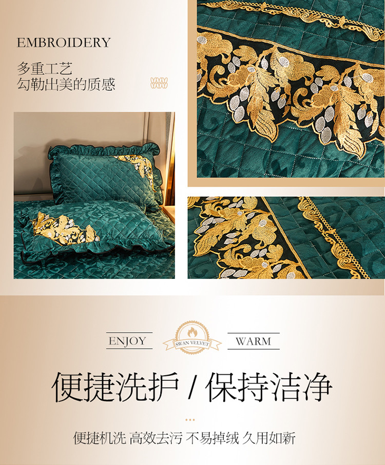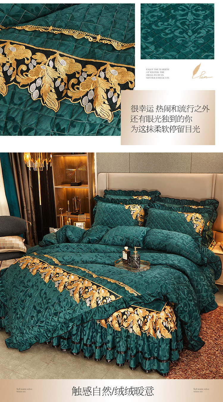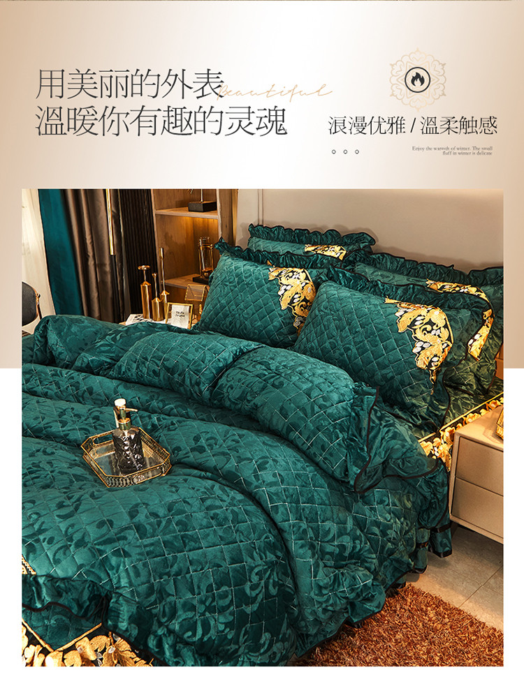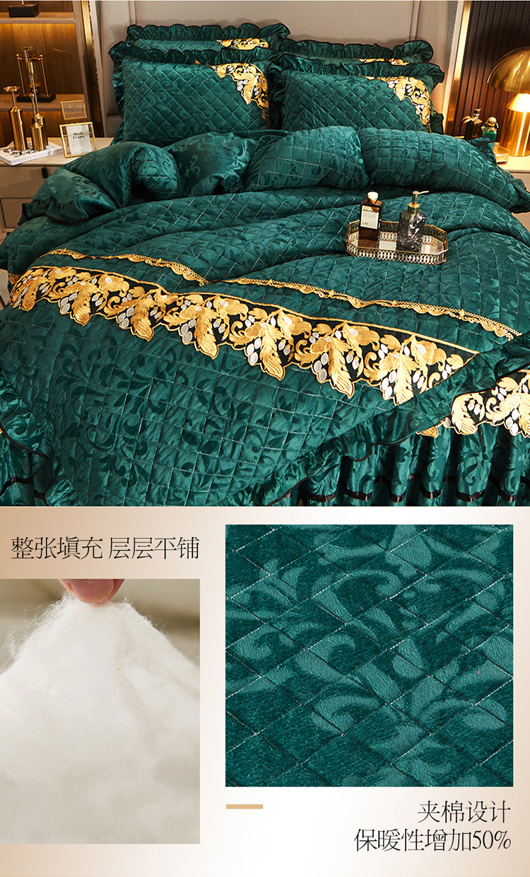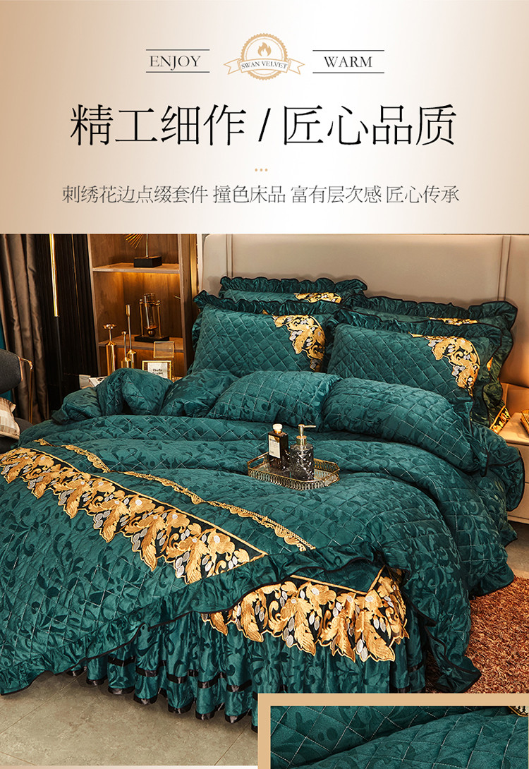 网红馆2025新款天鹅绒夹棉床裙四件套 浅忆拾光-墨绿