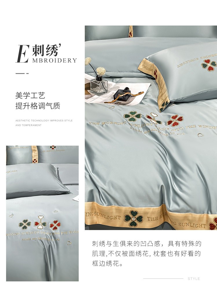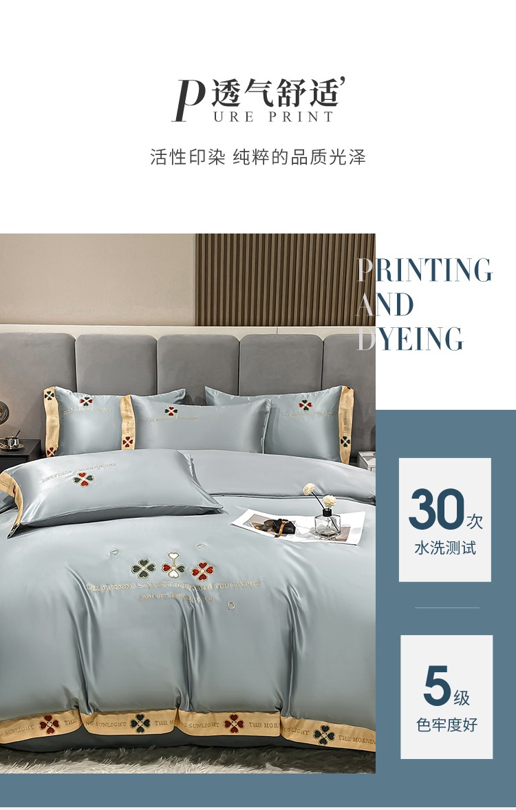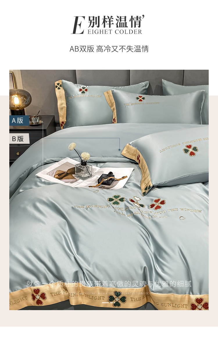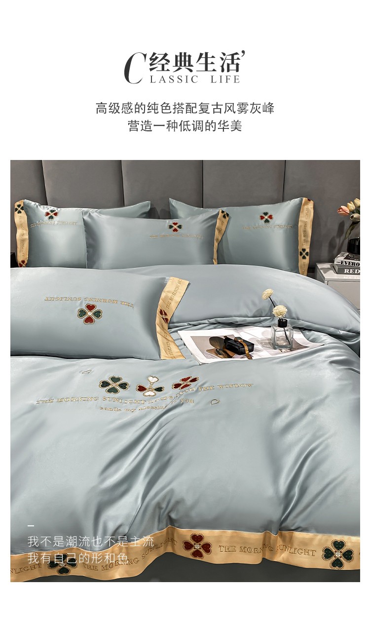 商品名称:2023爆款春夏新款水洗真丝四叶草系列四件套 雾灰峰