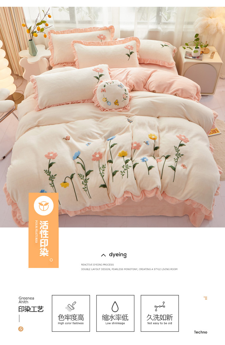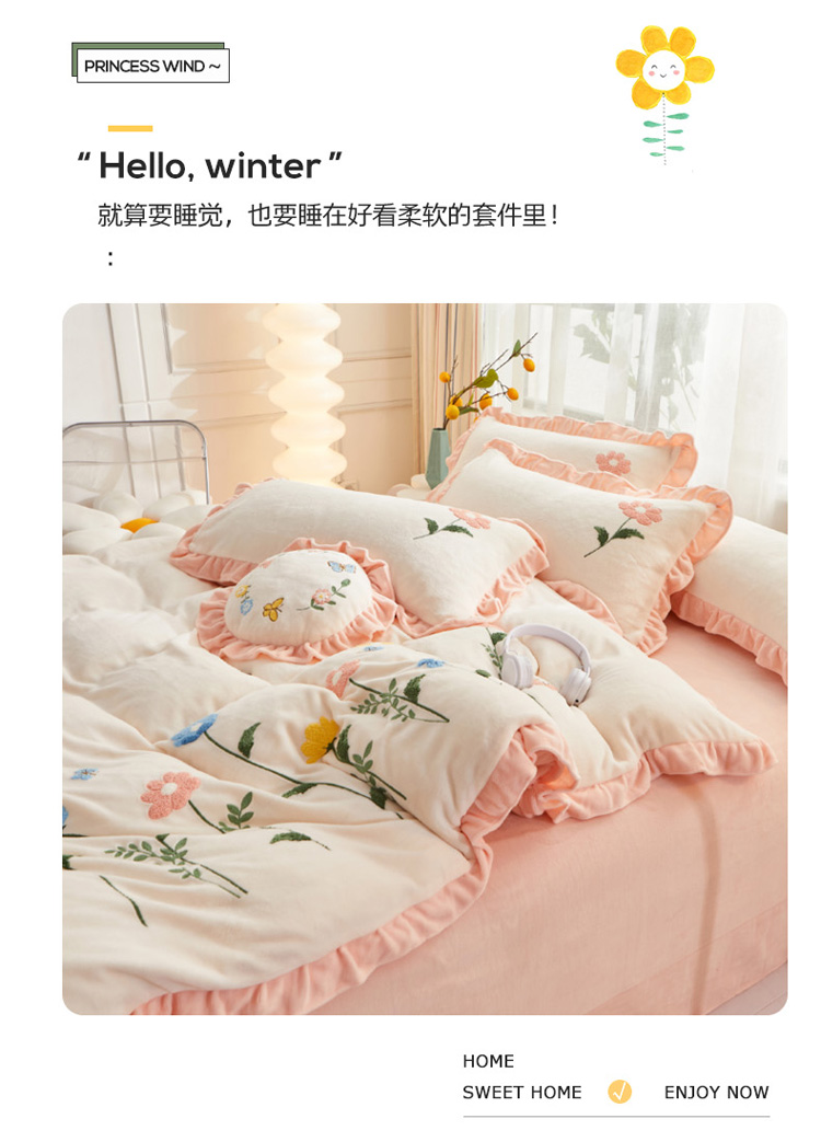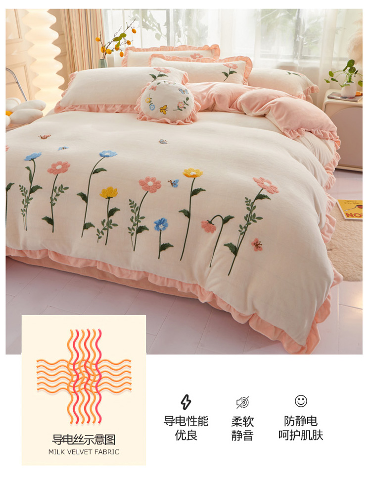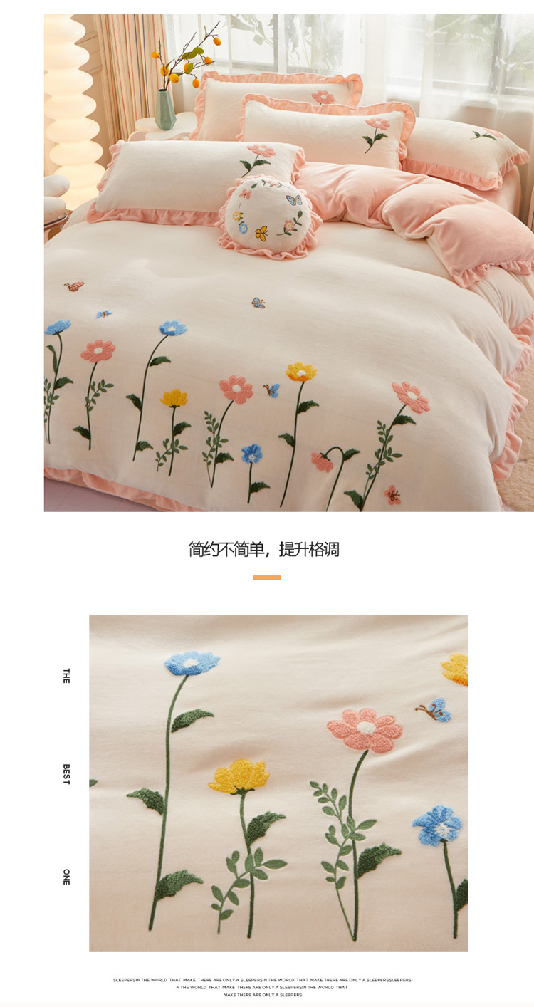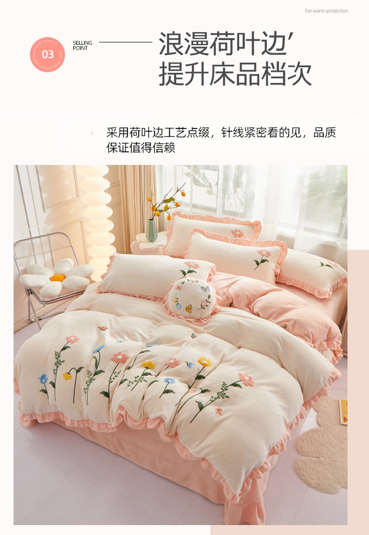商品名称:恋佳 2023新款加厚牛奶绒荷叶边毛巾绣四件套 如花似锦米色