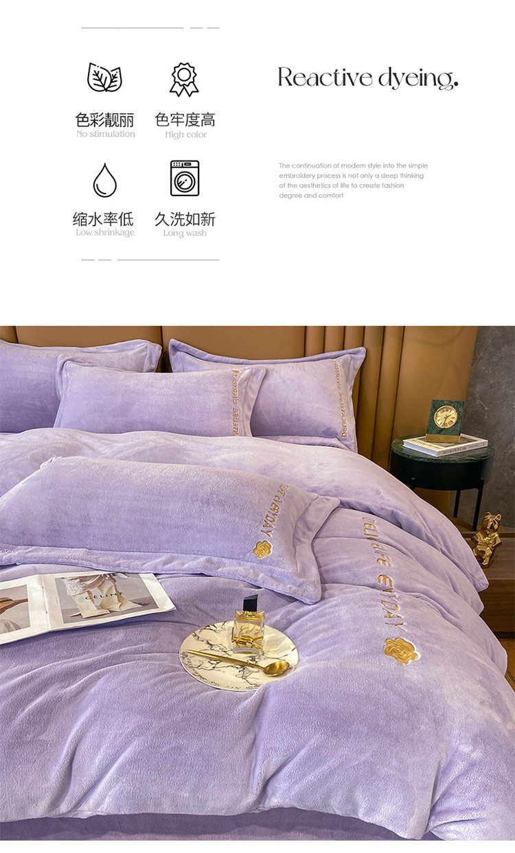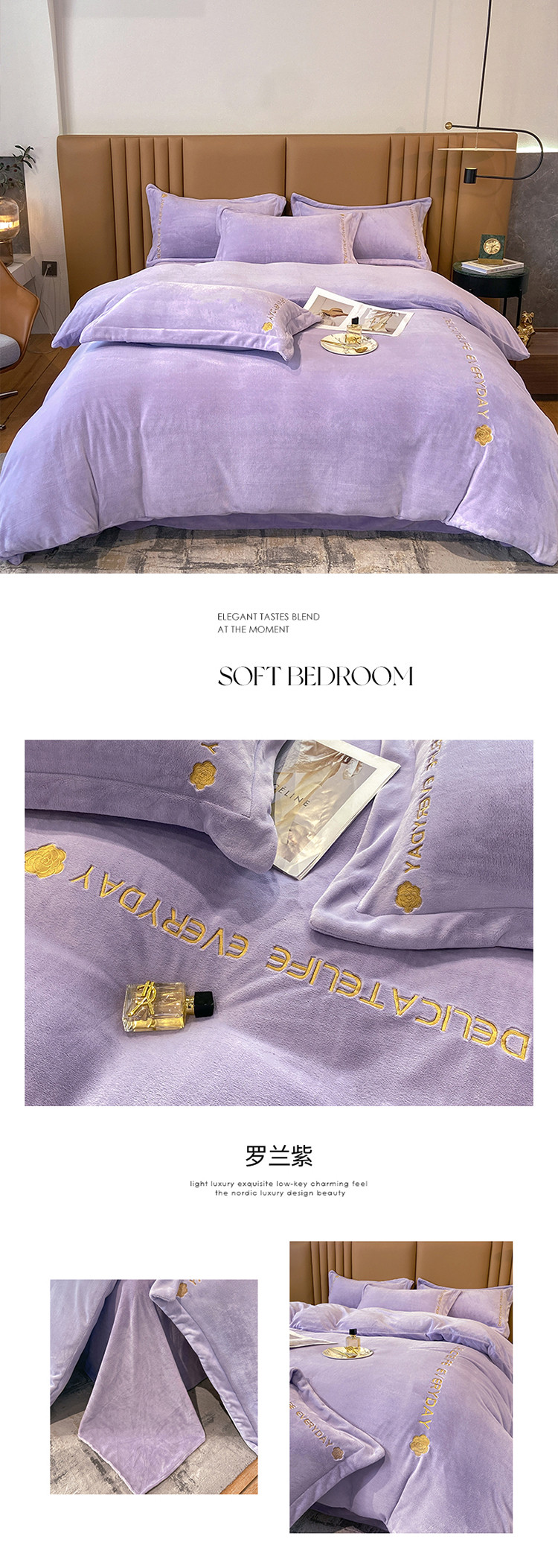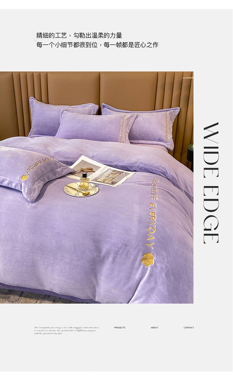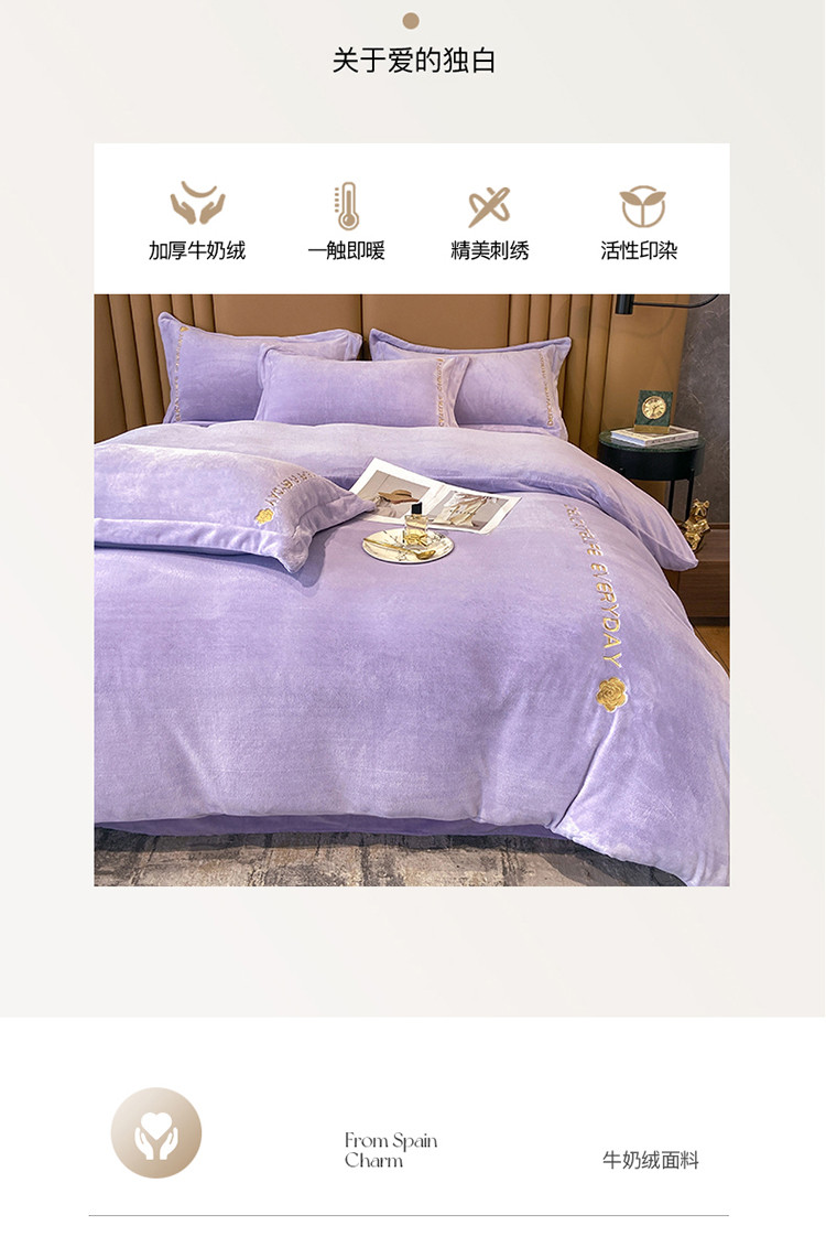 商品名称:绒掌柜 2025新款秋冬加厚纯色刺绣消光级牛奶绒四件套-邂逅系列 邂逅-罗兰紫