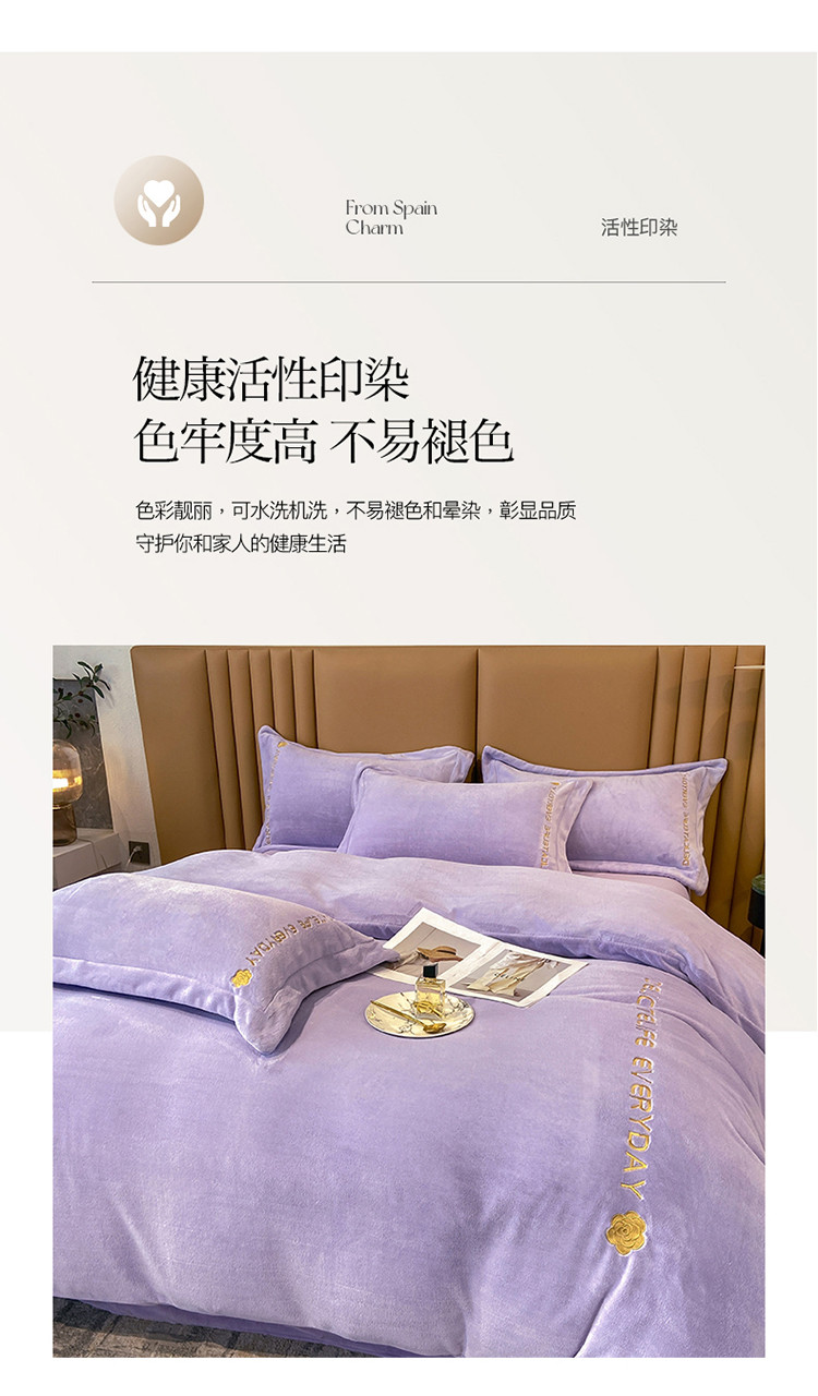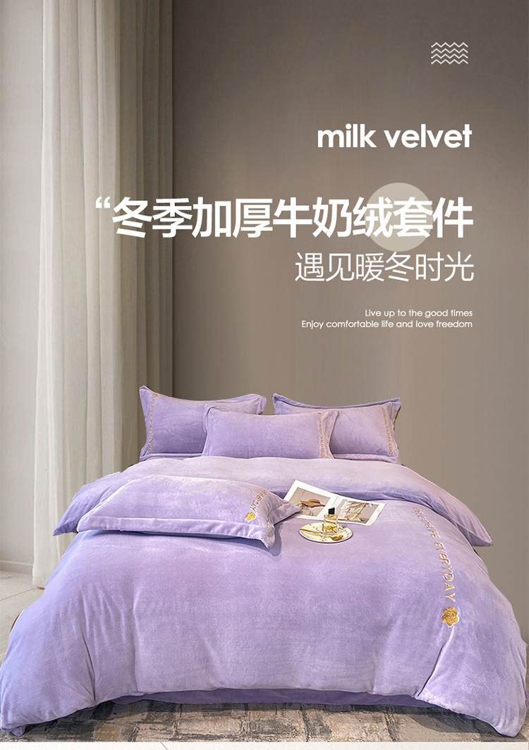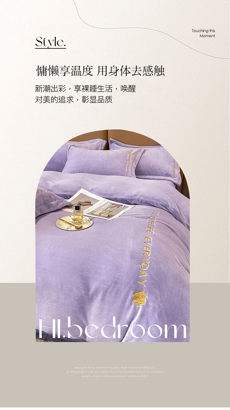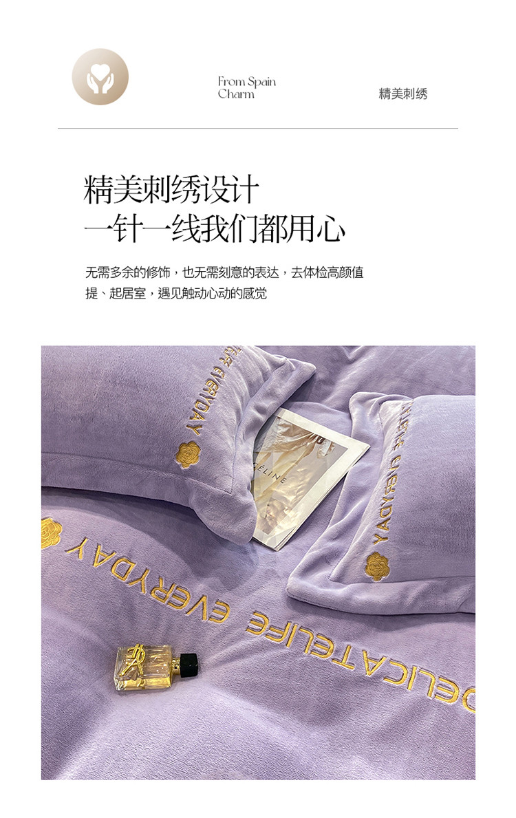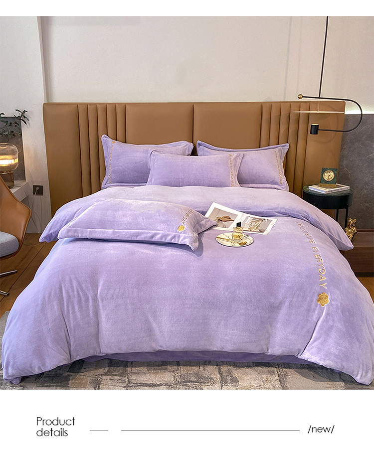 商品名称:绒掌柜 2025新款秋冬加厚纯色刺绣消光级牛奶绒四件套-邂逅系列 邂逅-罗兰紫