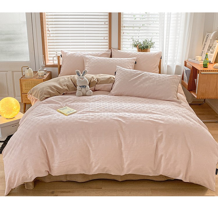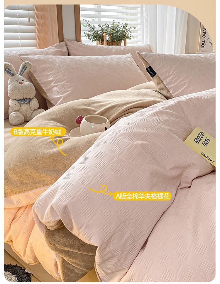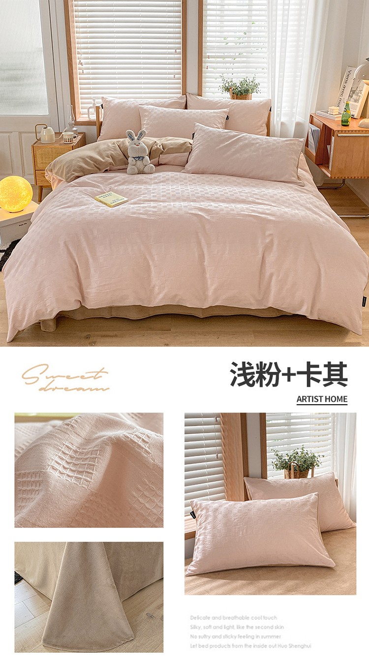 商品名称:蓝米卡夫 2024冬季A类60s华夫格棉绒四件套 浅粉+卡其