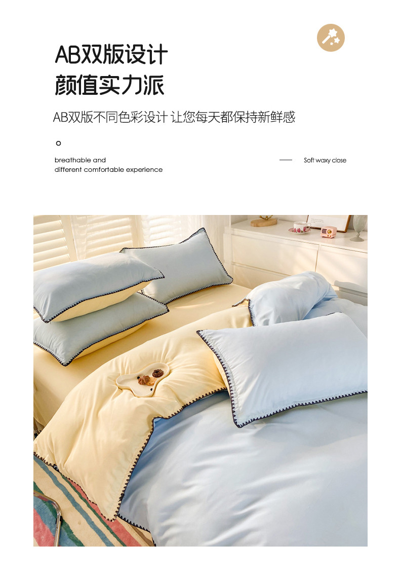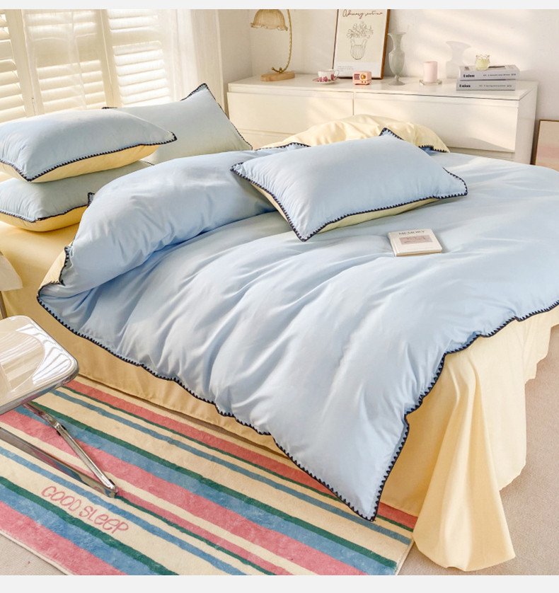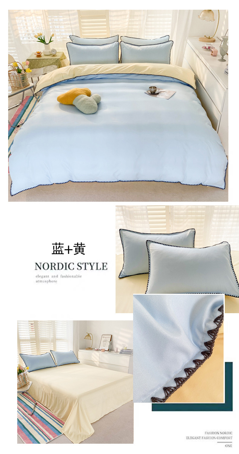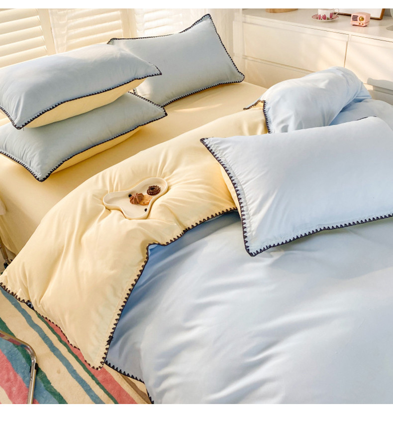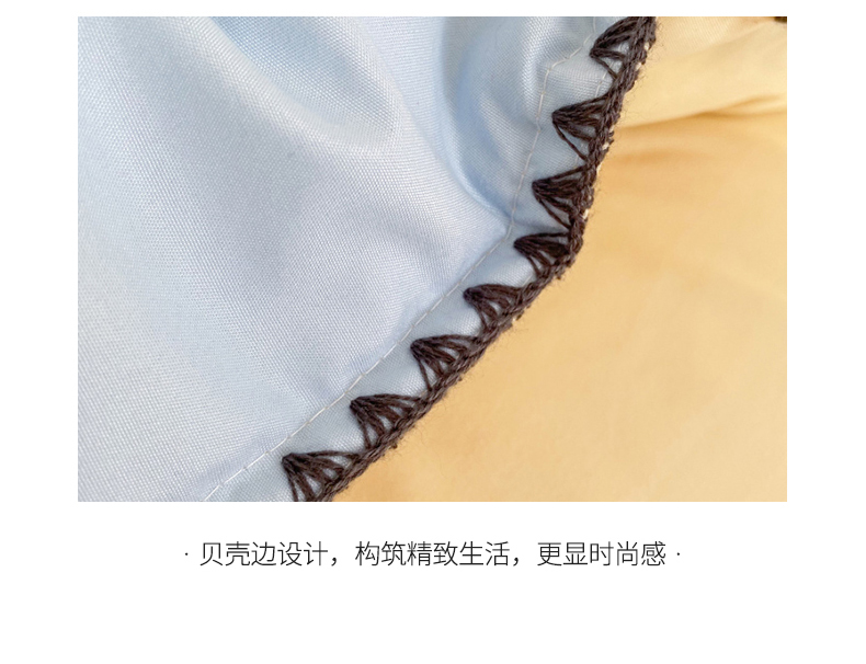 商品名称:妖妖家纺 2023新款水洗棉贝壳边纯色三角针四件套 蓝+黄
