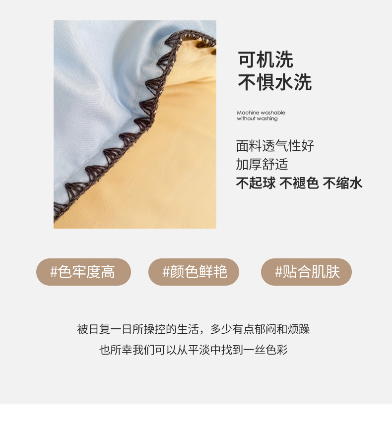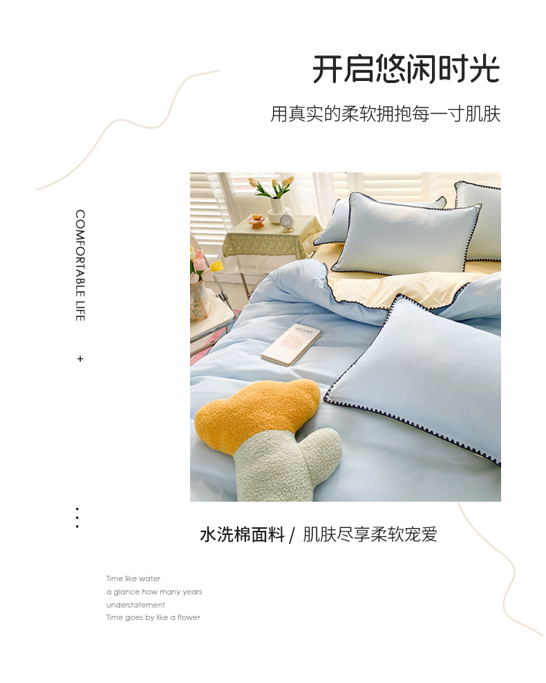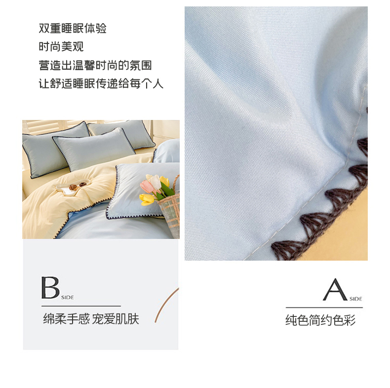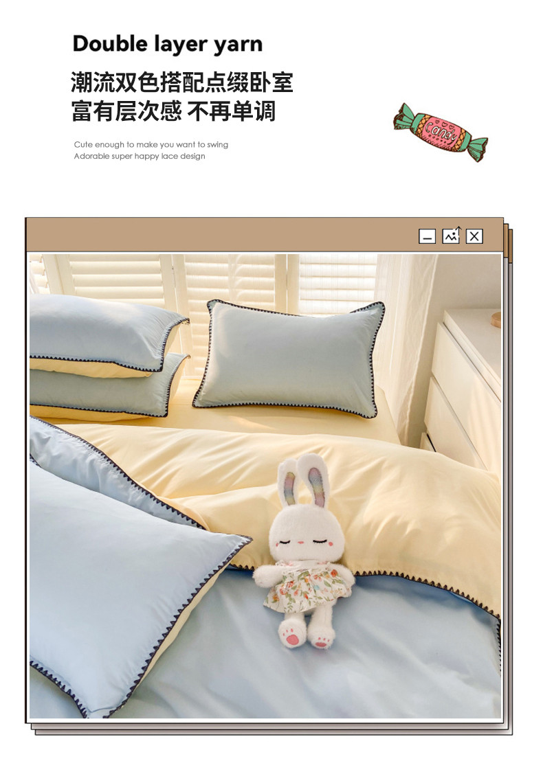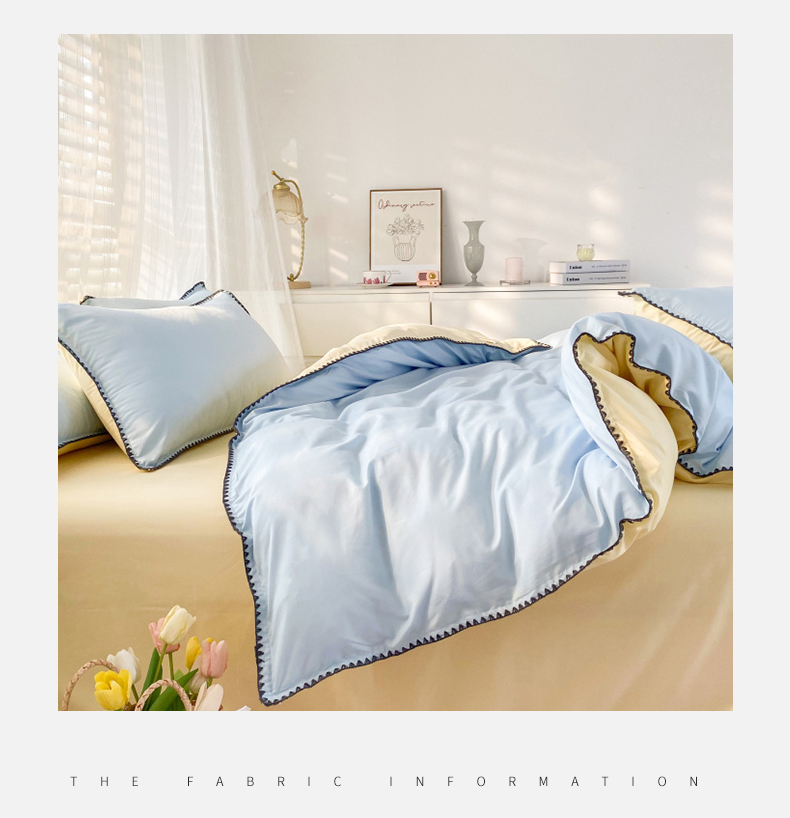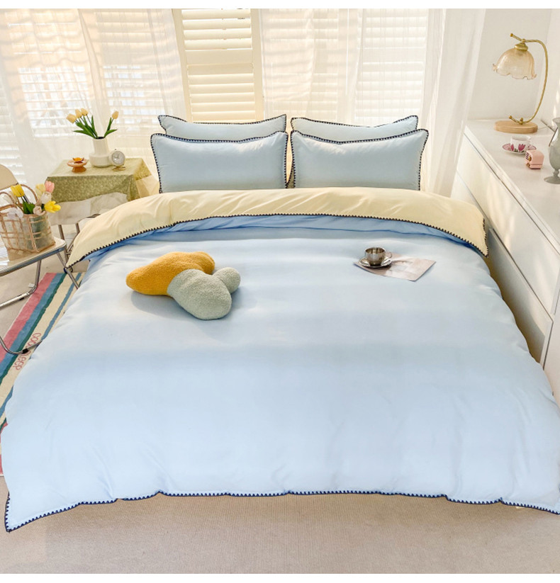 商品名称:妖妖家纺 2023新款水洗棉贝壳边纯色三角针四件套 蓝+黄