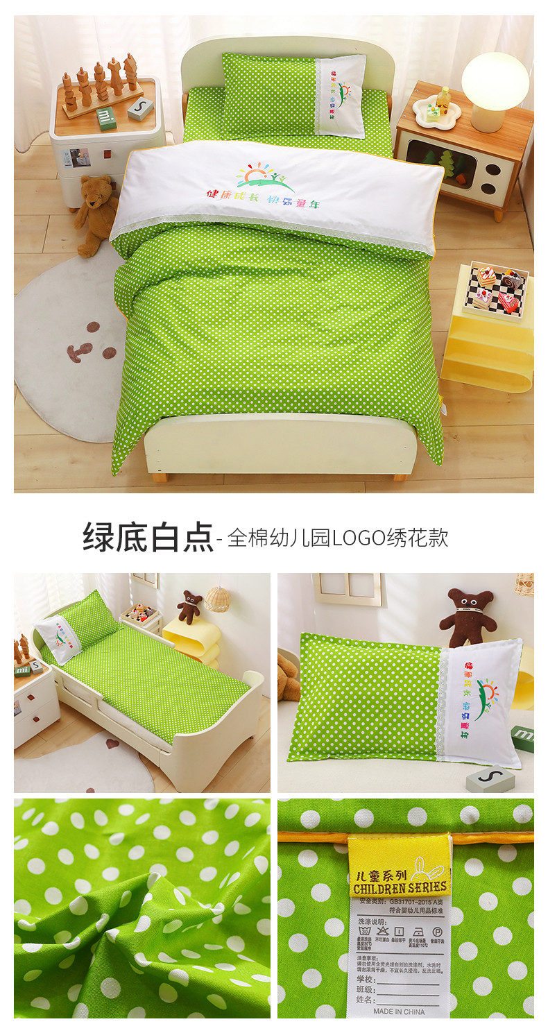 当前位置: 91家纺网 > 商品网购 > 床品套件 > 多件套 > 多件套 > 订做纯色绣花logo纯棉刺绣园标幼儿园被子三件套午睡六件套 绿底白点