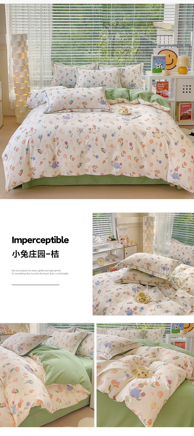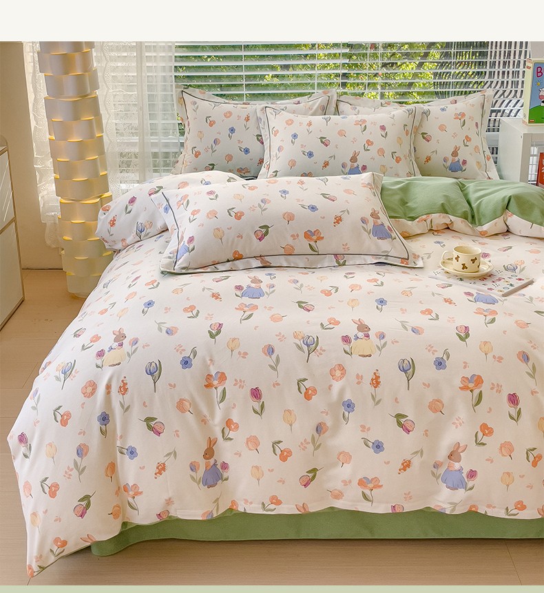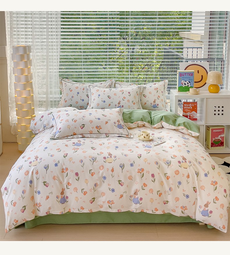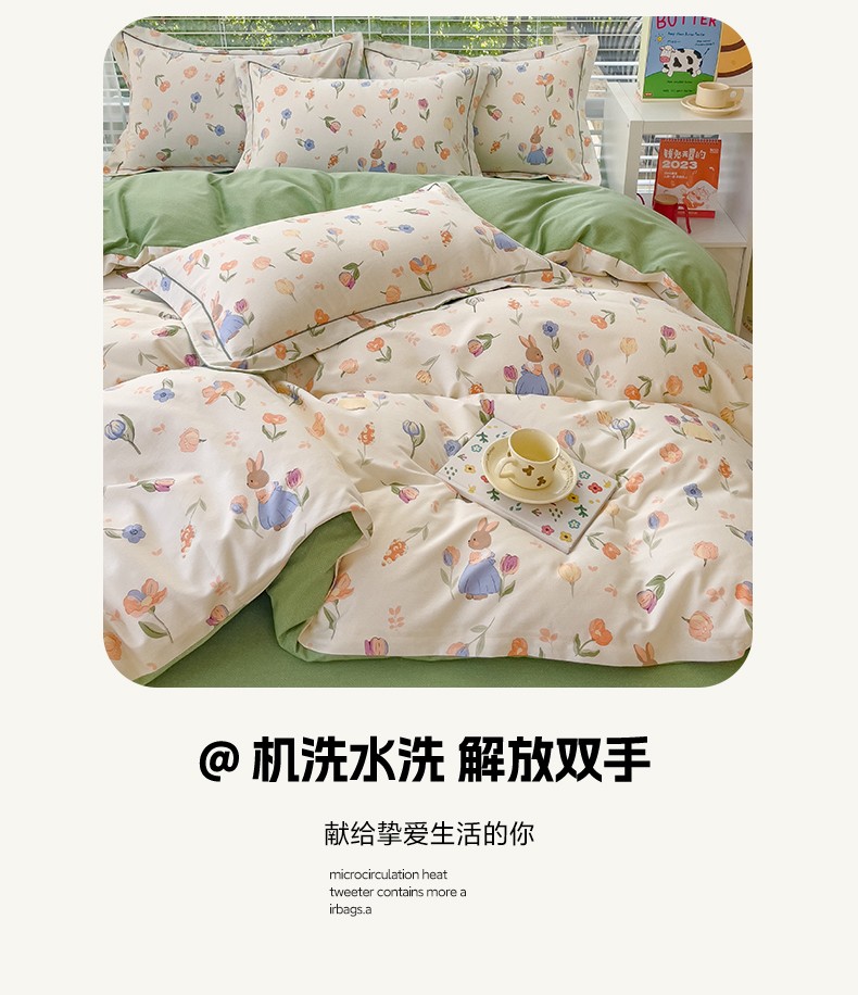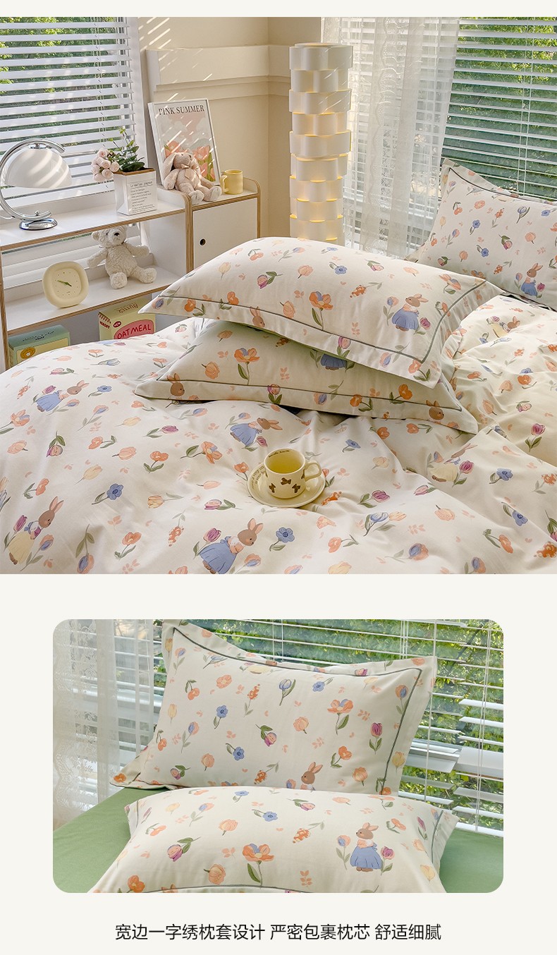 铭浩2025新款纯棉棉加厚磨毛升级喷气面料全棉四件套三件套小兔庄园-桔