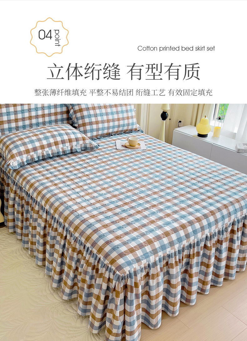 (总)十个点家纺 2025新款千鸟格磨毛绗缝夹棉纯色花边床裙三件套,经典白色,经典兰色,经典浅灰,经典浅驼,经典深灰,经典玉粉