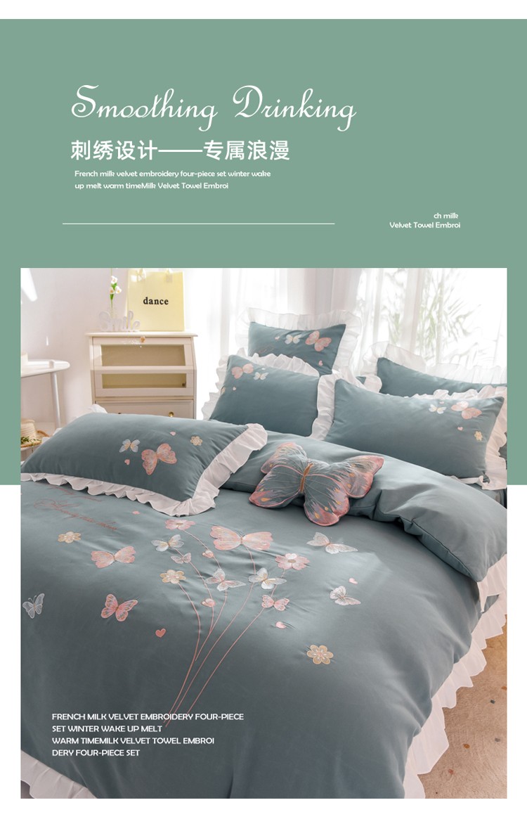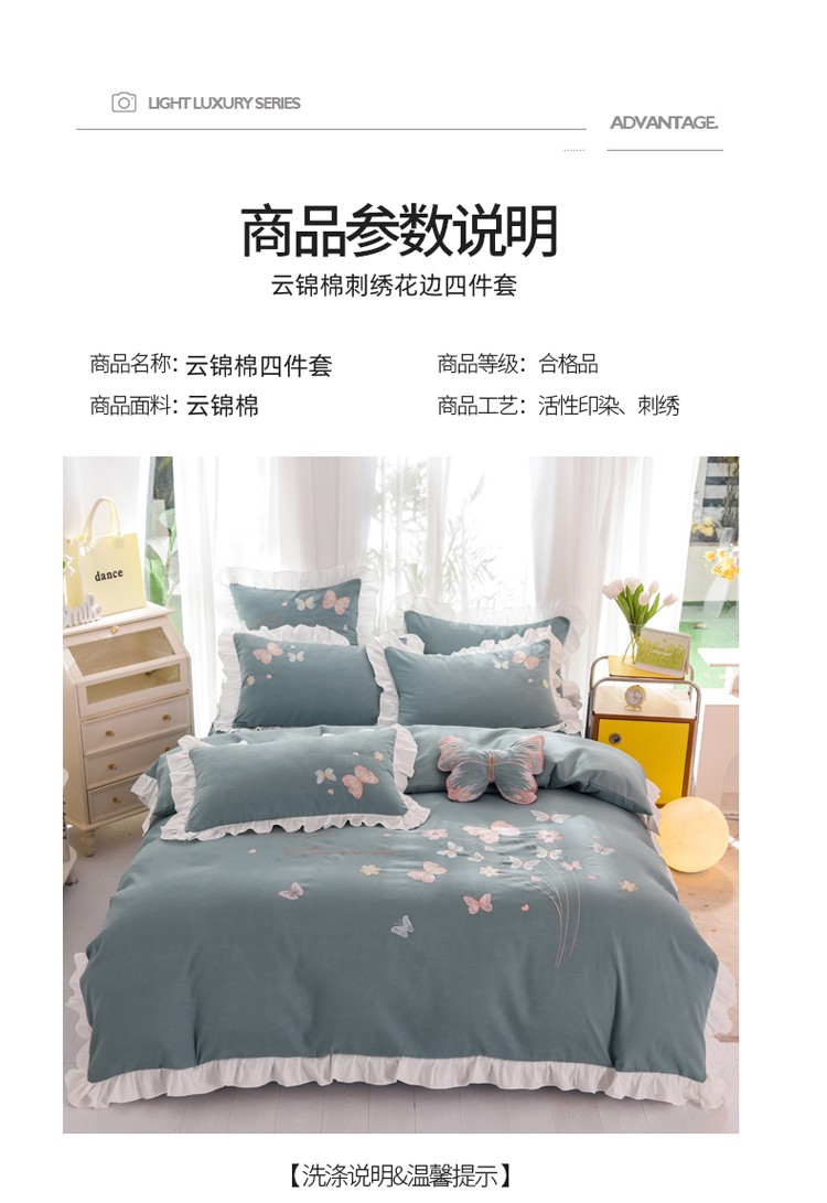 当前位置: 91家纺网 > 商品网购 > 床品套件 > 四件套 > 化纤普通四件套 > 欧冠 2023新款秋冬保暖云锦棉刺绣花边春卉系列四件套 春卉-黛蓝