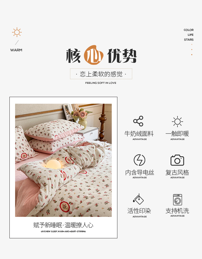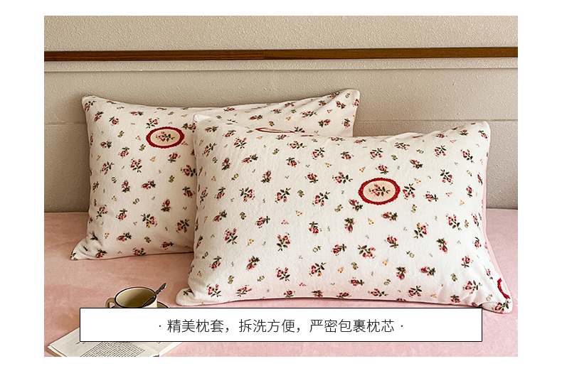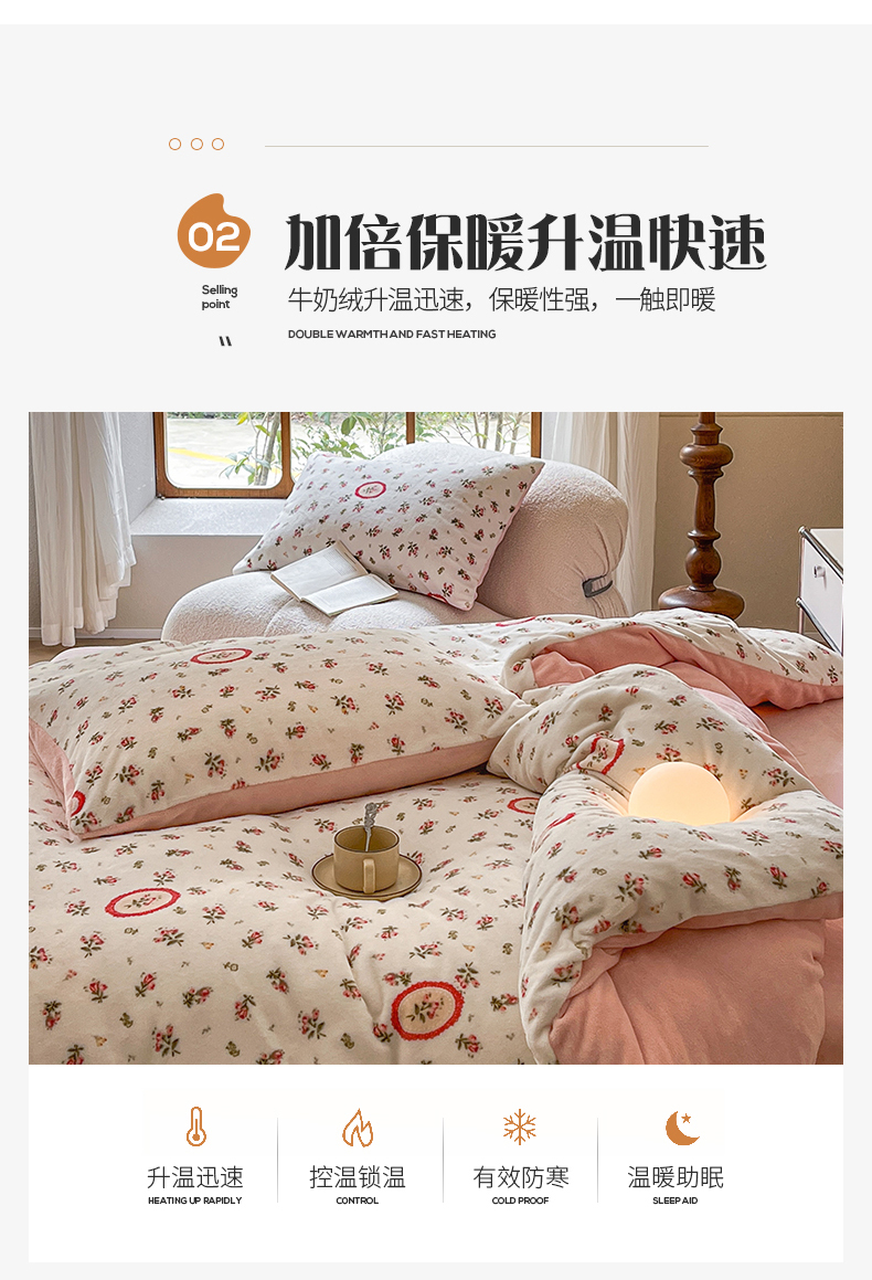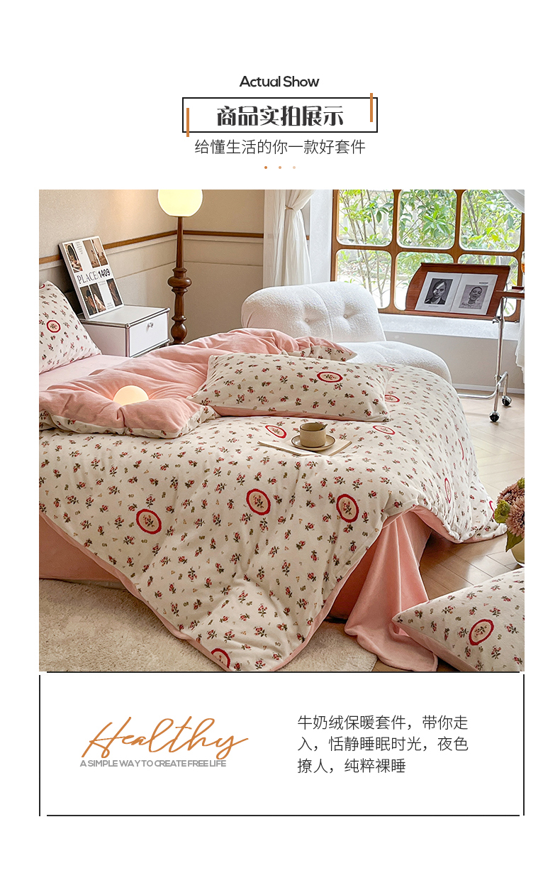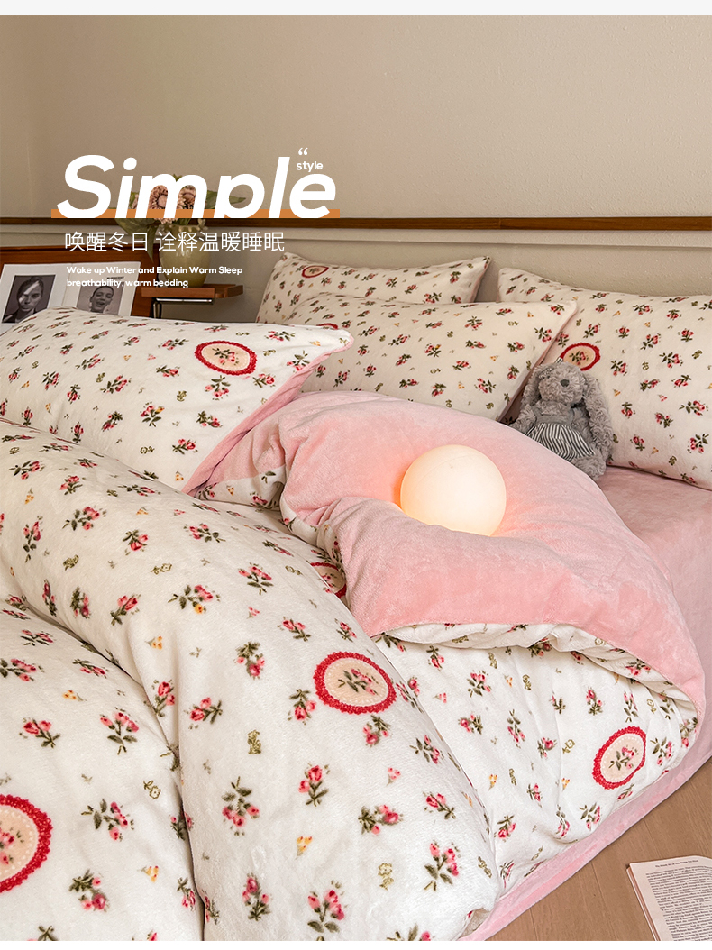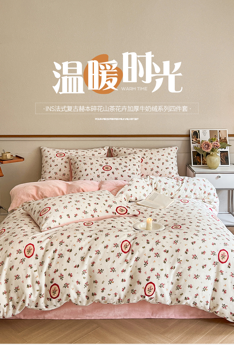 桃子家居 2023新款ins法式复古赫本碎花山茶花卉加厚牛奶绒系列四件套 绒-希娅粉