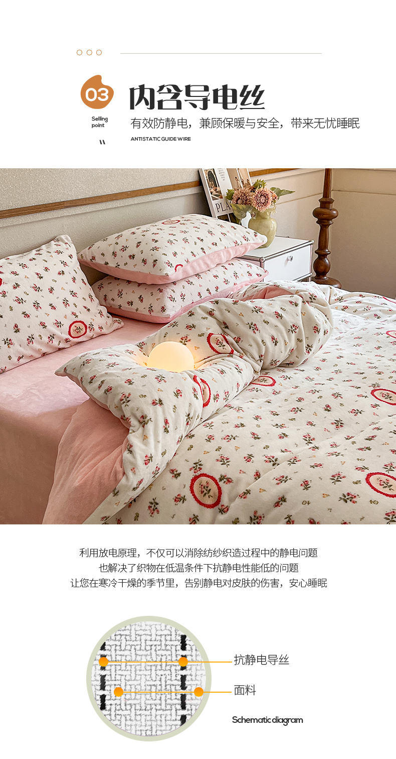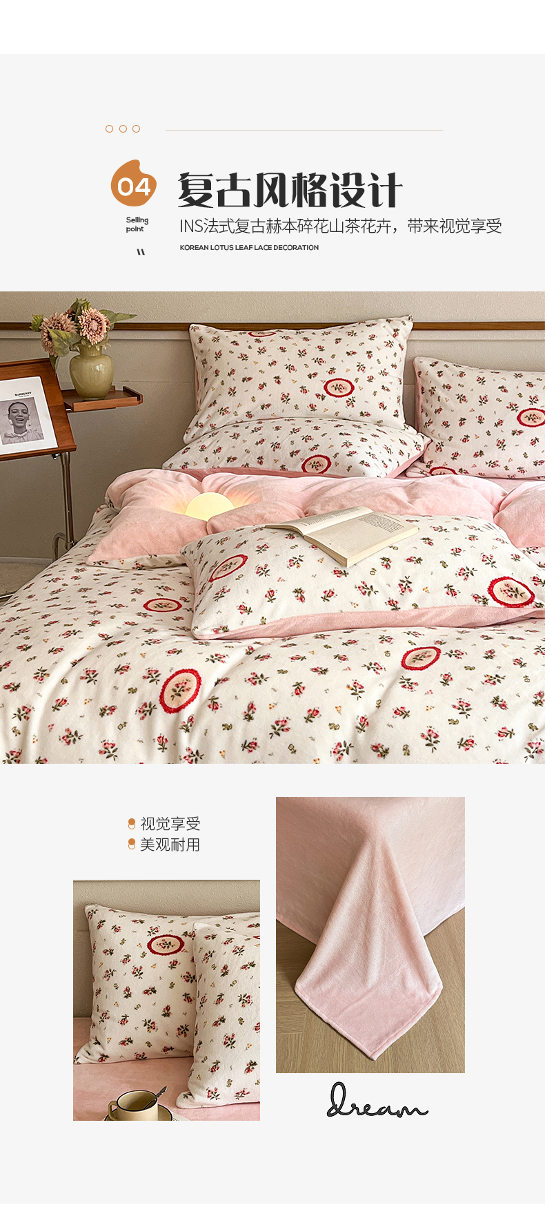 商品名称:桃子家居 2023新款ins法式复古赫本碎花山茶花卉加厚牛奶绒系列四件套 绒-希娅粉