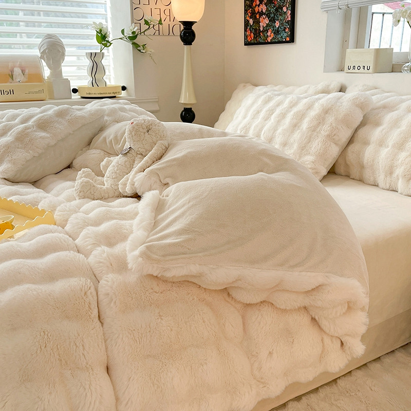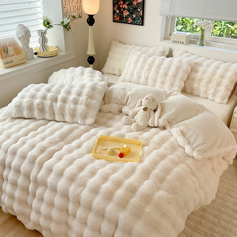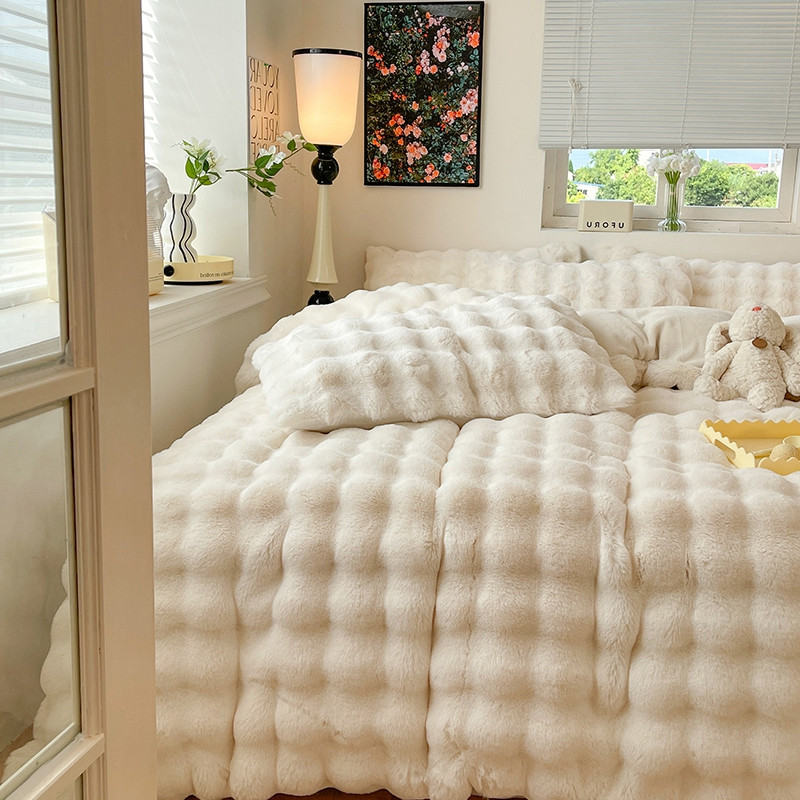 商品名称:满座2025新款580克托卡斯仿皮草大泡泡兔兔绒牛奶绒四件套 奶白