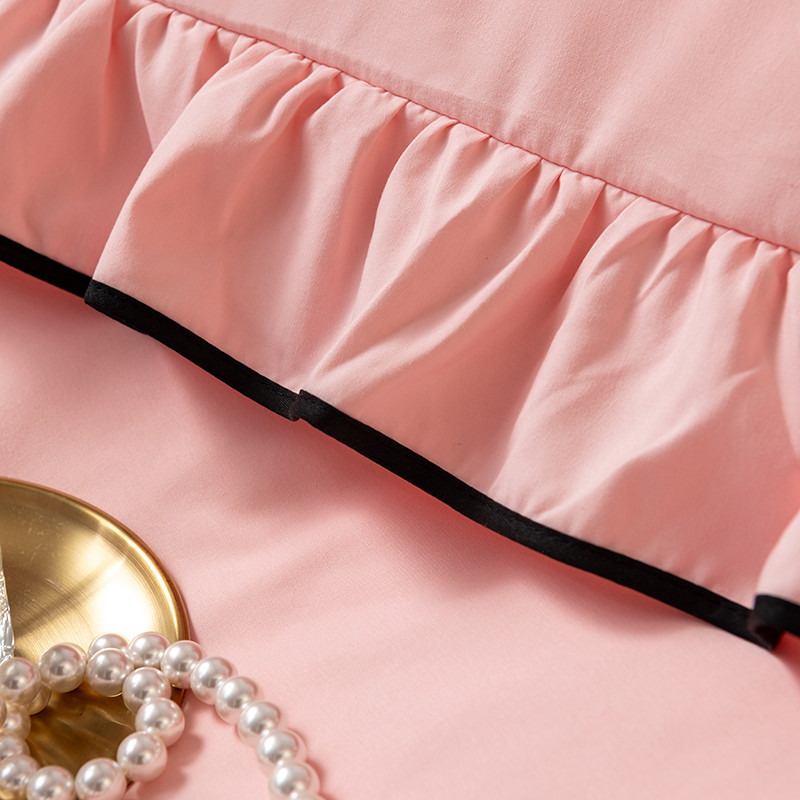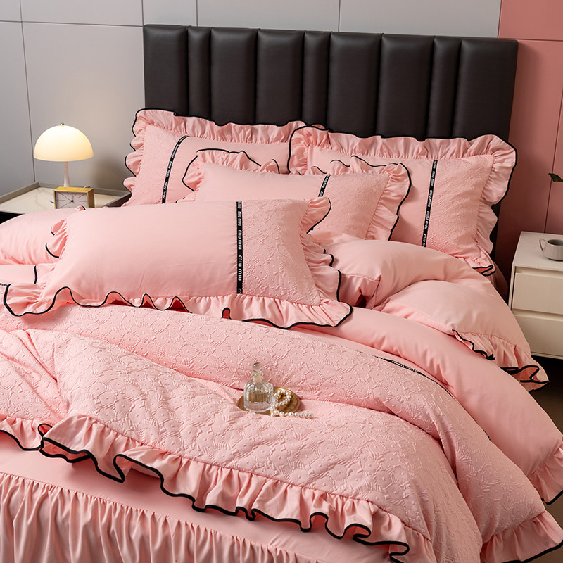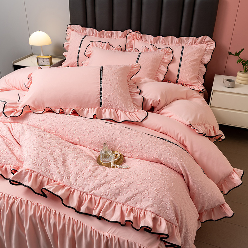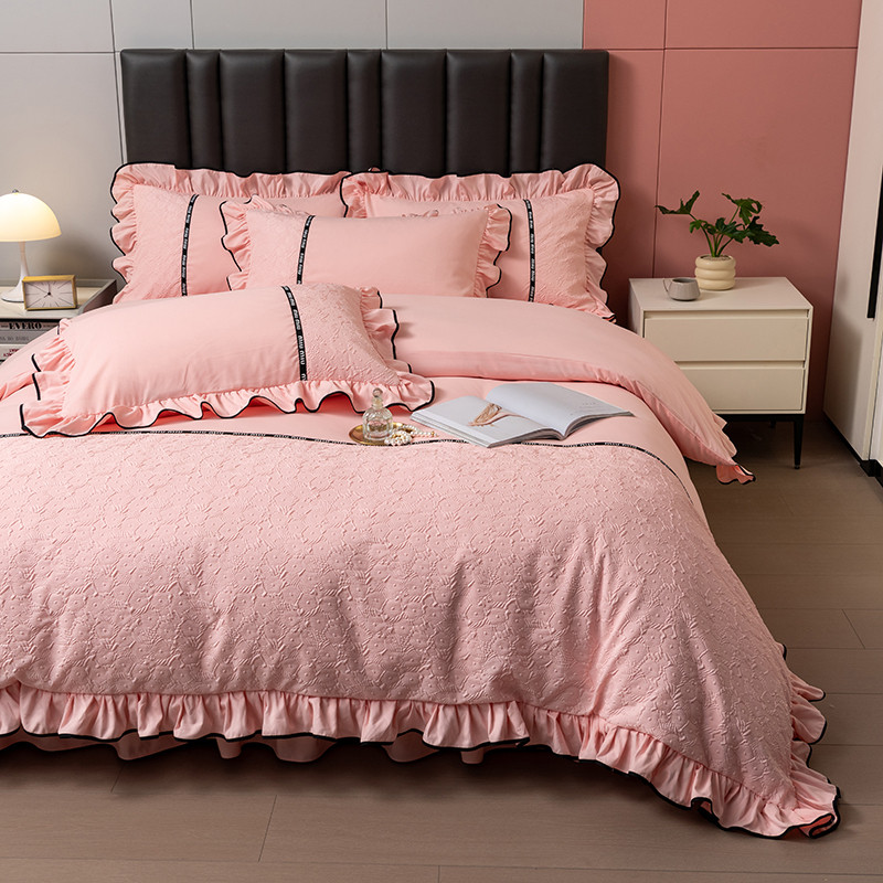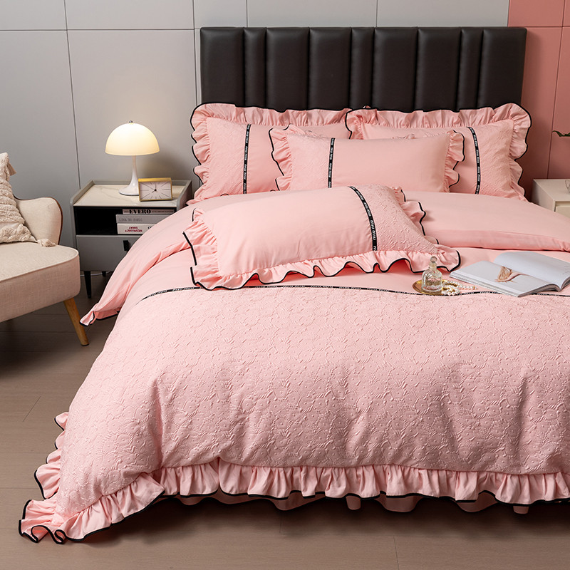 当前位置: 91家纺网 > 商品网购 > 床品套件 > 四件套 > 全棉普通四件套 > 乐卧家居 2026新款时尚压花撞色织带荷叶边四件套-丽可-粉
