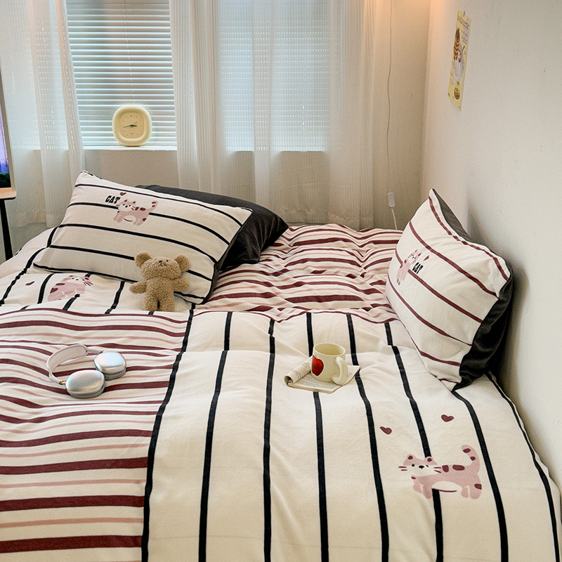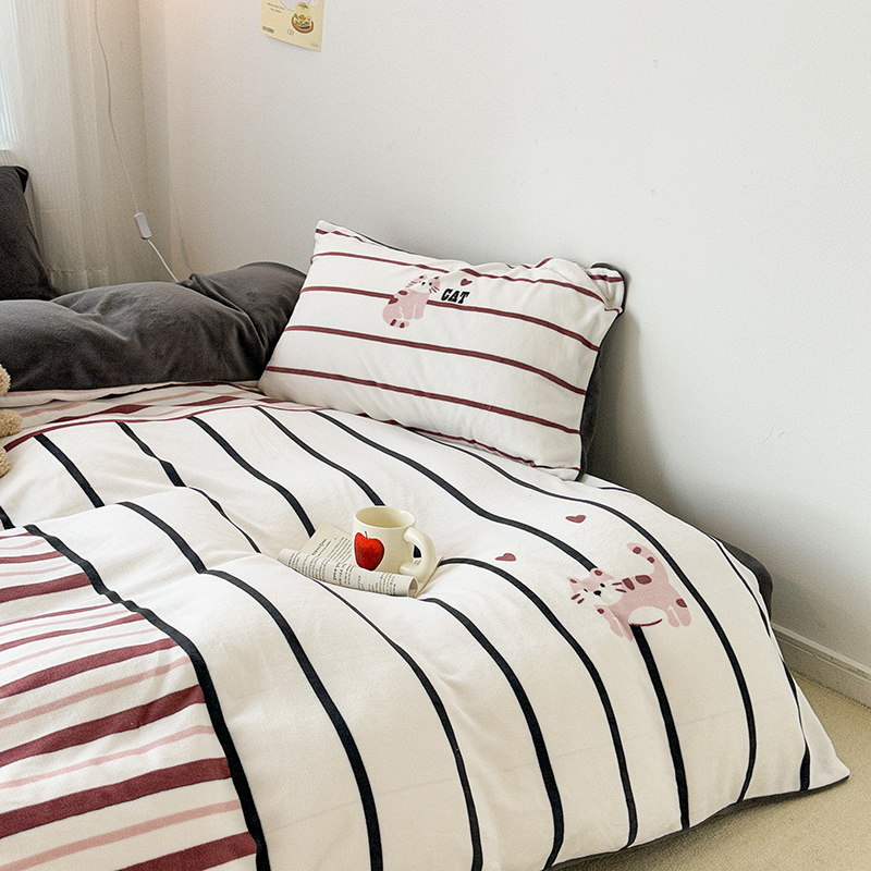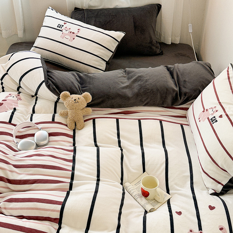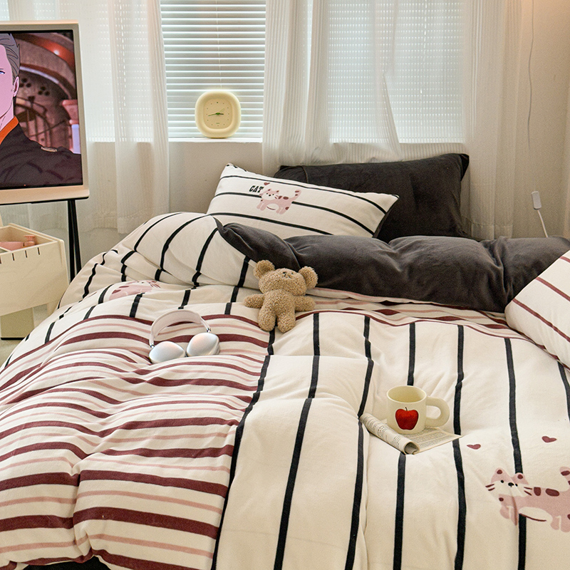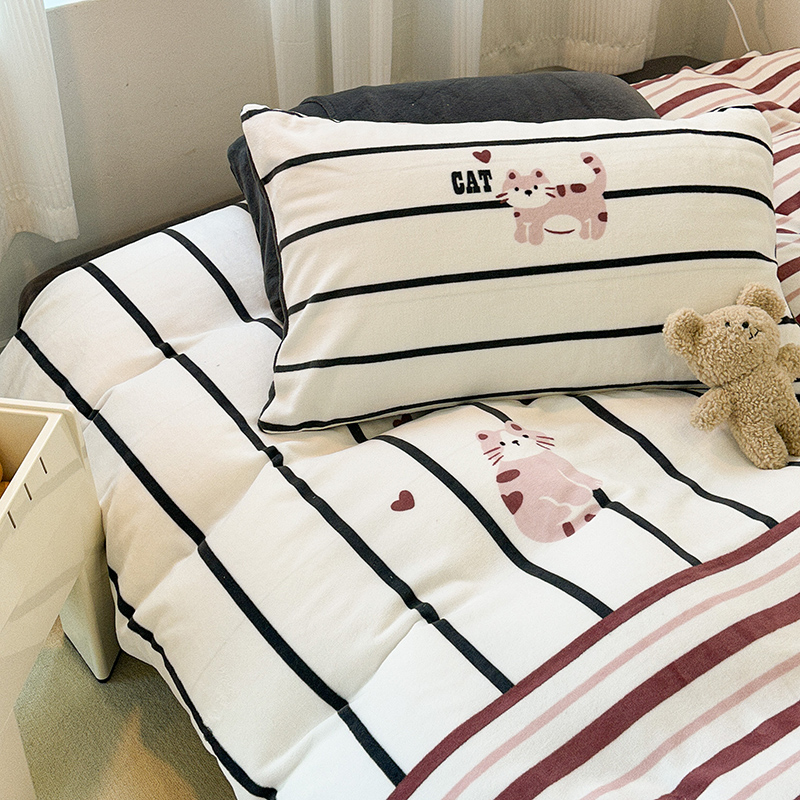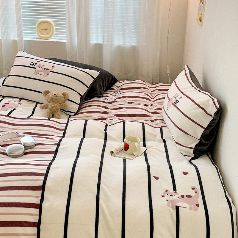 商品名称:昔可家纺 2023新款大版数码印花保暖牛奶绒四件套 拼接条纹爱心猫