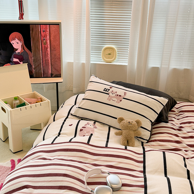 昔可家纺 2023新款大版数码印花保暖牛奶绒四件套 拼接条纹爱心猫