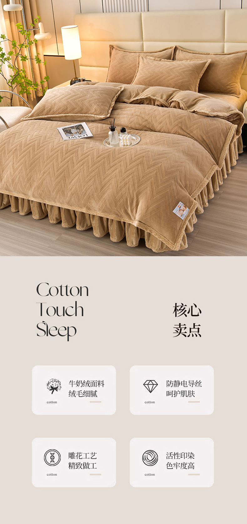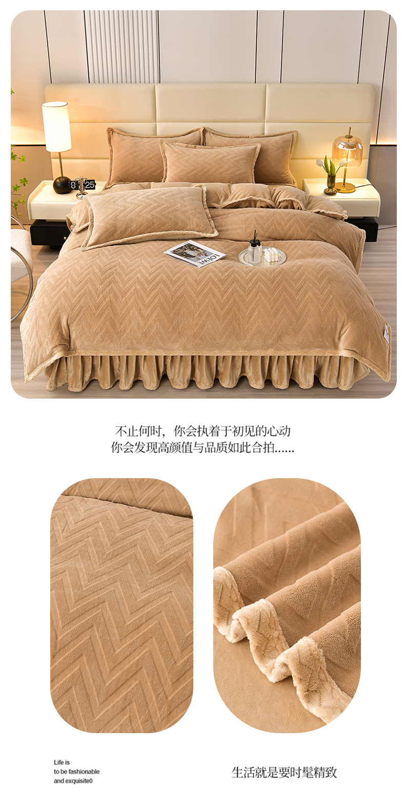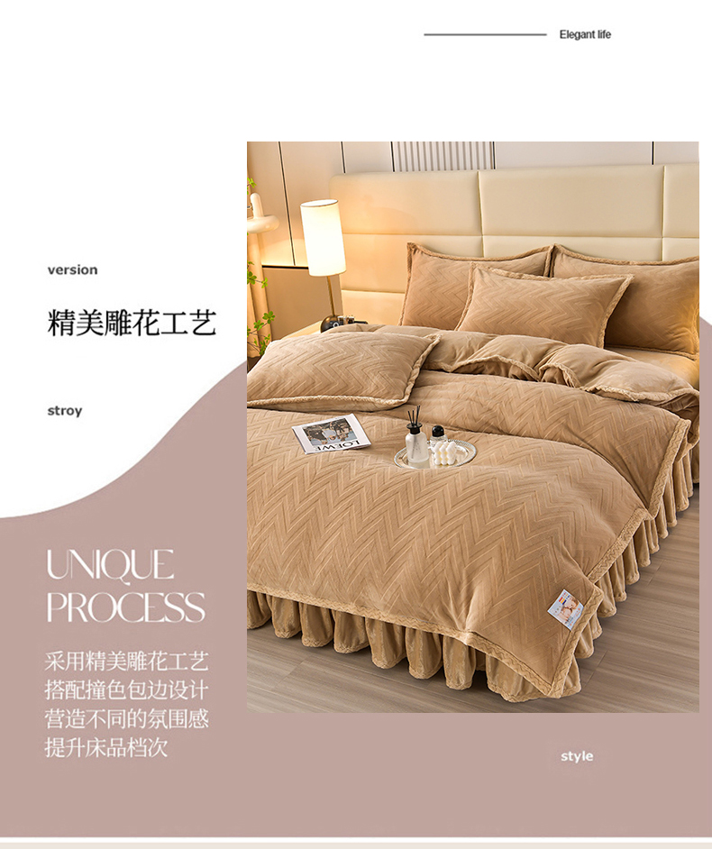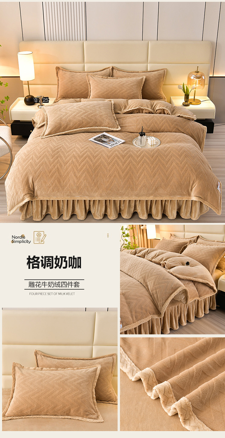 星窝家纺 2023直播电商爆款高克重9斤加厚雕花绒牛奶绒四件套 格调奶咖
