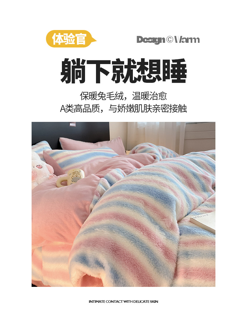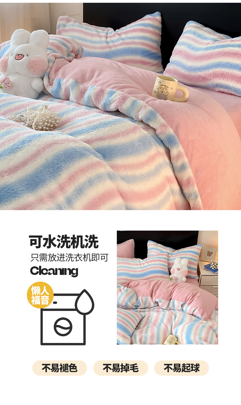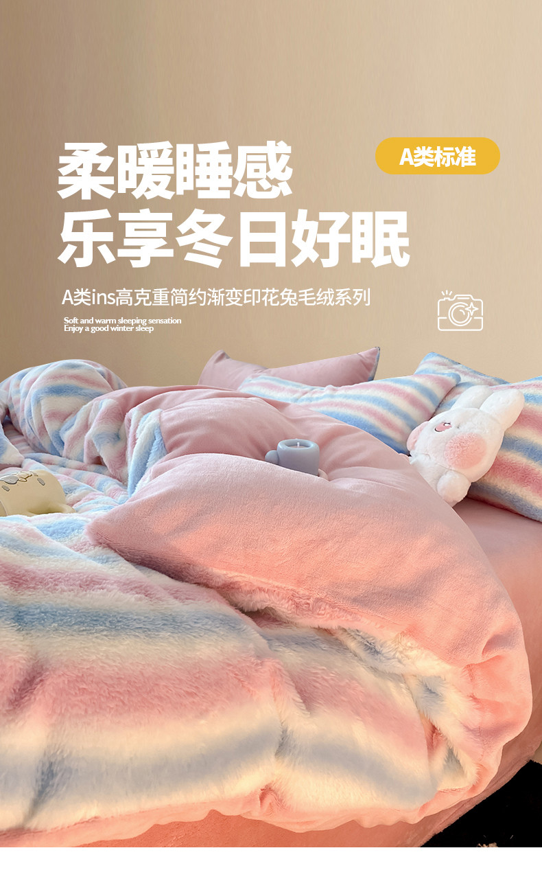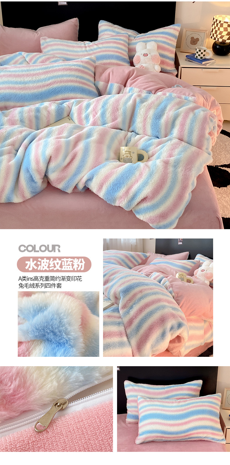 A类ins高克重320克简约渐变印花兔毛绒暖绒加厚牛奶绒系列四件套 绒兔毛-水波纹蓝粉