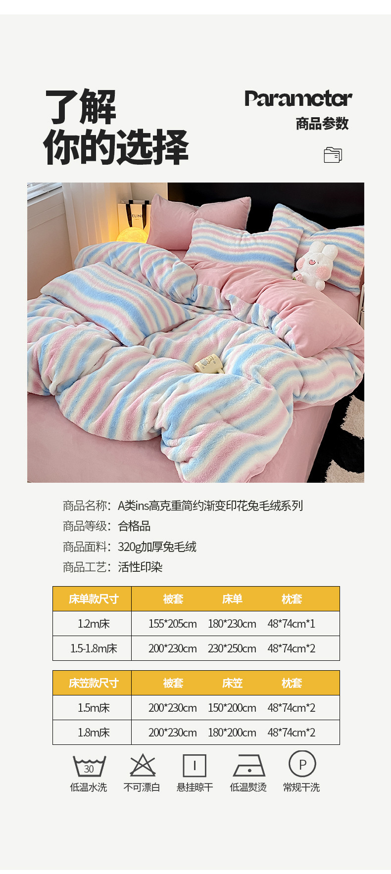 商品名称:A类ins高克重320克简约渐变印花兔毛绒暖绒加厚牛奶绒系列四件套 绒兔毛-水波纹蓝粉