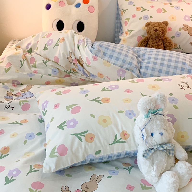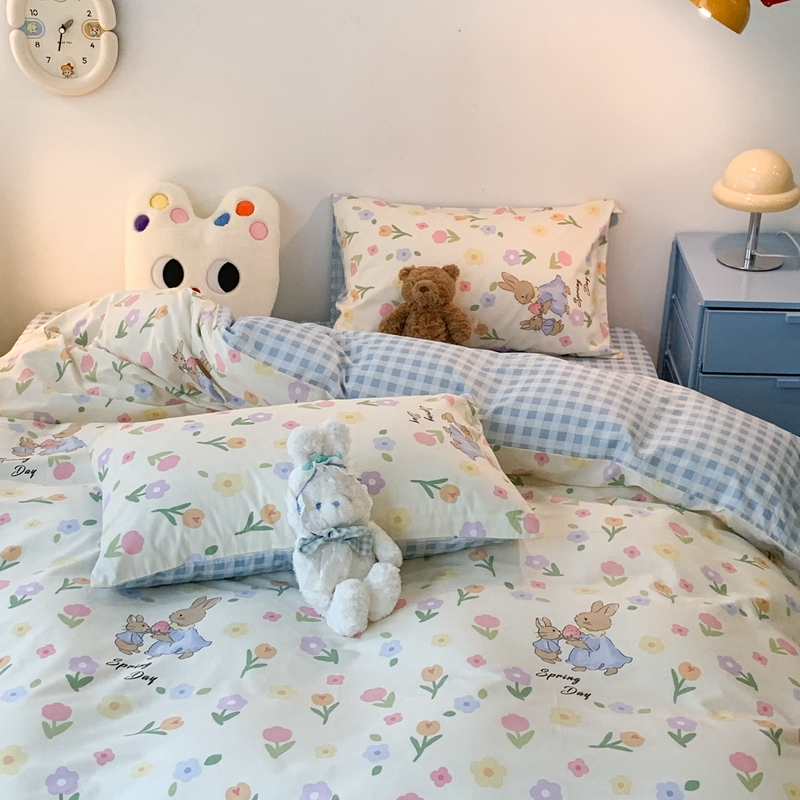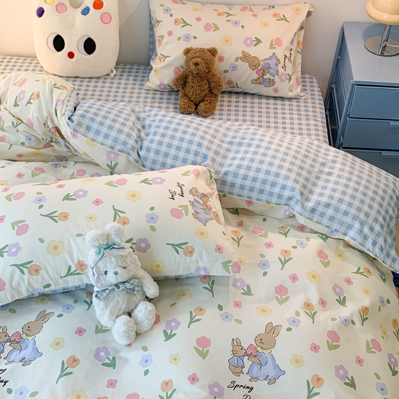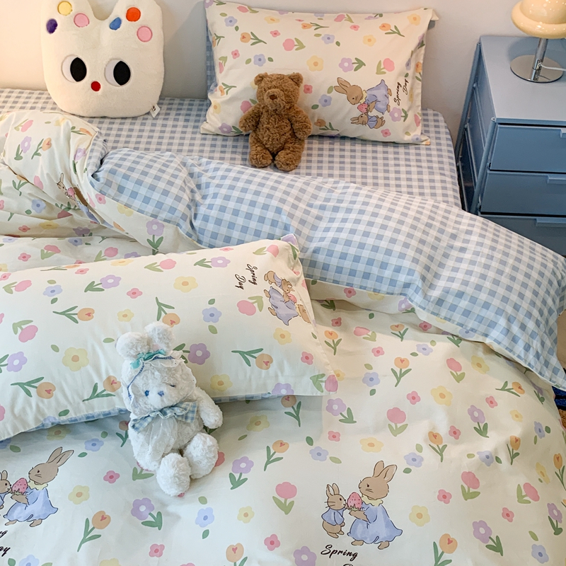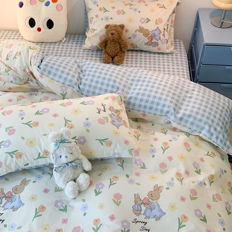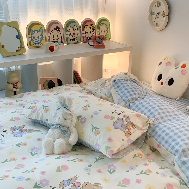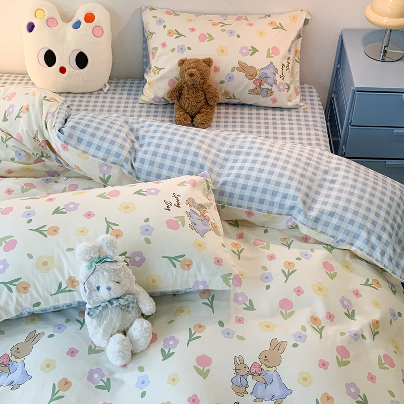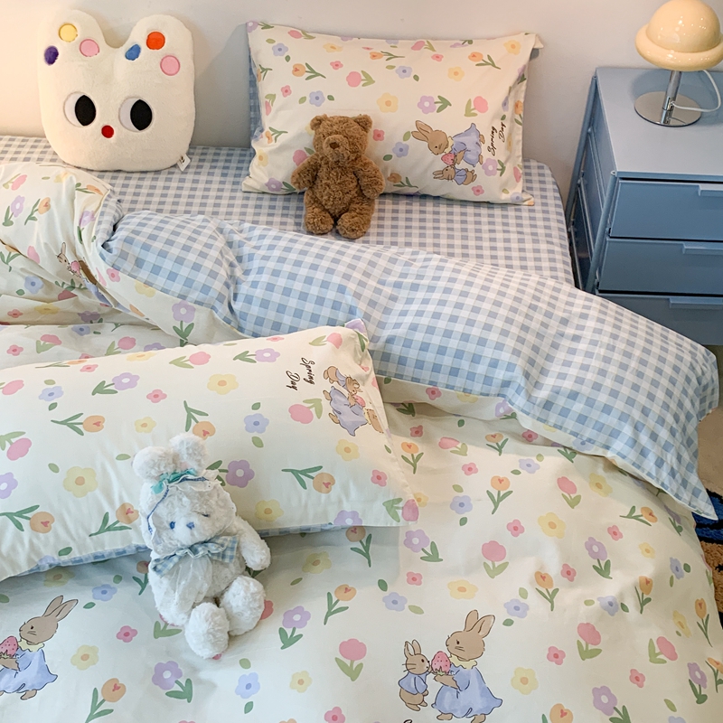 昔可家纺 2023新款全棉四件套-ins卡通系列 蓝格花兔兔