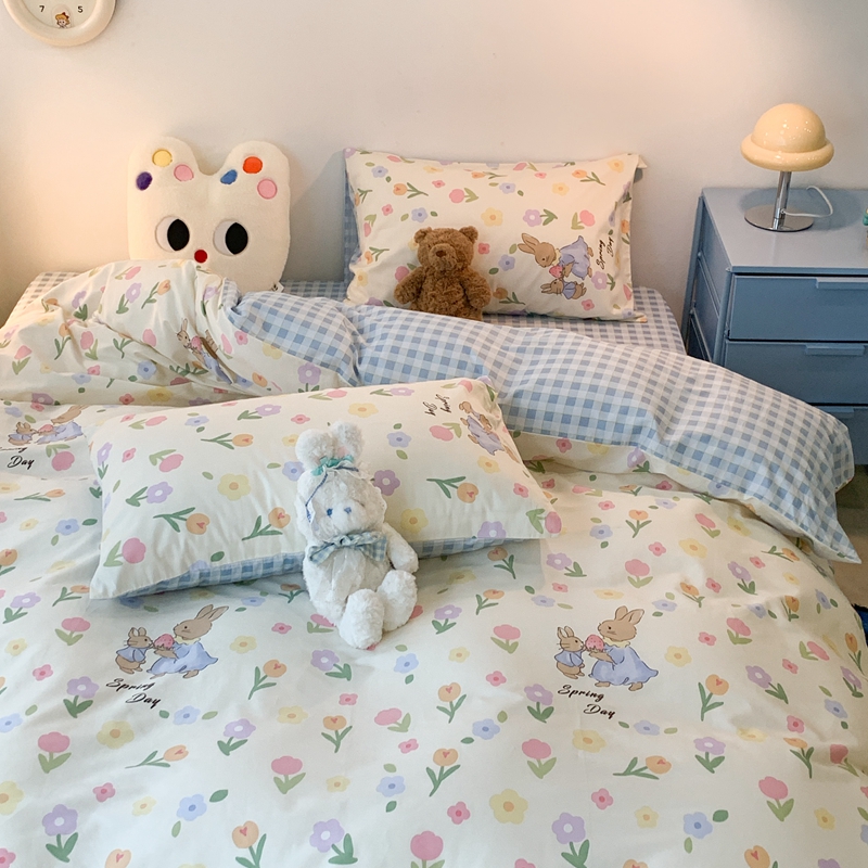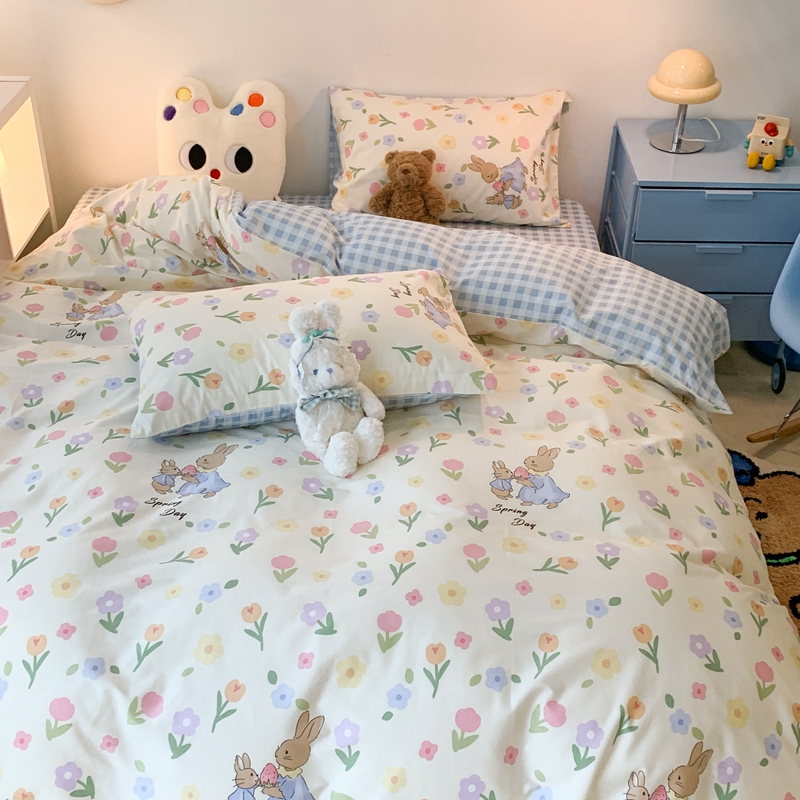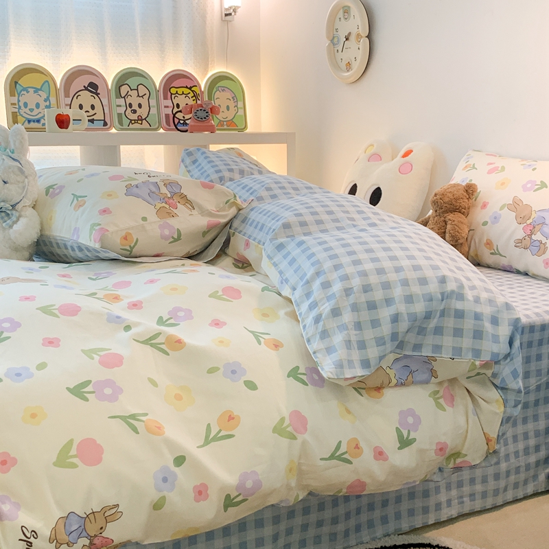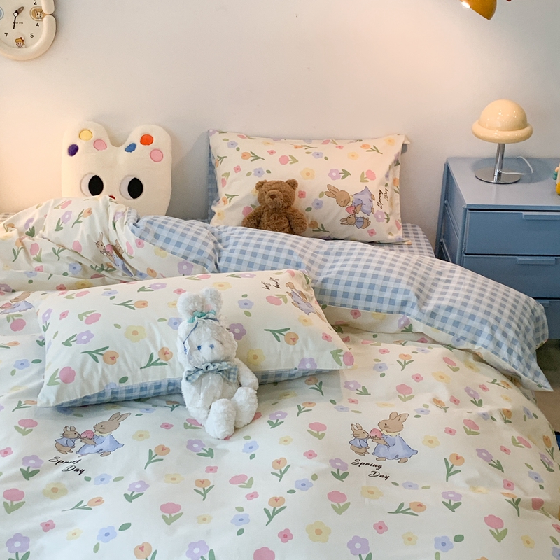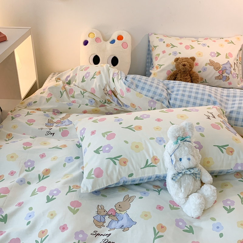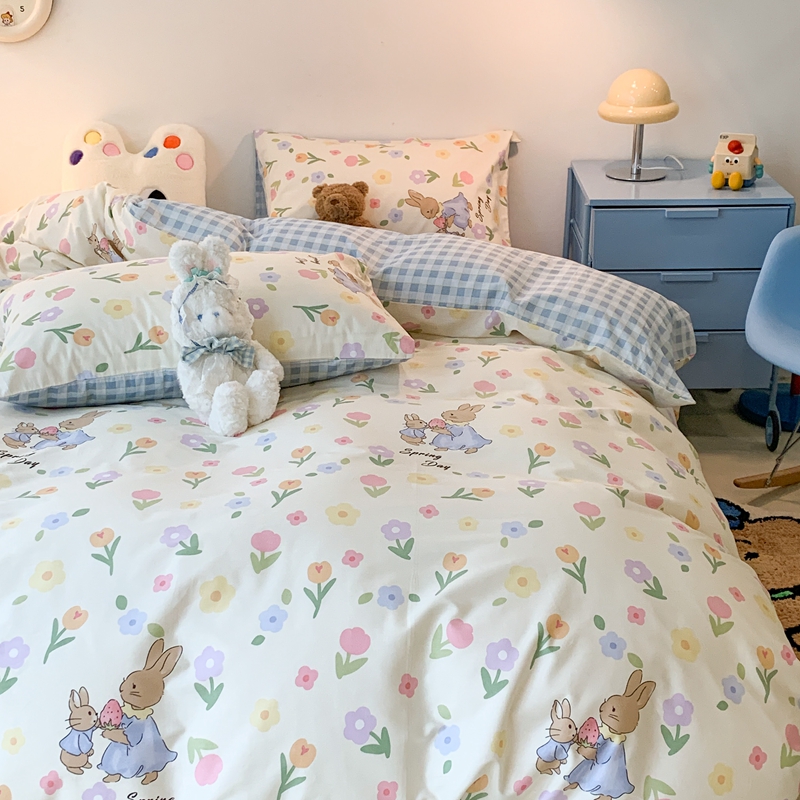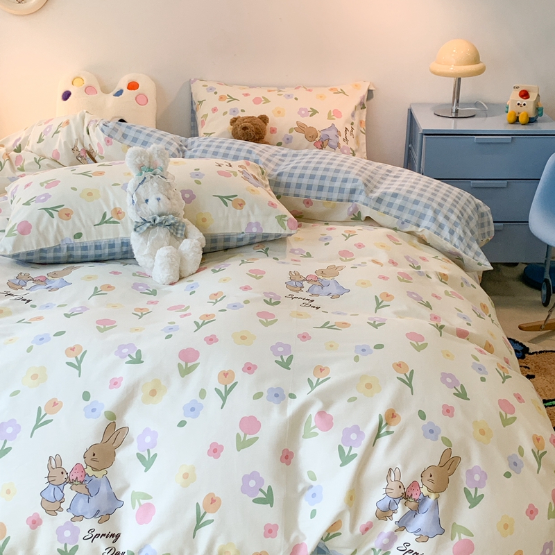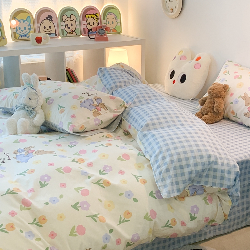 昔可家纺 2023新款全棉四件套-ins卡通系列 蓝格花兔兔
