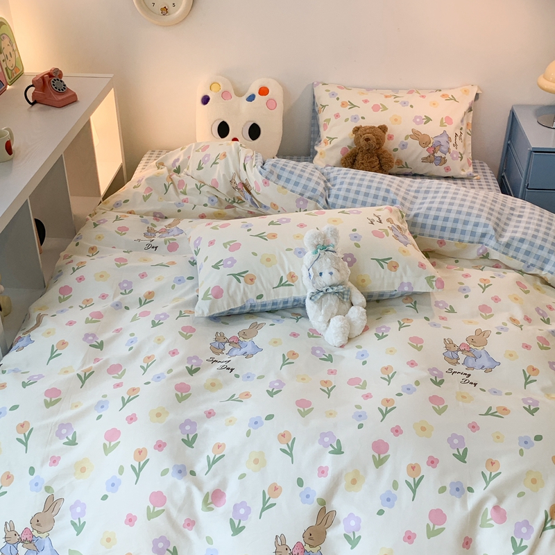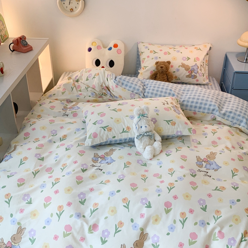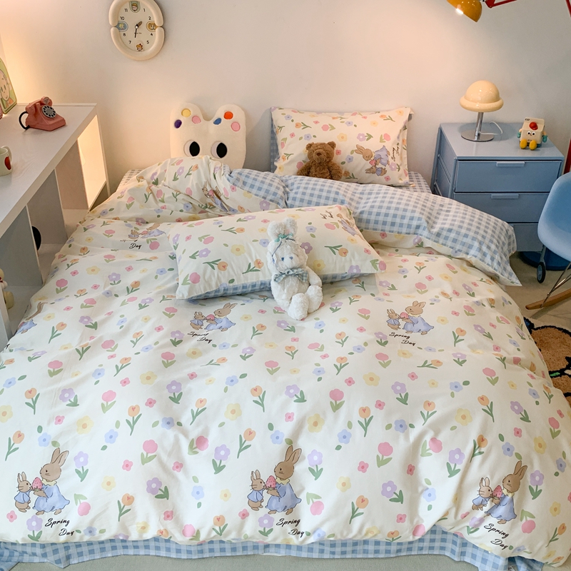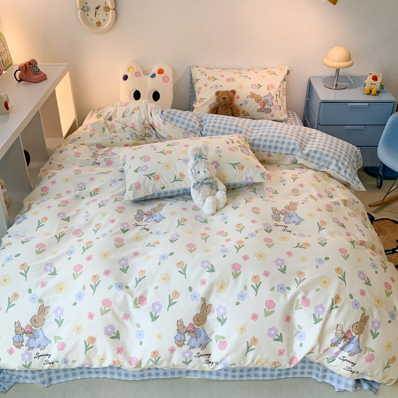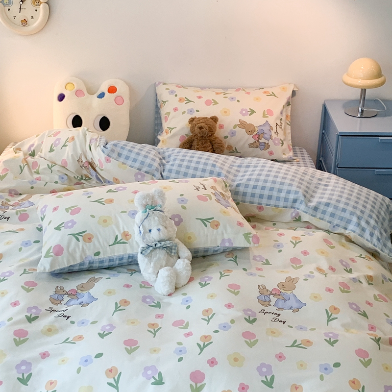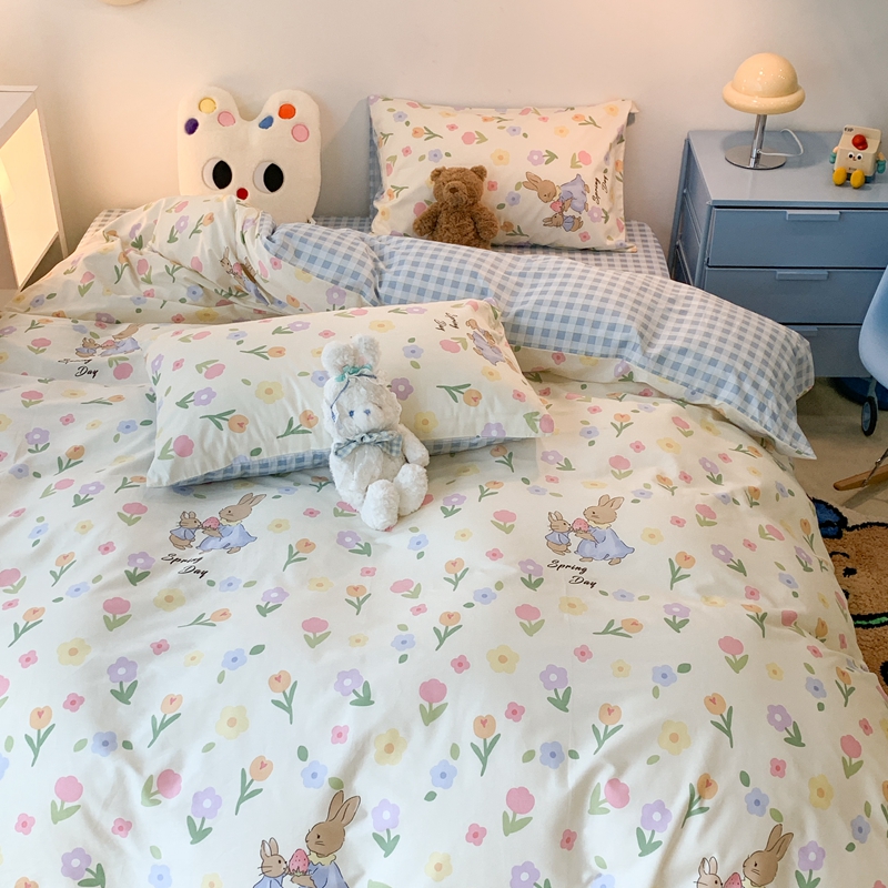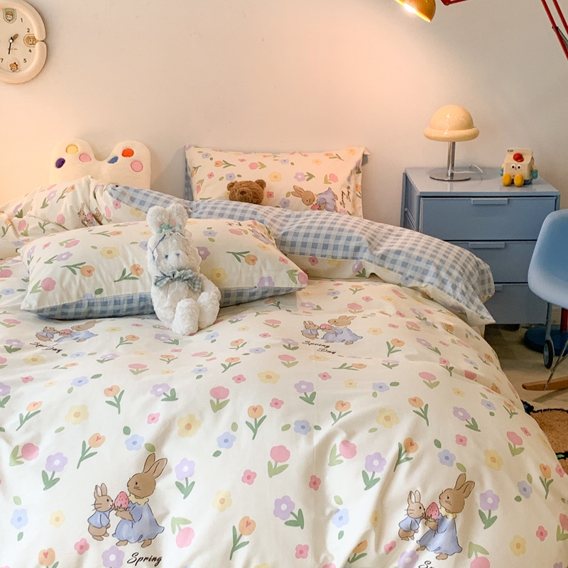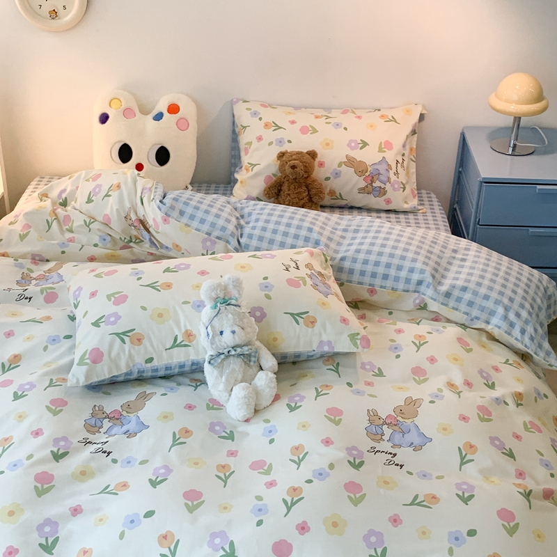 昔可家纺 2023新款全棉四件套-ins卡通系列 蓝格花兔兔