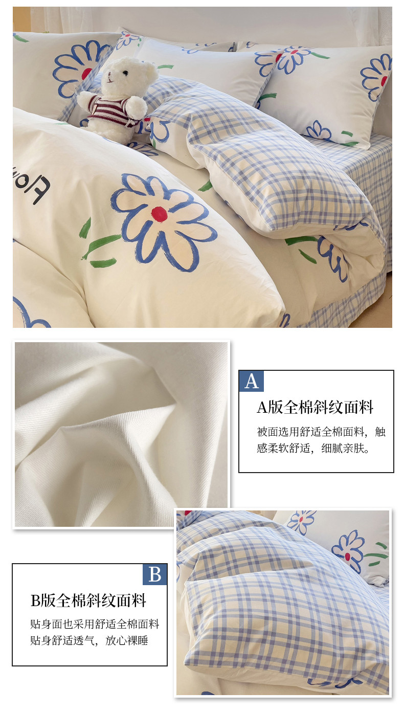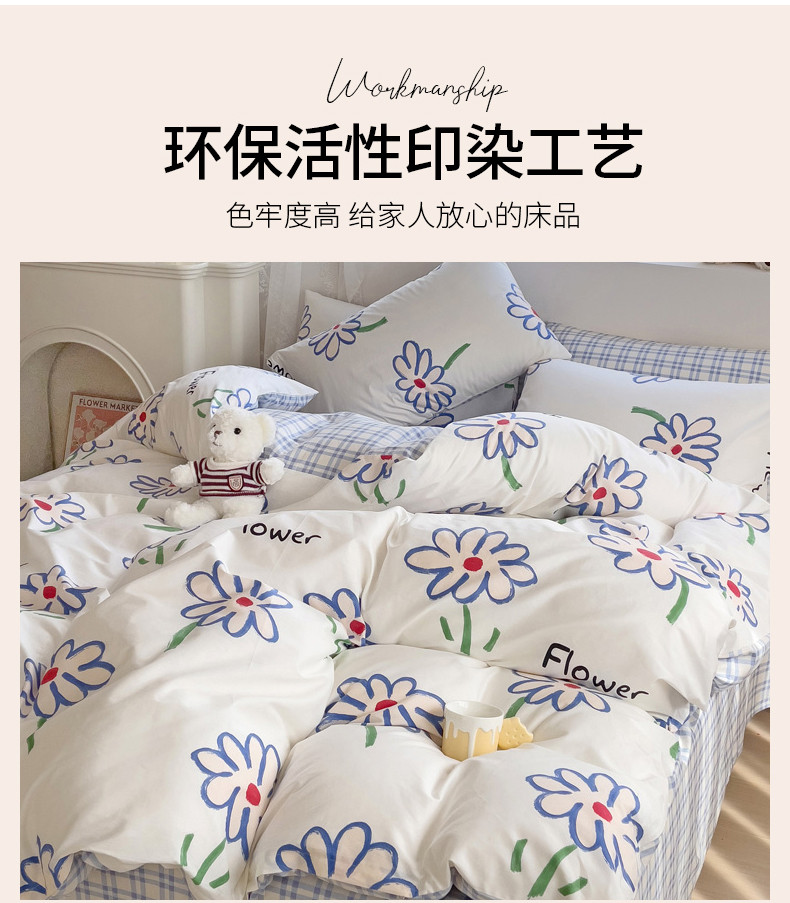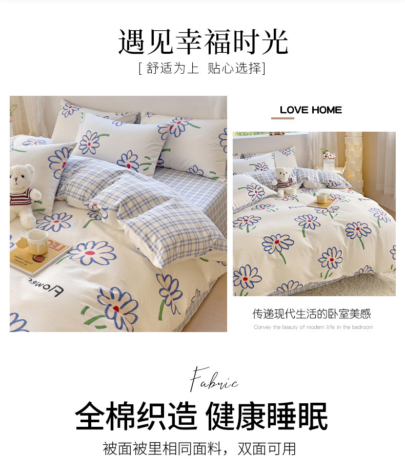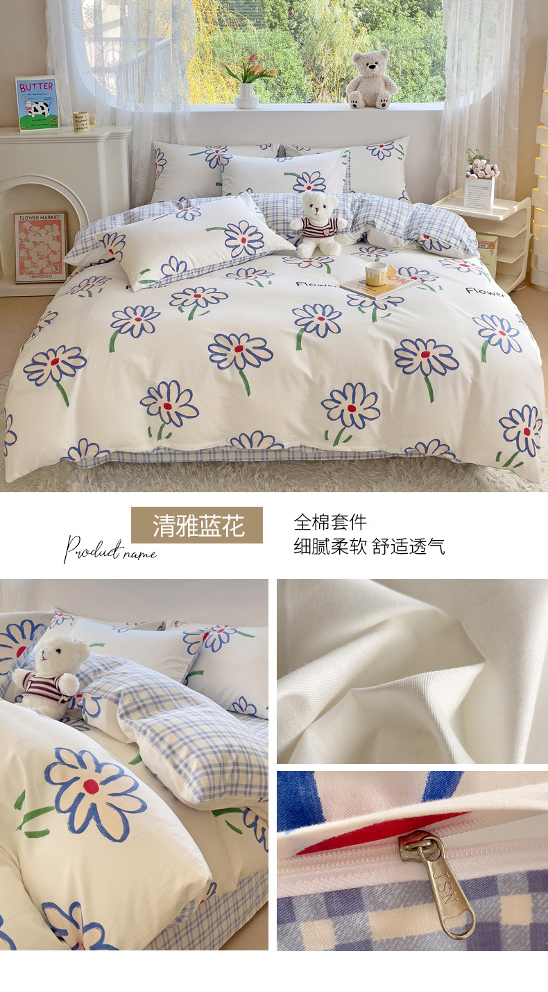 当前位置: 91家纺网 > 商品网购 > 床品套件 > 四件套 > 全棉普通四件套 > 金丝鸟 2023新款全棉可爱卡通印花小清新四件套-第二批 清雅蓝花