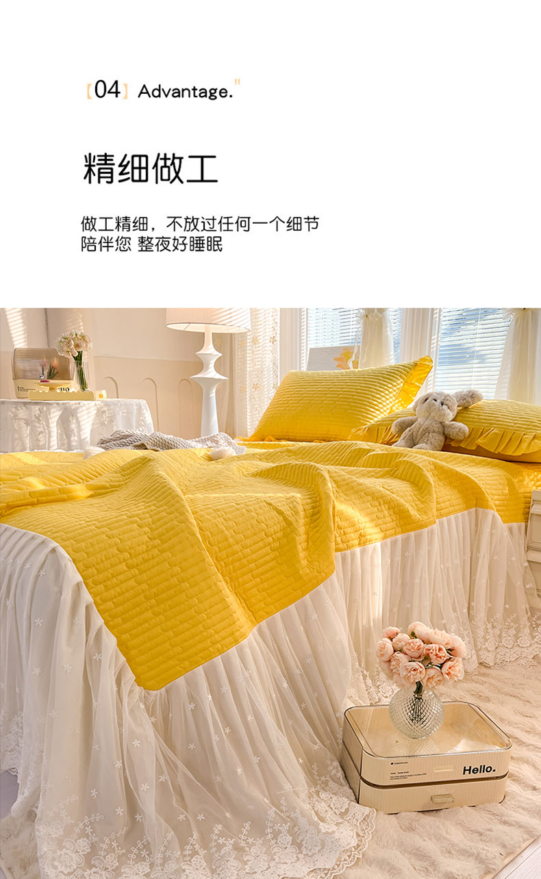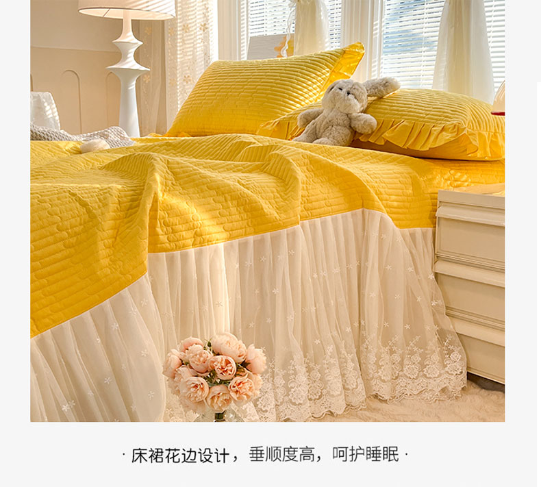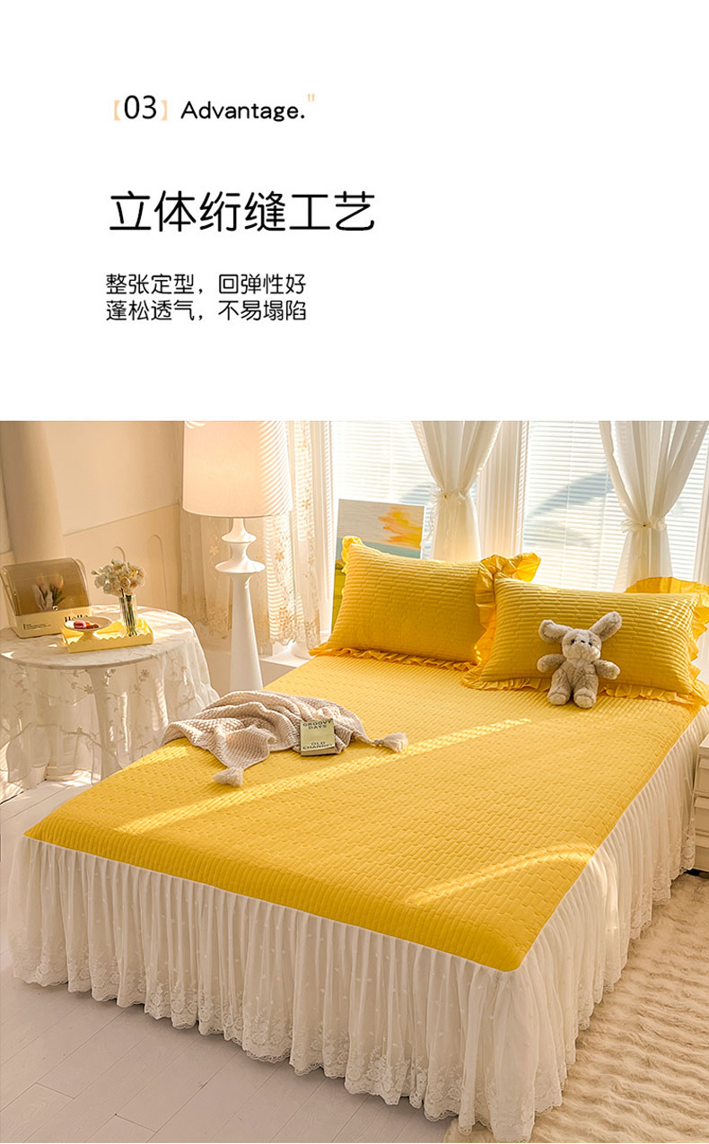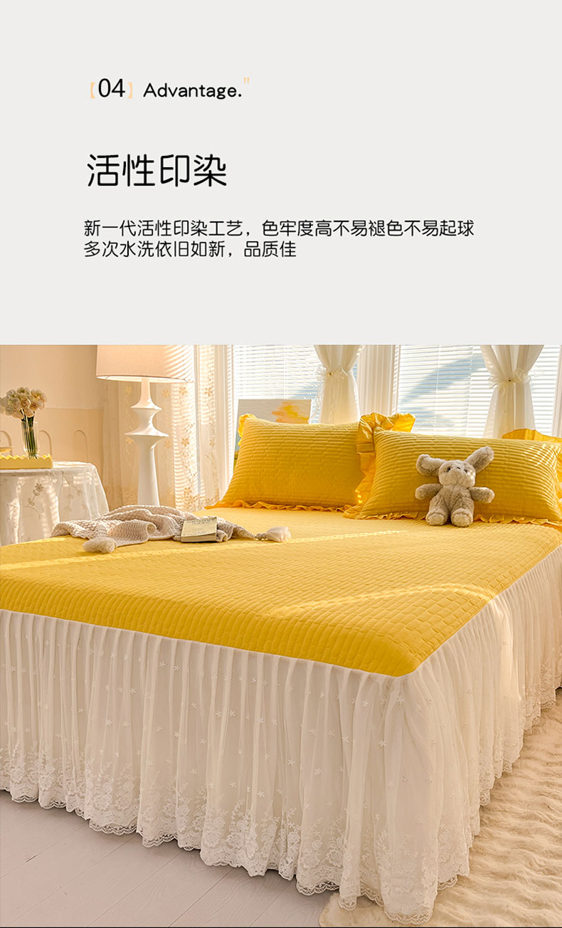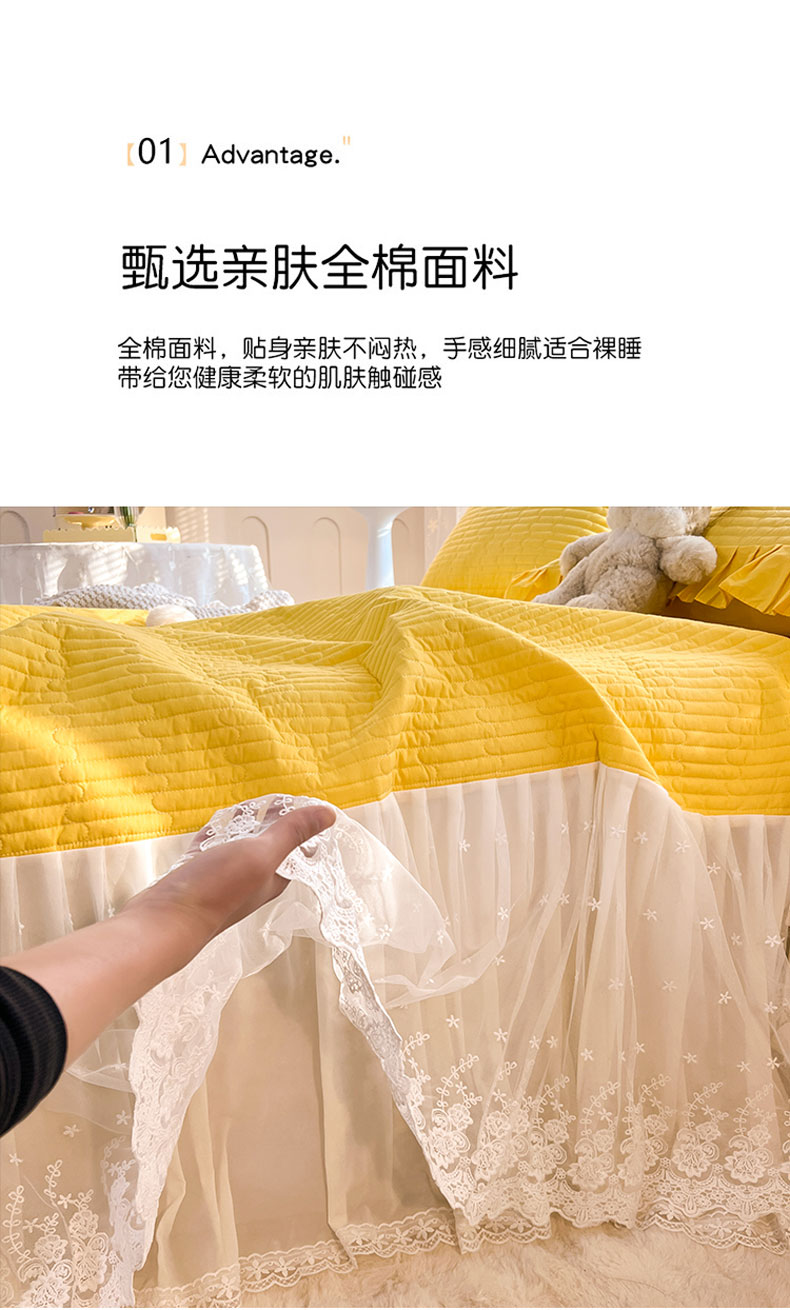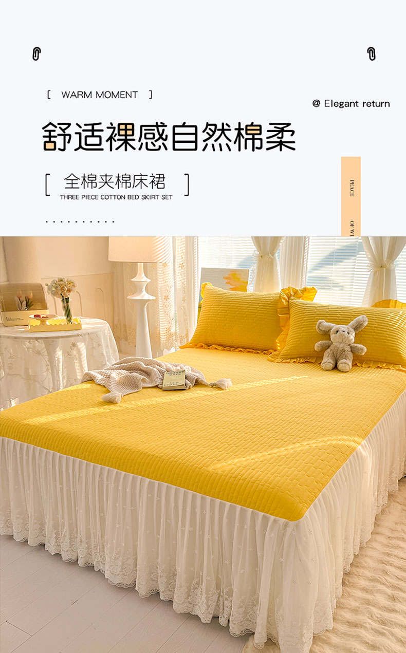 商品名称:花香四季2024年新款13376全棉夹棉蕾丝公主风床裙三件套 奶黄色
