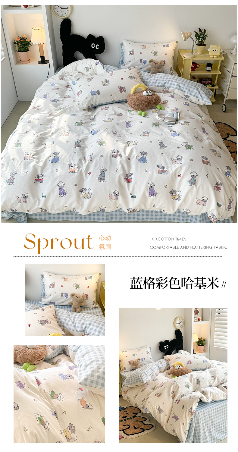商品名称:昔可家纺 2024新款全棉萌趣卡通印花系列四件套 蓝格彩色哈基米
