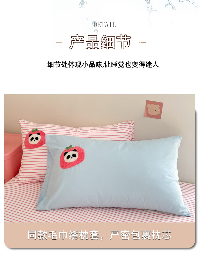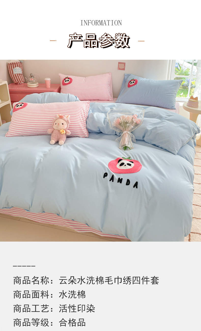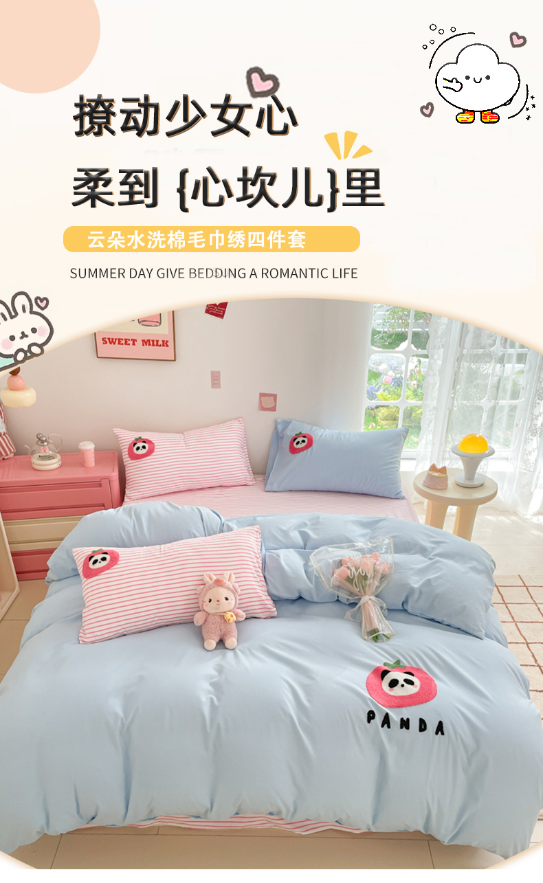 当前位置: 91家纺网 > 商品网购 > 床品套件 > 四件套 > 毛巾绣四件套 > 葡萄家纺 2024款水果熊猫系列云朵水洗棉毛巾绣四件套第二批(提供买家秀) 草莓圣代-蓝