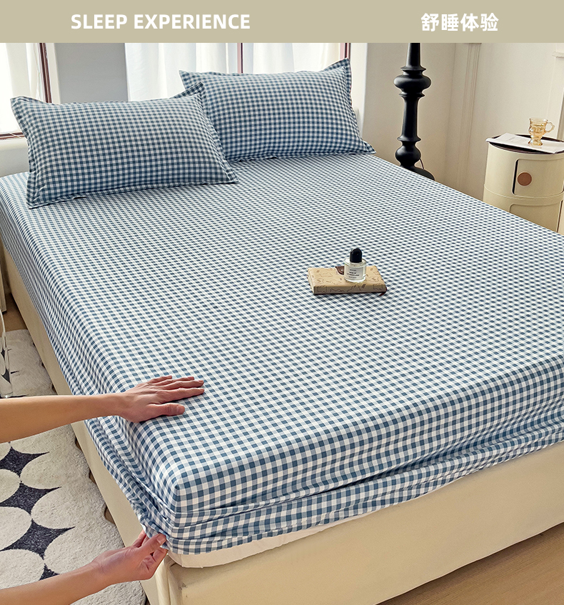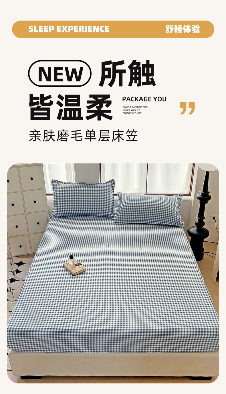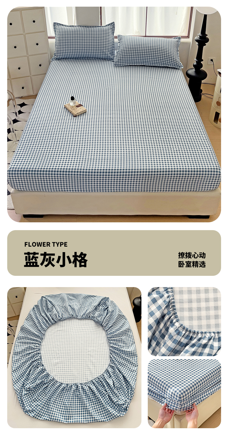 好亿来家纺 2025新款亲肤磨毛单层床笠 蓝灰小格