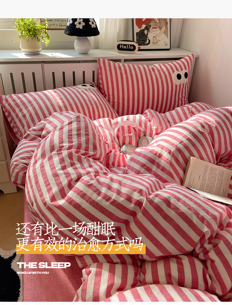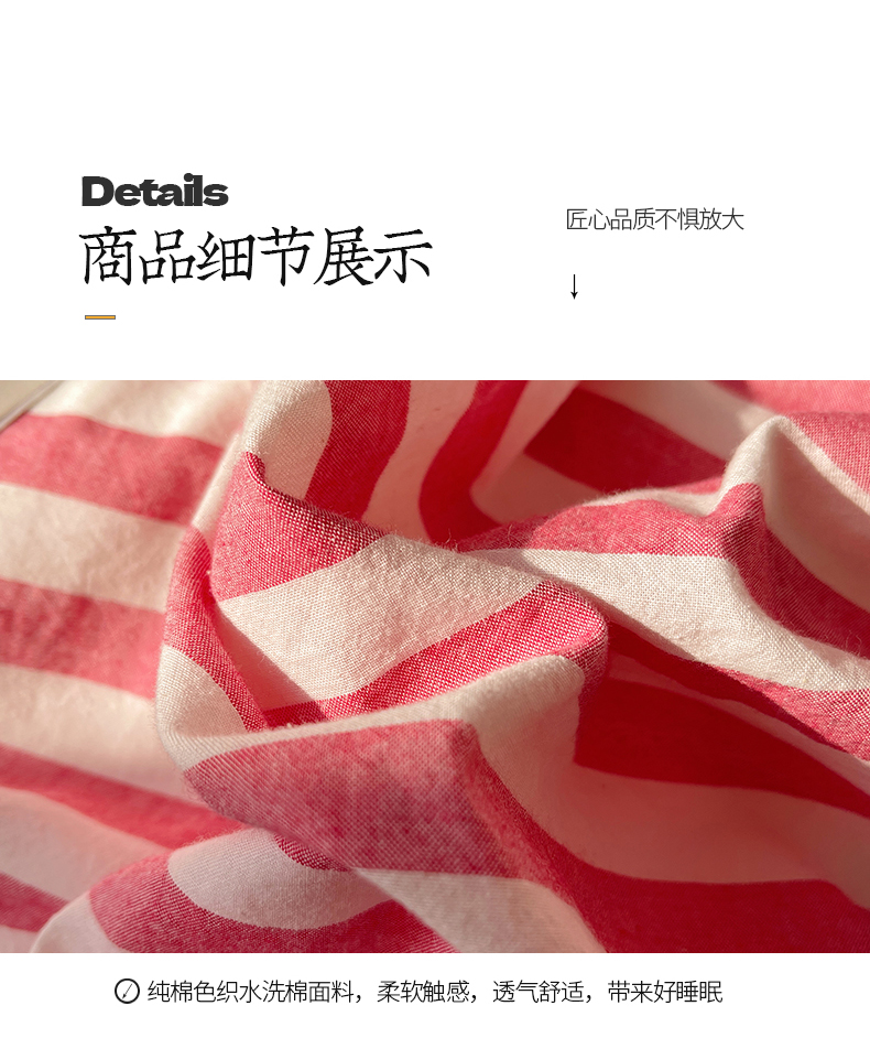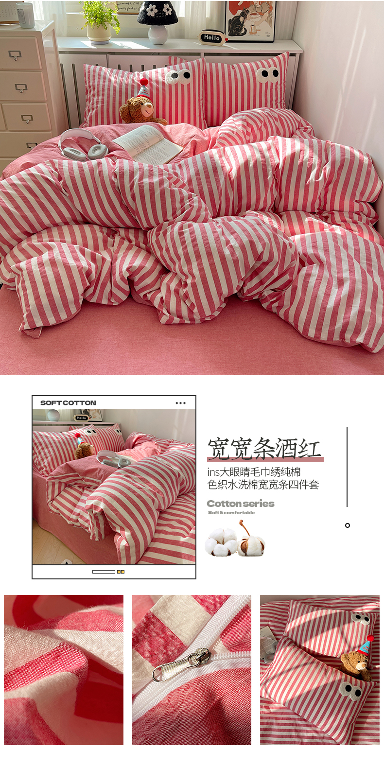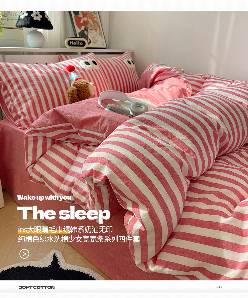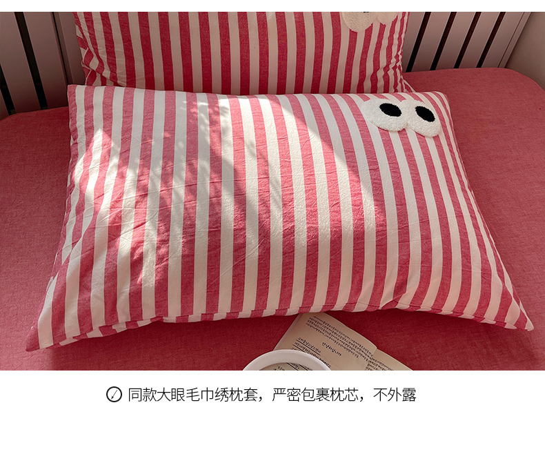 商品名称:桃子 2024新款ins大眼睛毛巾绣韩系奶油无印纯棉色织水洗棉少女宽宽条系列四件套 水洗棉-宽宽条酒红