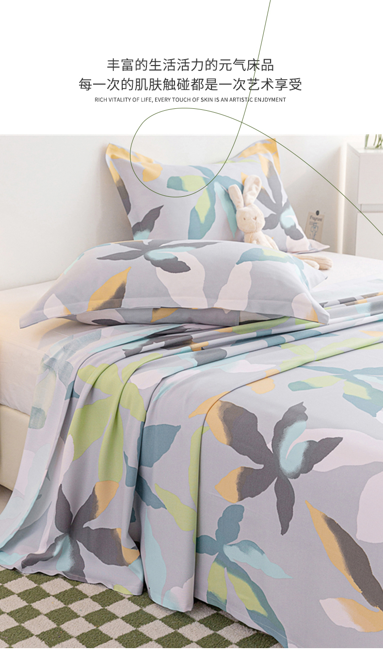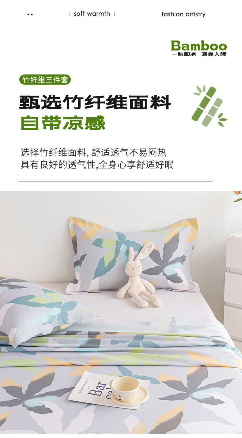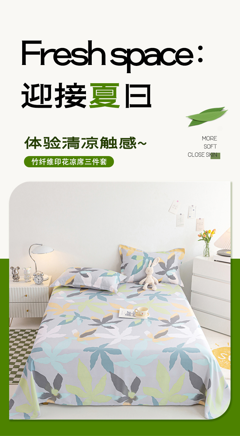 金泰莱 2025新款印花竹纤维凉席三件套软凉席竹席盖毯子 叶曼-灰