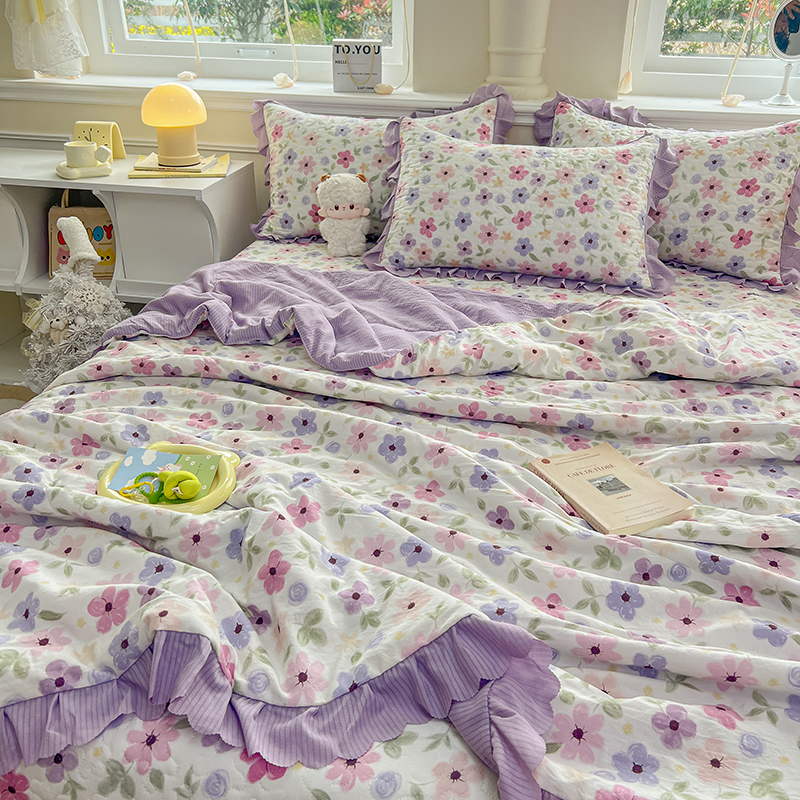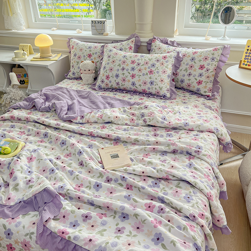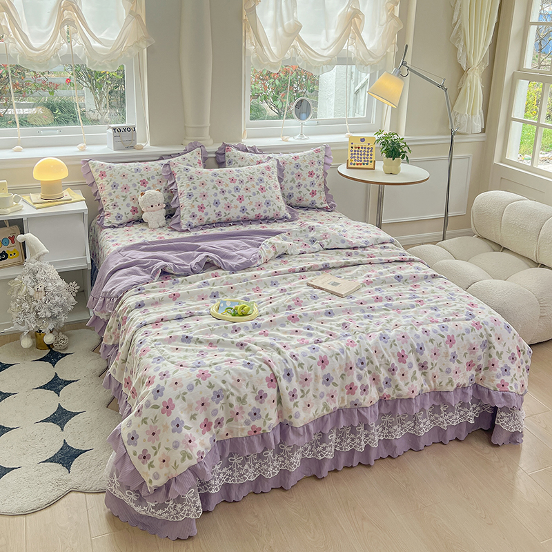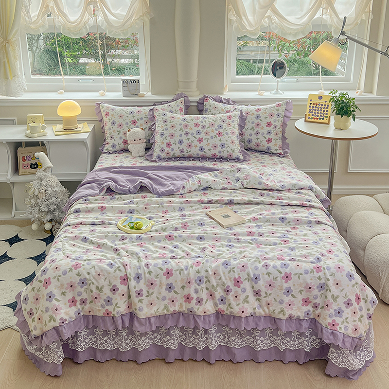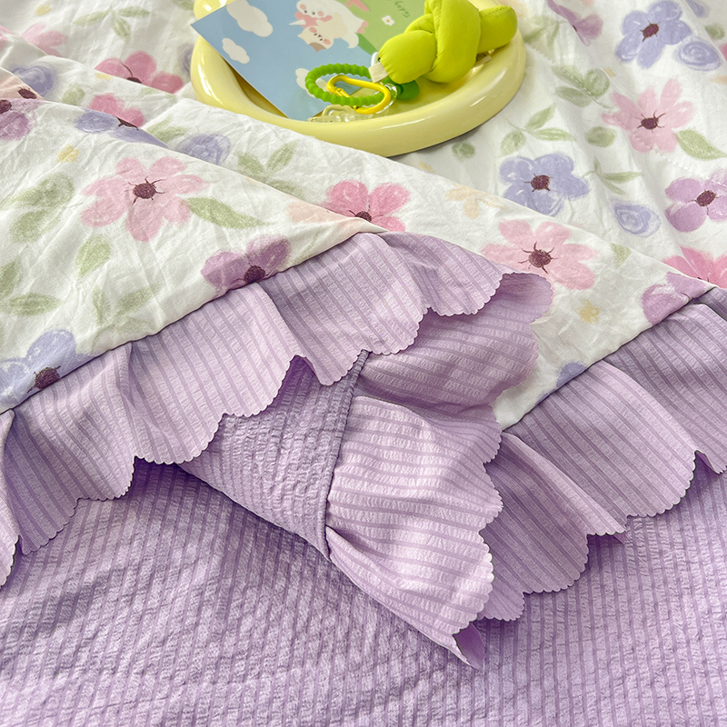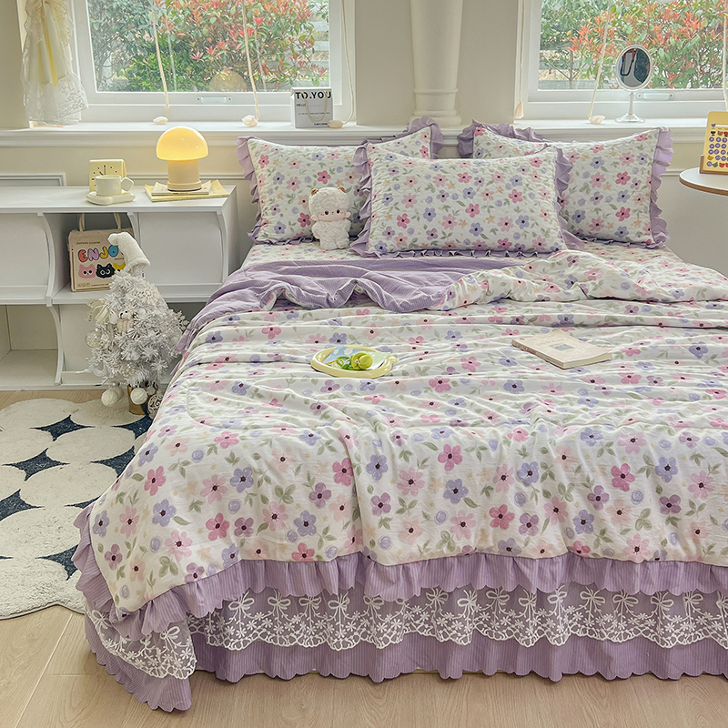 当前位置: 91家纺网 > 商品网购 > 床品套件 > 四件套 > 夏被四件套 > 雅眠居 2024直播爆款泡泡棉床盖款夏被四件套双层蕾丝花边夹棉床裙款三件套 紫苏