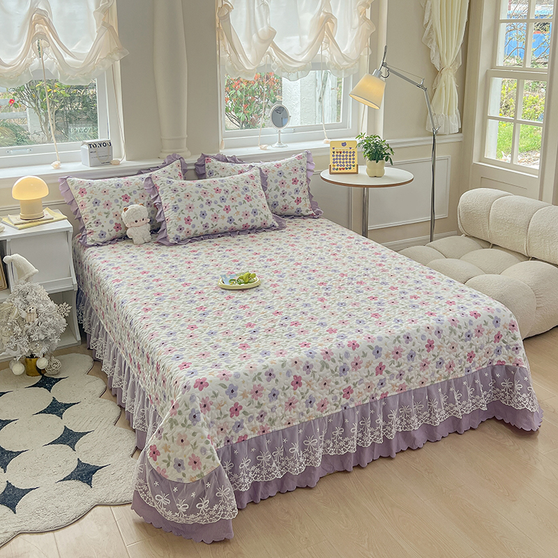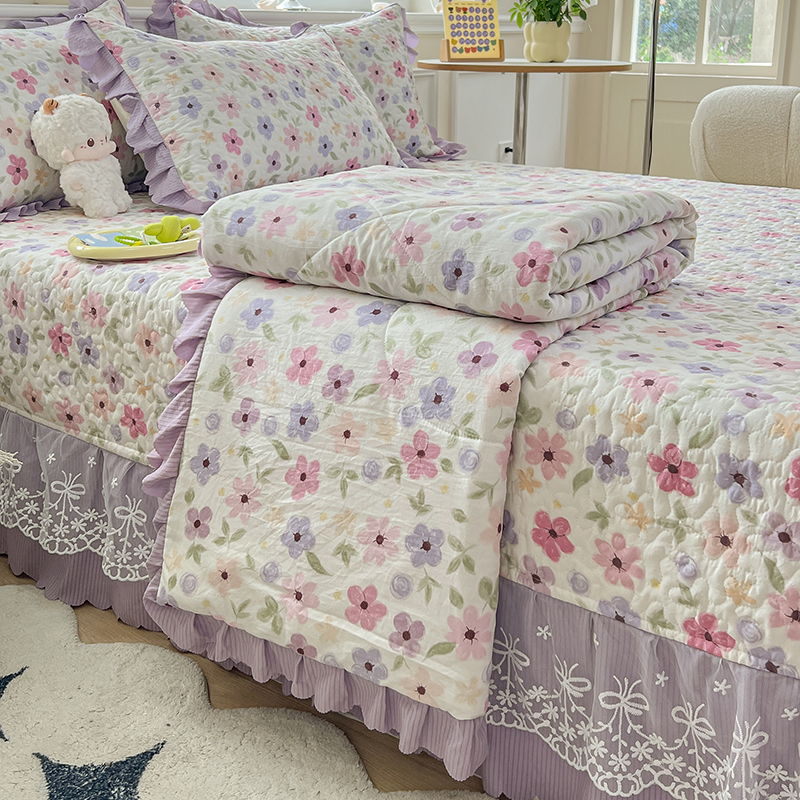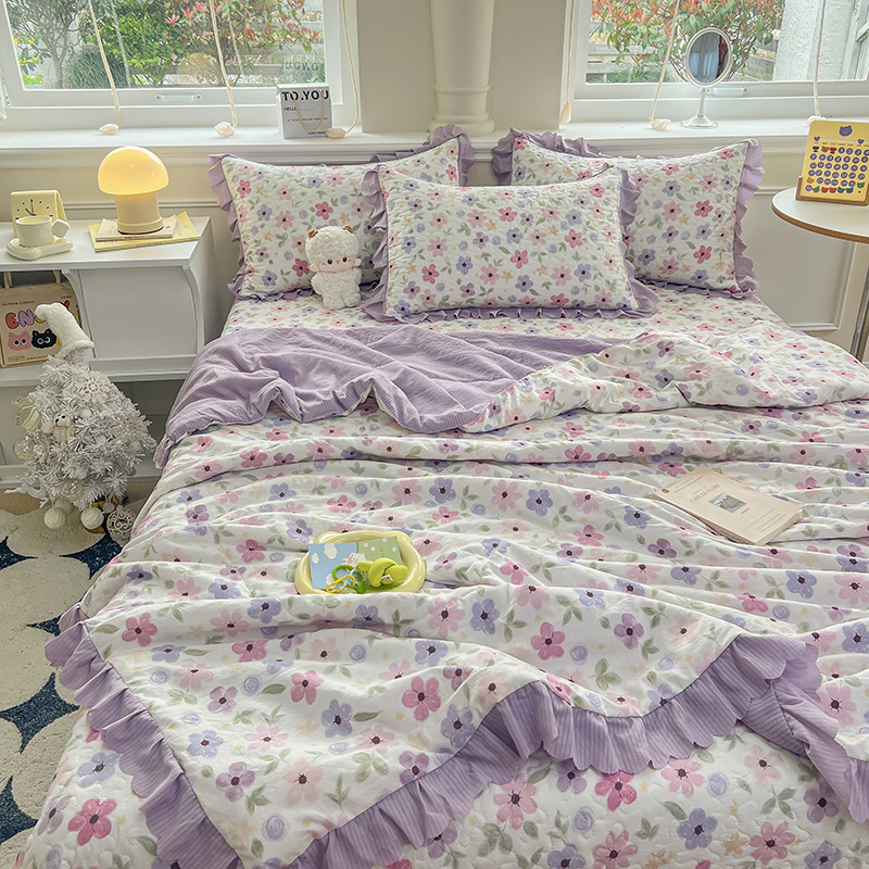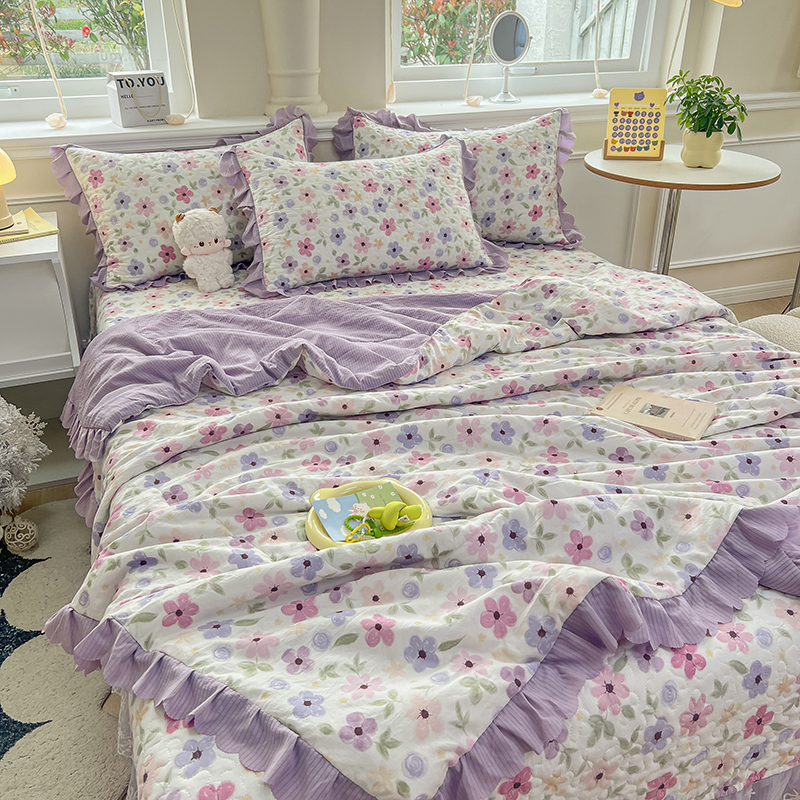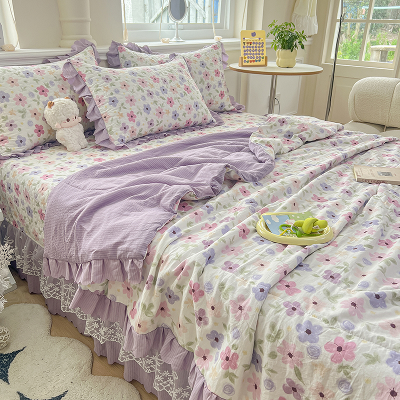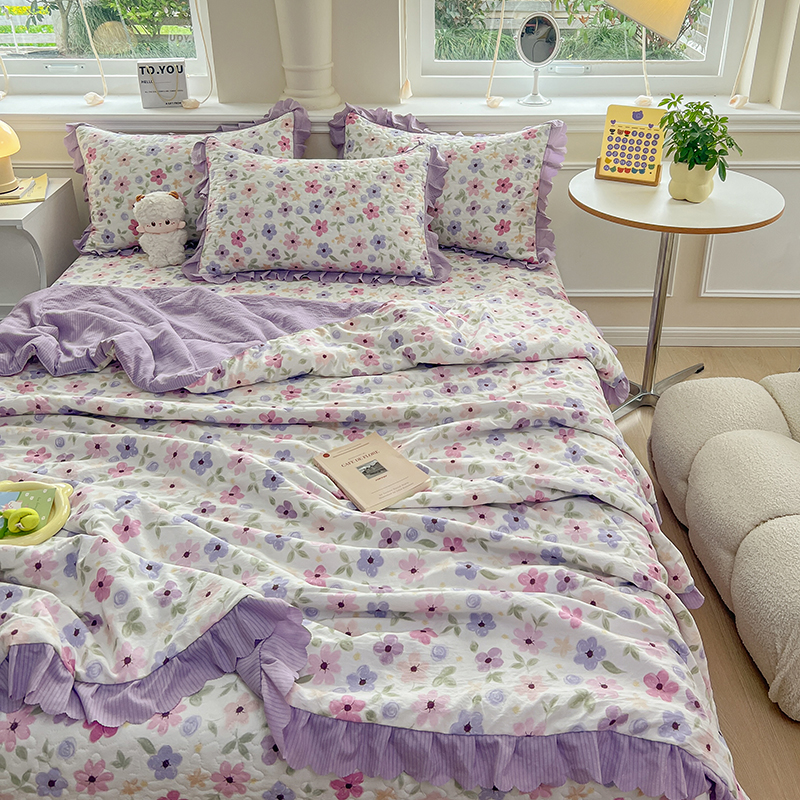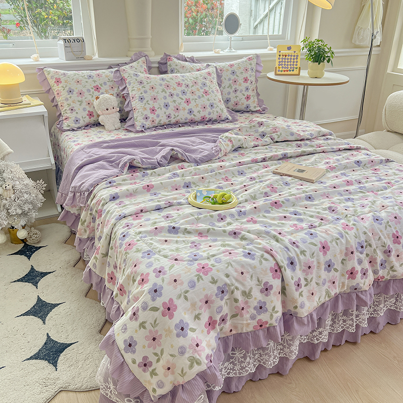 当前位置: 91家纺网 > 商品网购 > 床品套件 > 四件套 > 夏被四件套 > 雅眠居 2024直播爆款泡泡棉床盖款夏被四件套双层蕾丝花边夹棉床裙款三件套 紫苏