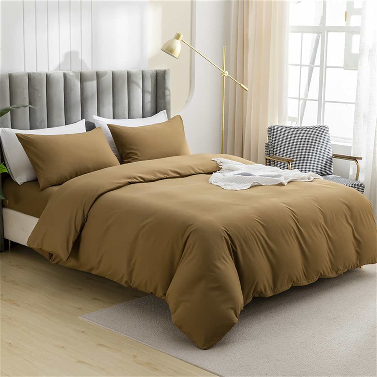 2025款跨境外贸纯色磨毛枕套被套套件三件套床上用品外贸专供可定制 卡其