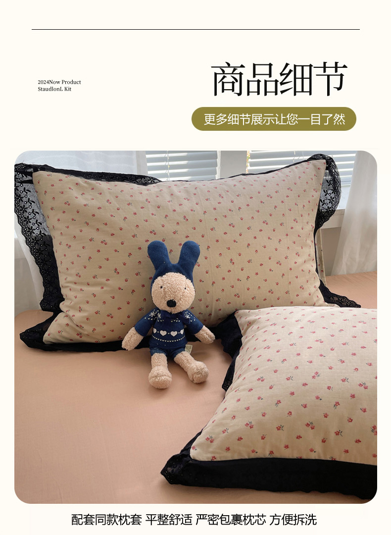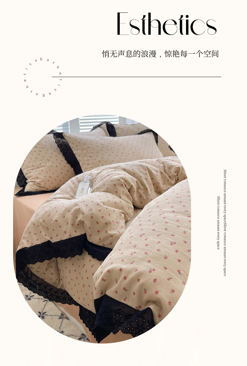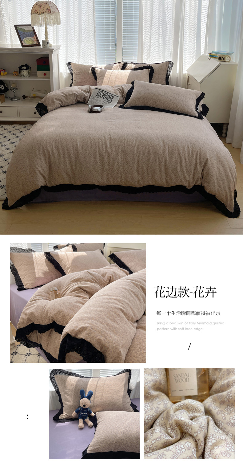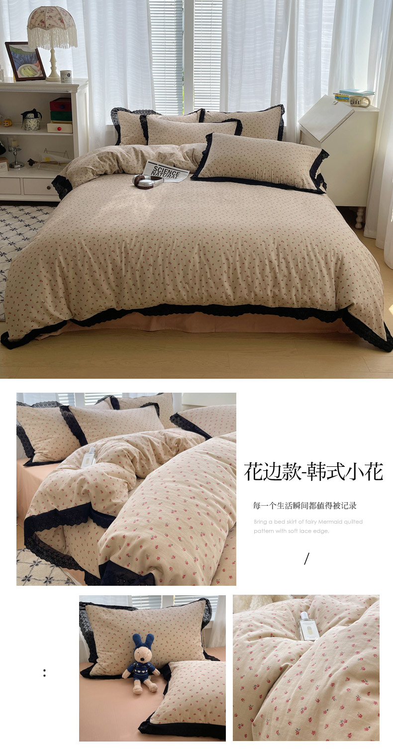 商品名称:2025新款全棉黑边双层纱花边款四件套 花边款-韩式小花