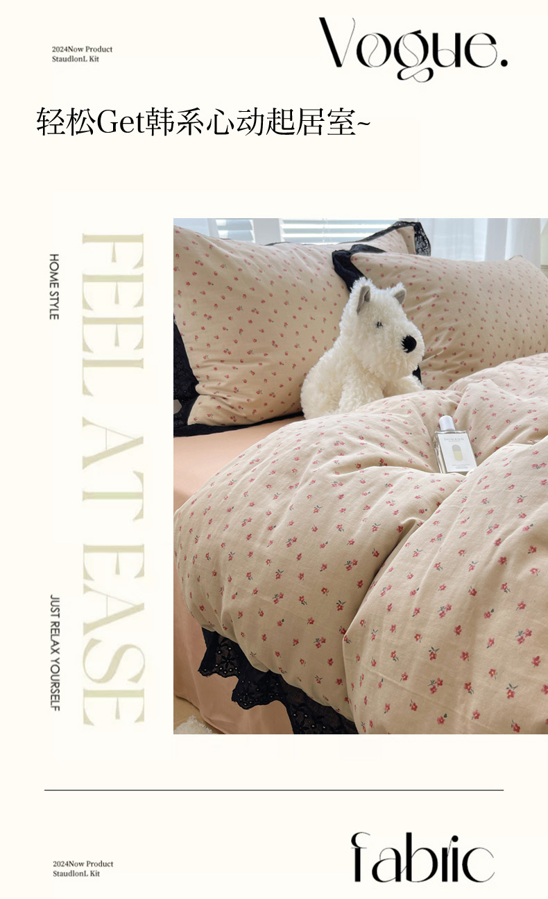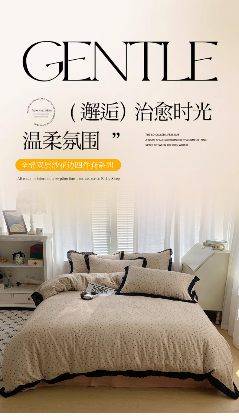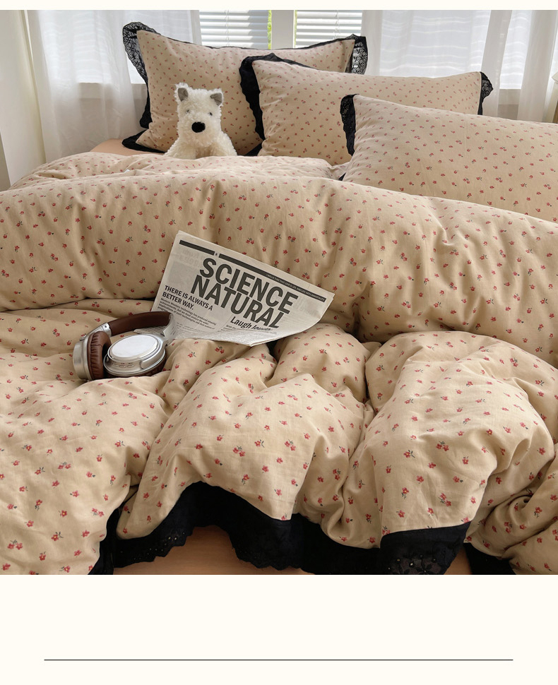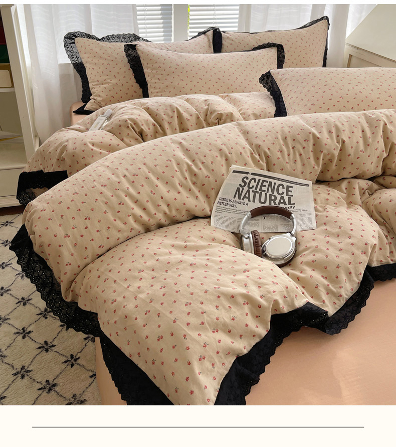2025新款全棉黑边双层纱花边款四件套 花边款-韩式小花