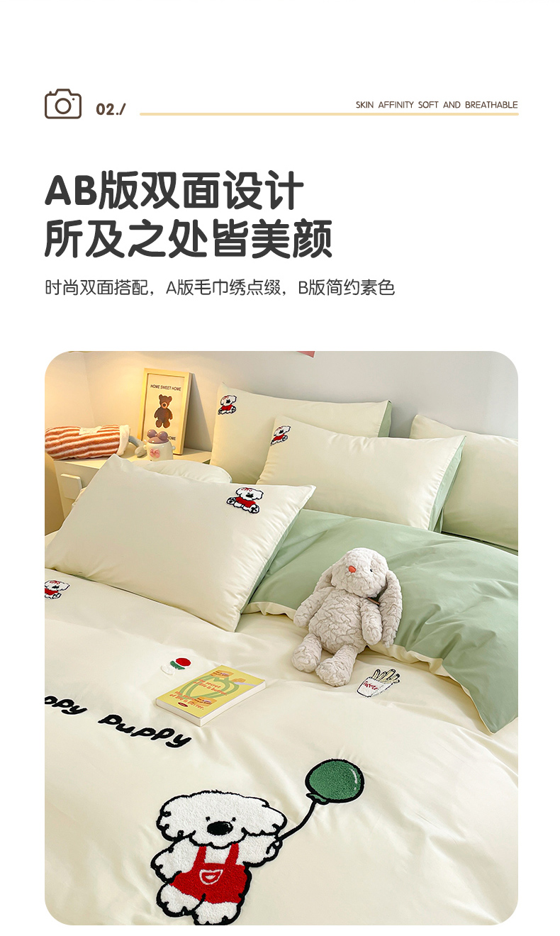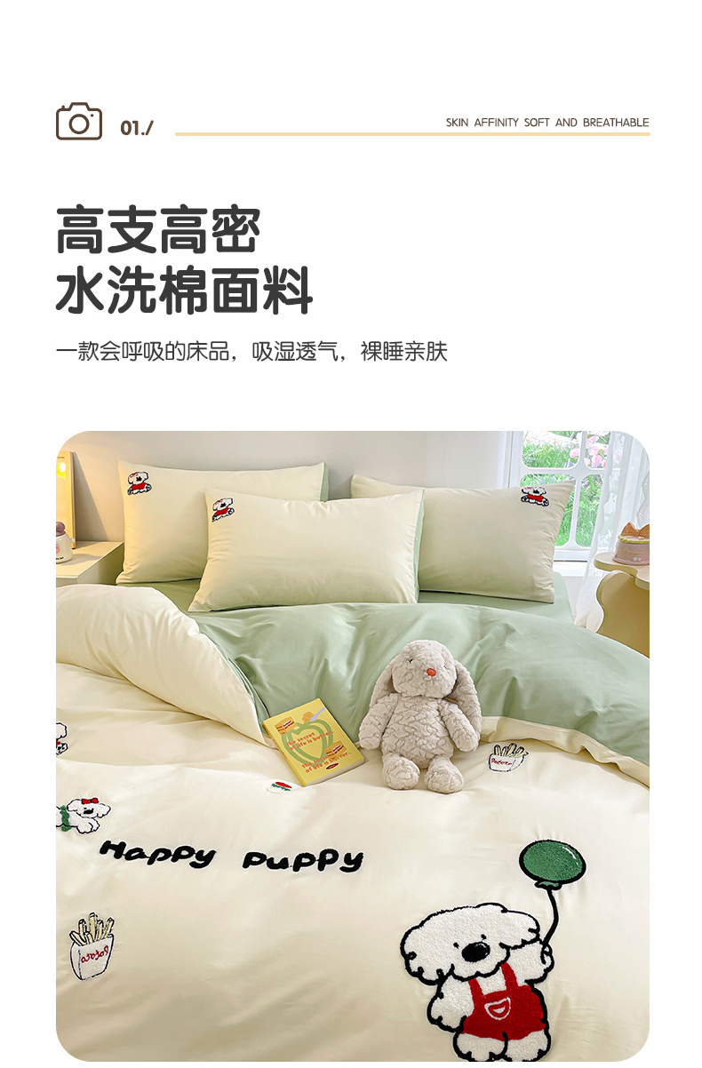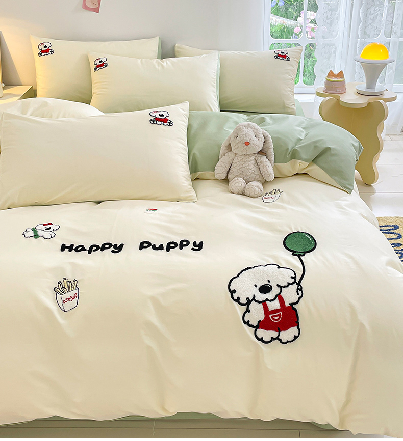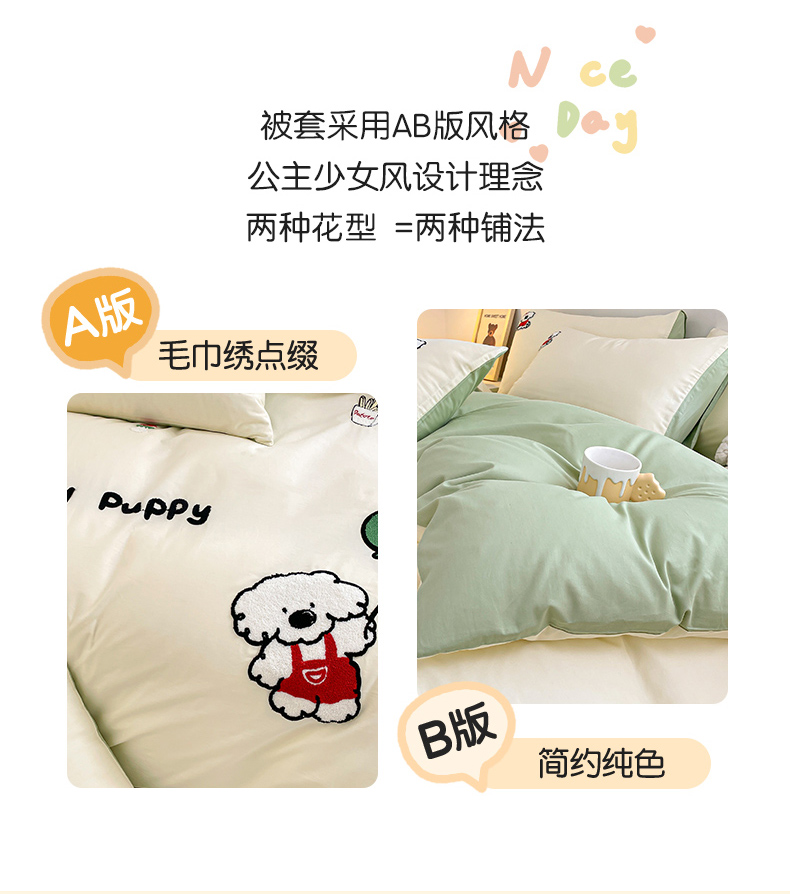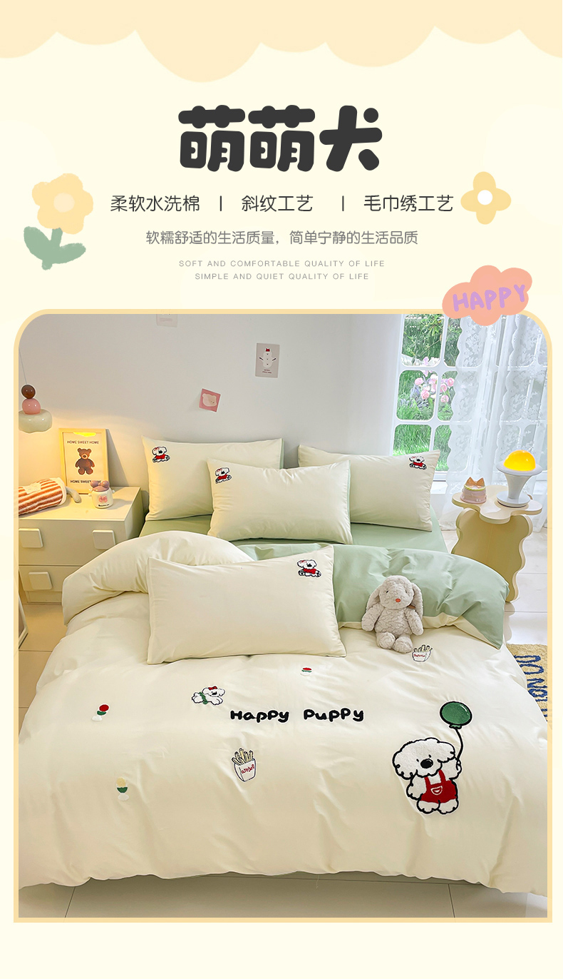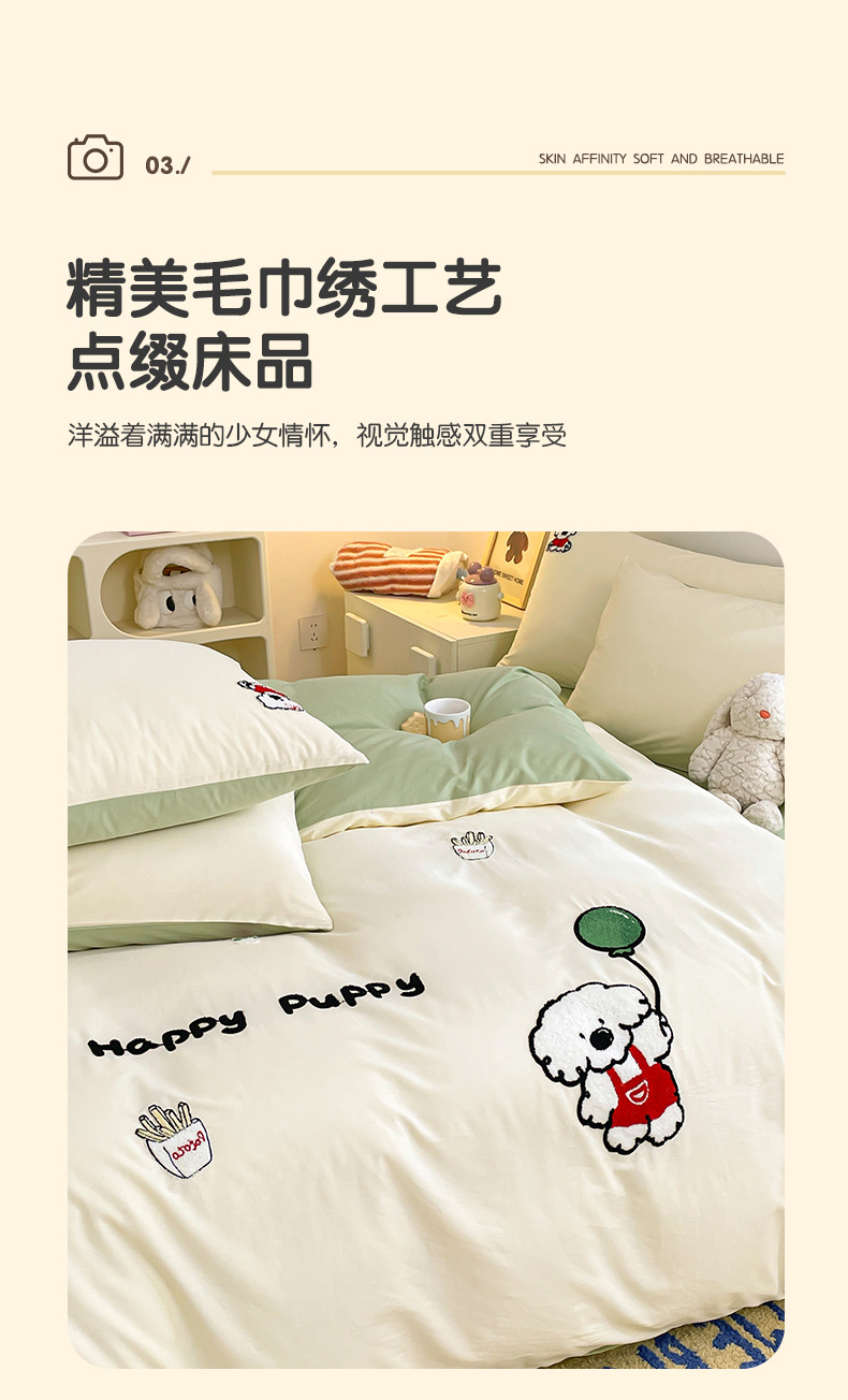 当前位置: 91家纺网 > 商品网购 > 床品套件 > 四件套 > 水洗棉四件套 > 丽美人家纺 2024新款水洗棉毛巾绣卡通四件套 萌萌犬-绿