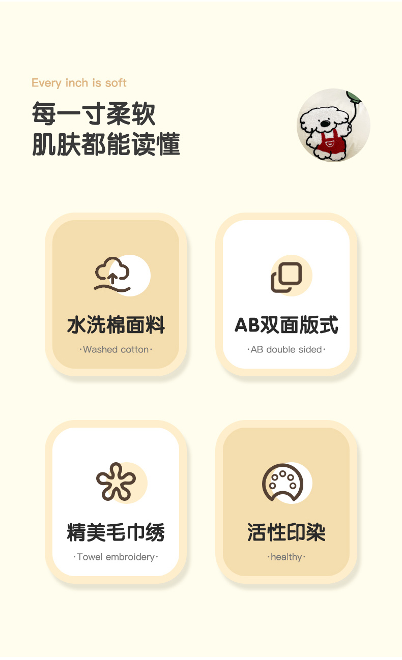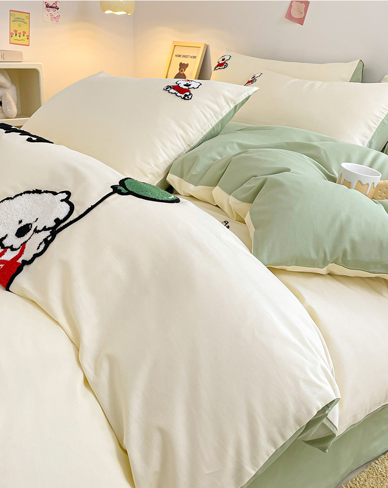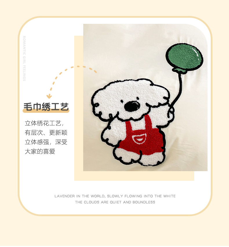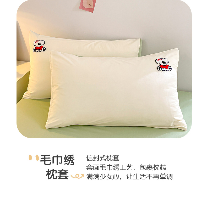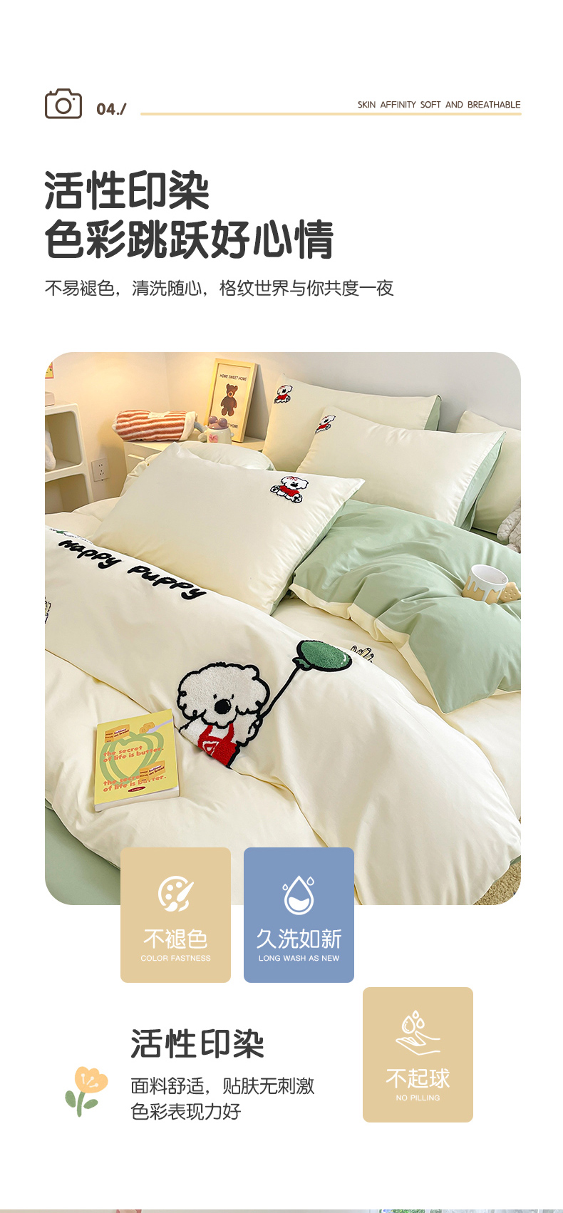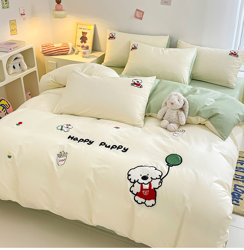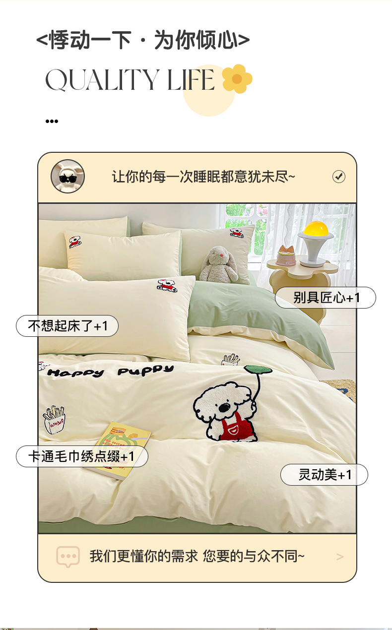 当前位置: 91家纺网 > 商品网购 > 床品套件 > 四件套 > 水洗棉四件套 > 丽美人家纺 2024新款水洗棉毛巾绣卡通四件套 萌萌犬-绿