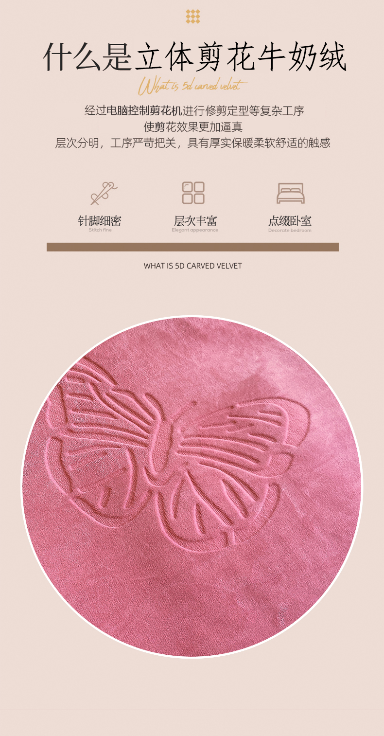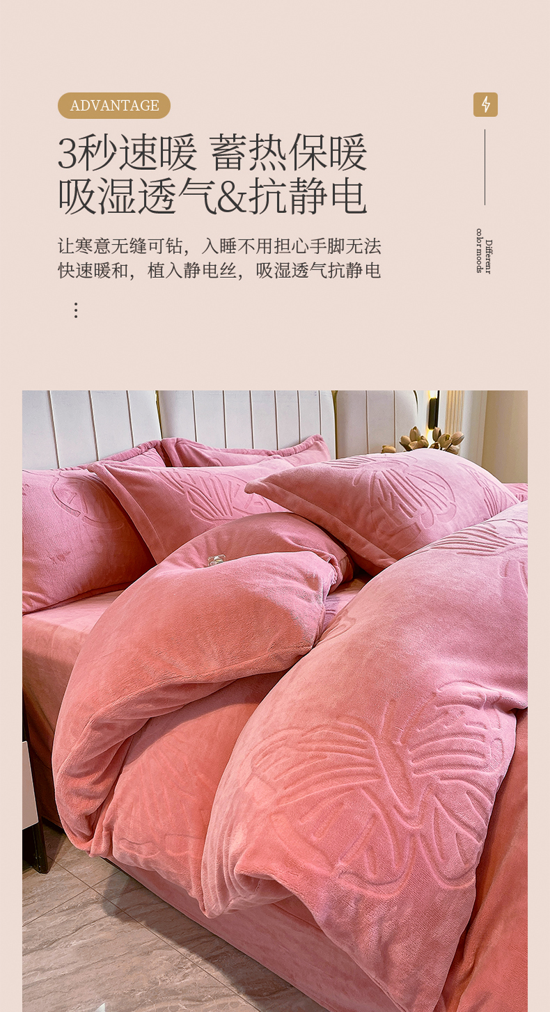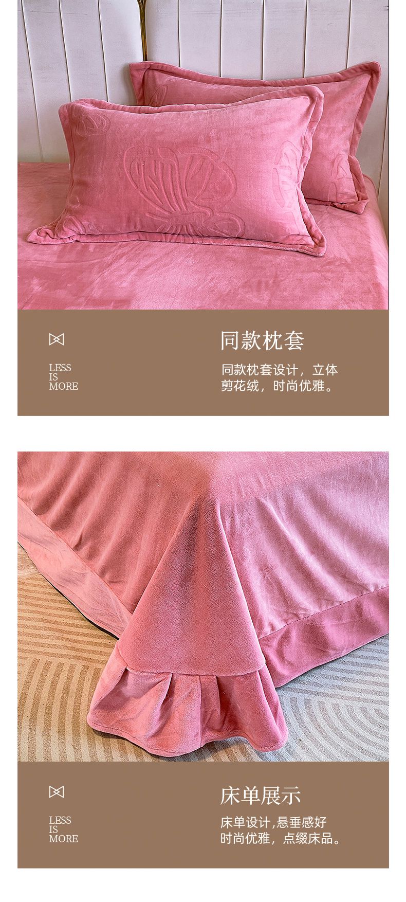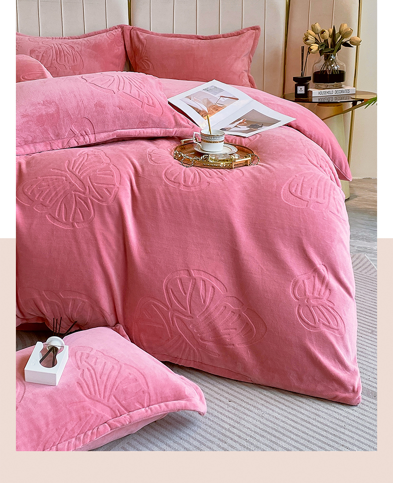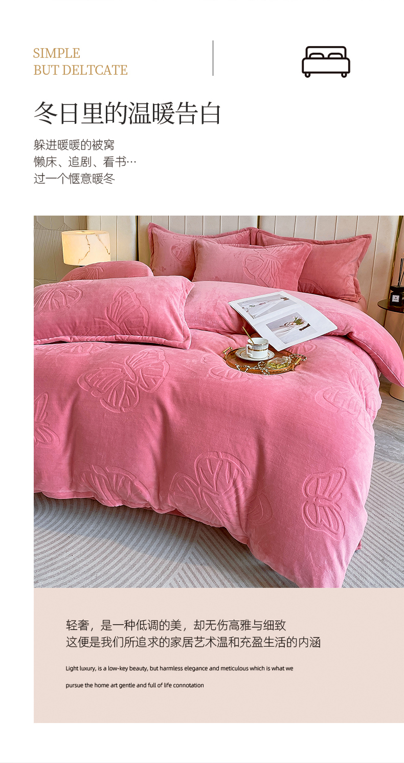 商品名称:一左一右 2024新款高克重加厚230克剪花雕花牛奶绒四件套7D立体蝴蝶纯色简约床笠 豆沙
