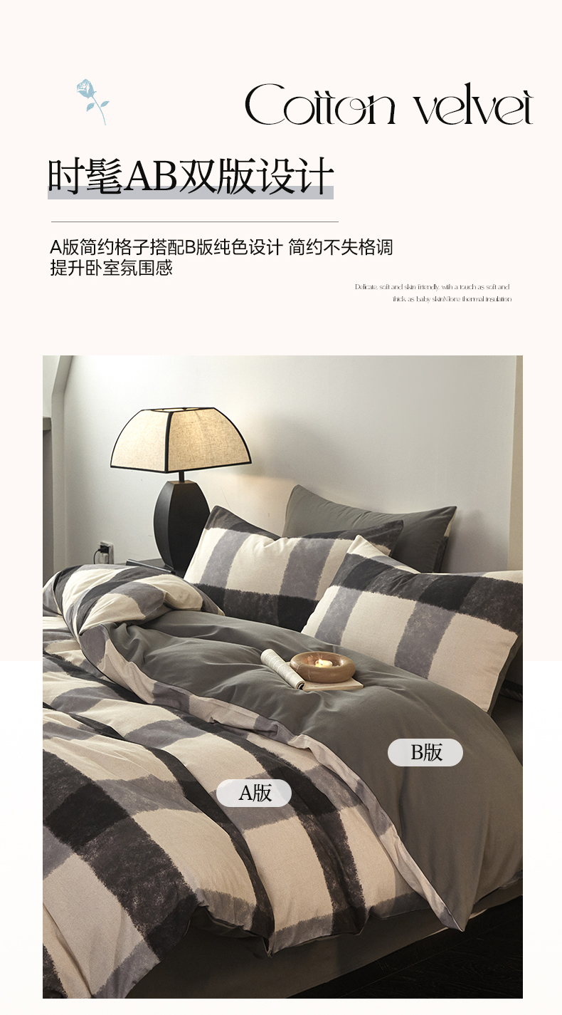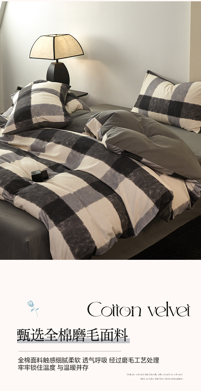 商品名称:雅居纺家纺 2024新款全棉印花磨毛四件套 灰大格