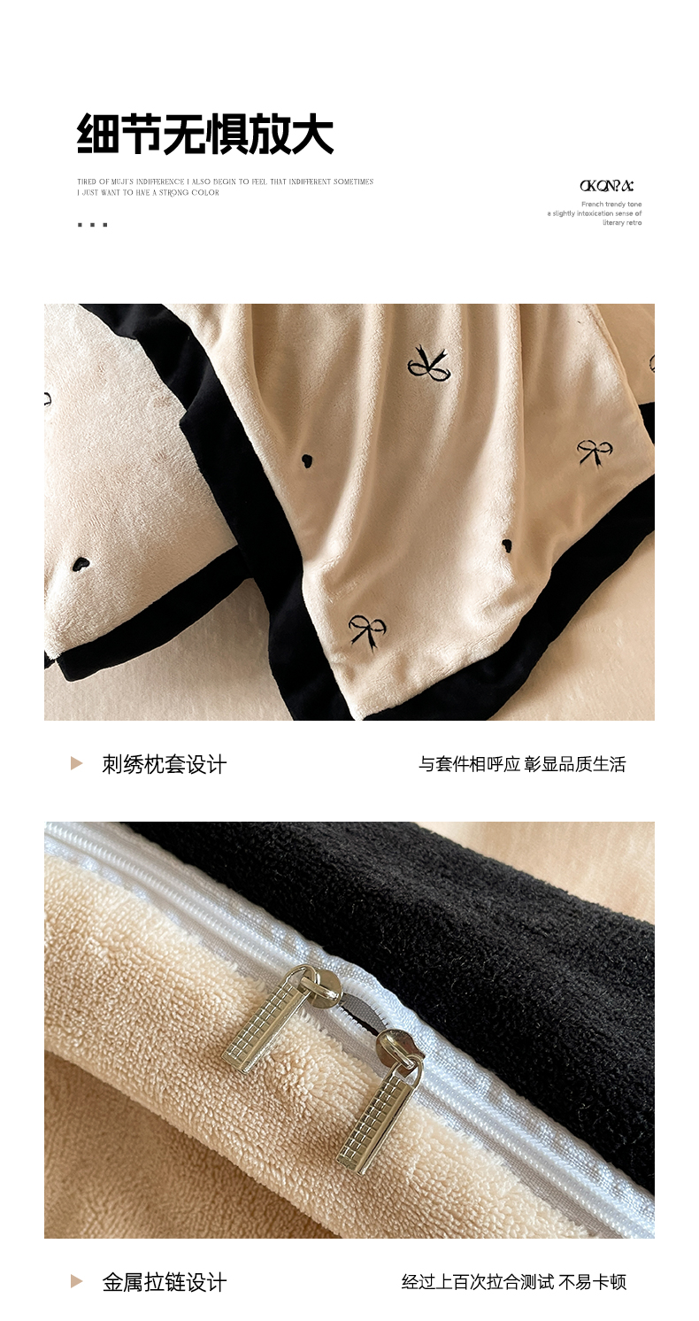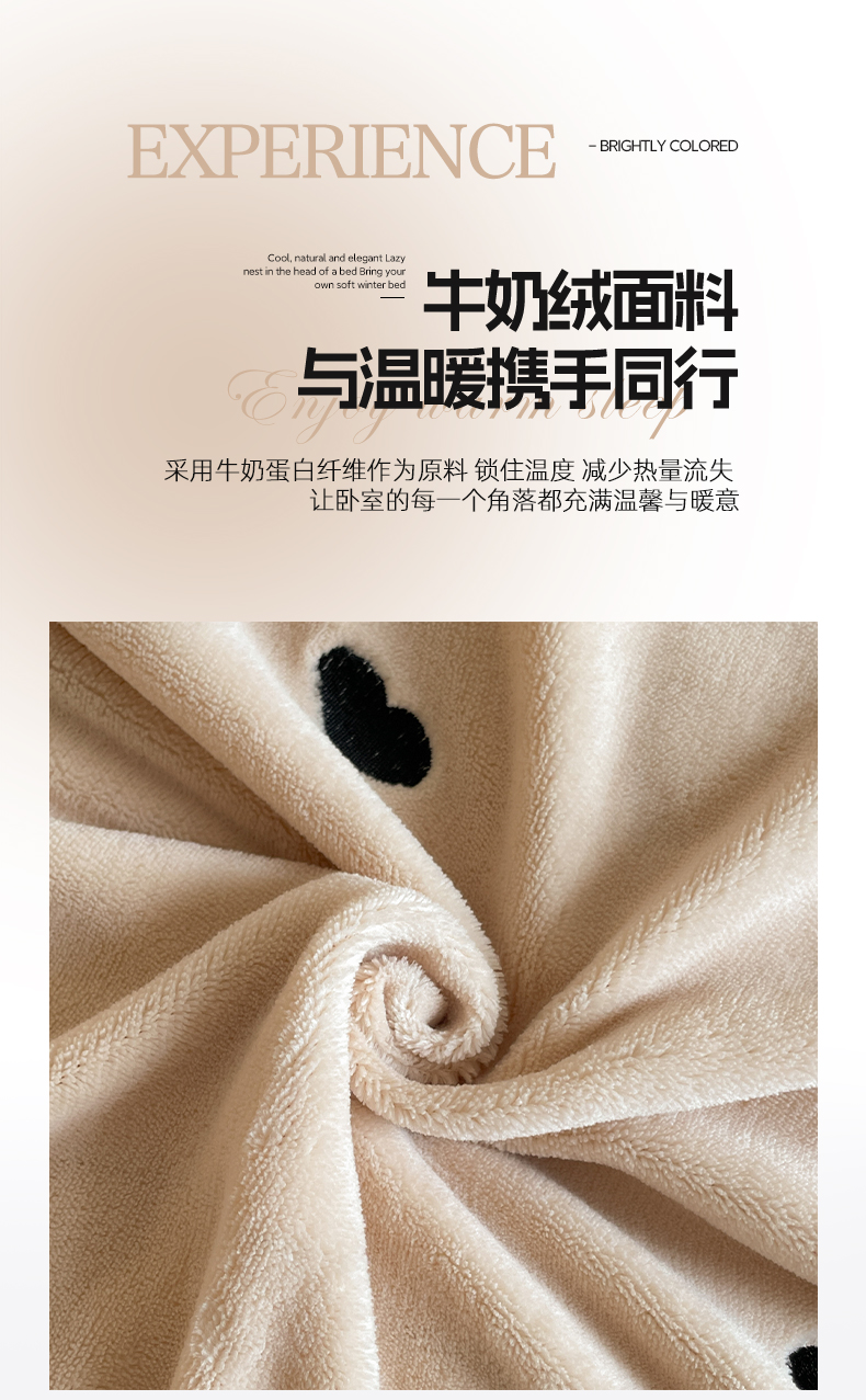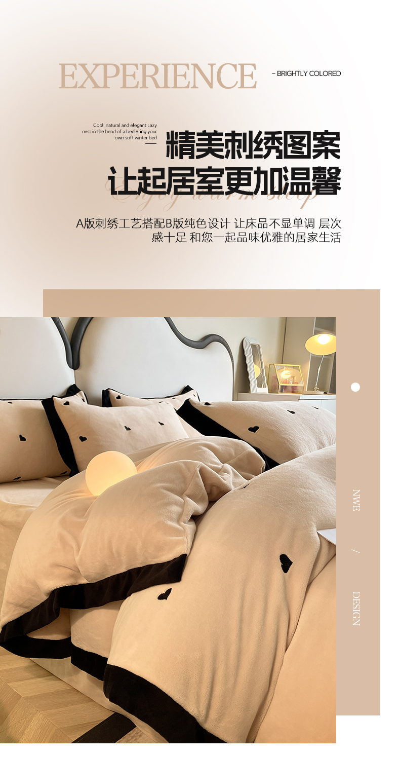 商品名称:宇航家纺 2025新款轻奢风宽边牛奶绒绣花四件套-蝴蝶结爱心 绒爱心-卡其色