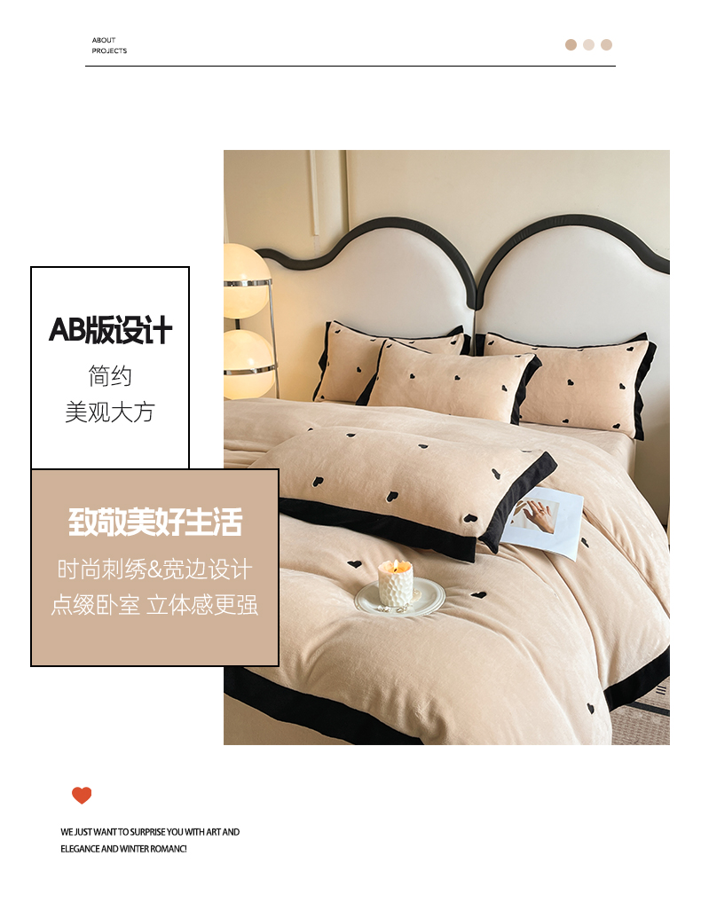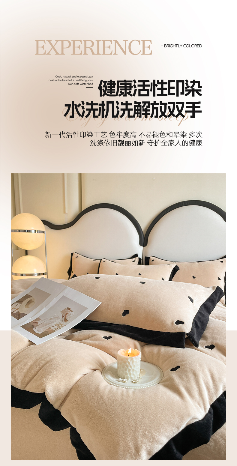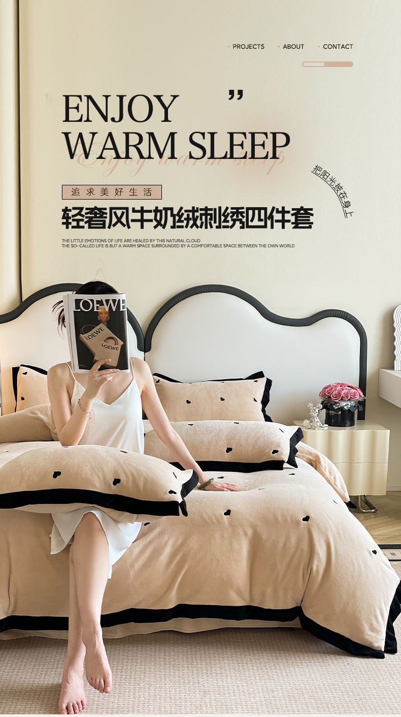 商品名称:宇航家纺 2025新款轻奢风宽边牛奶绒绣花四件套-蝴蝶结爱心 绒爱心-卡其色