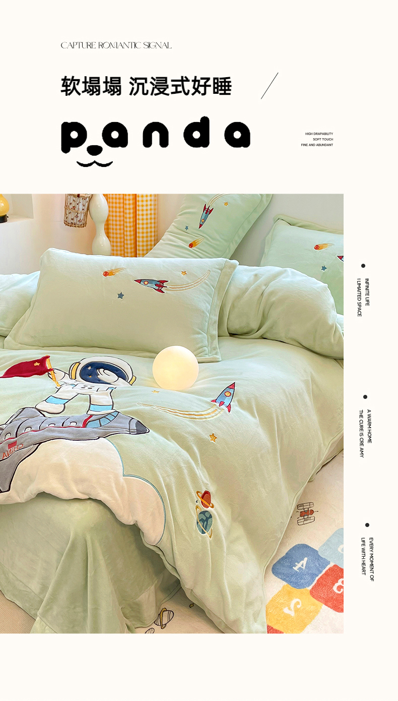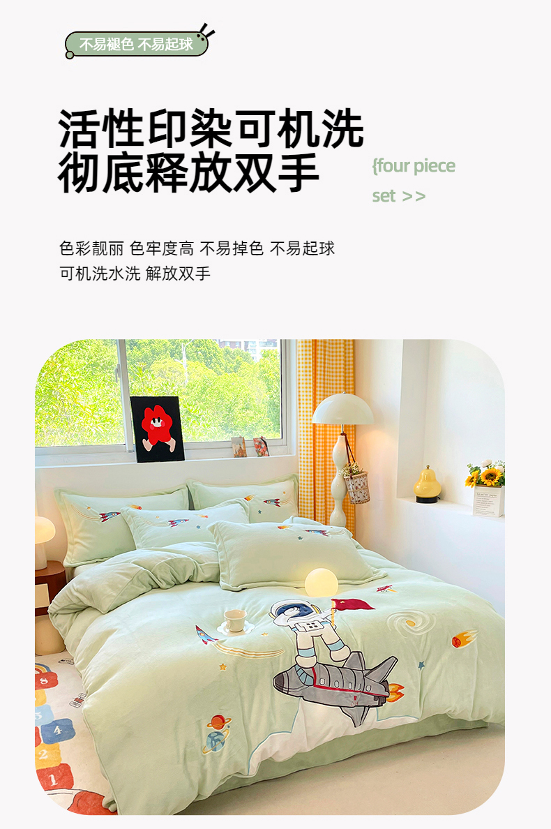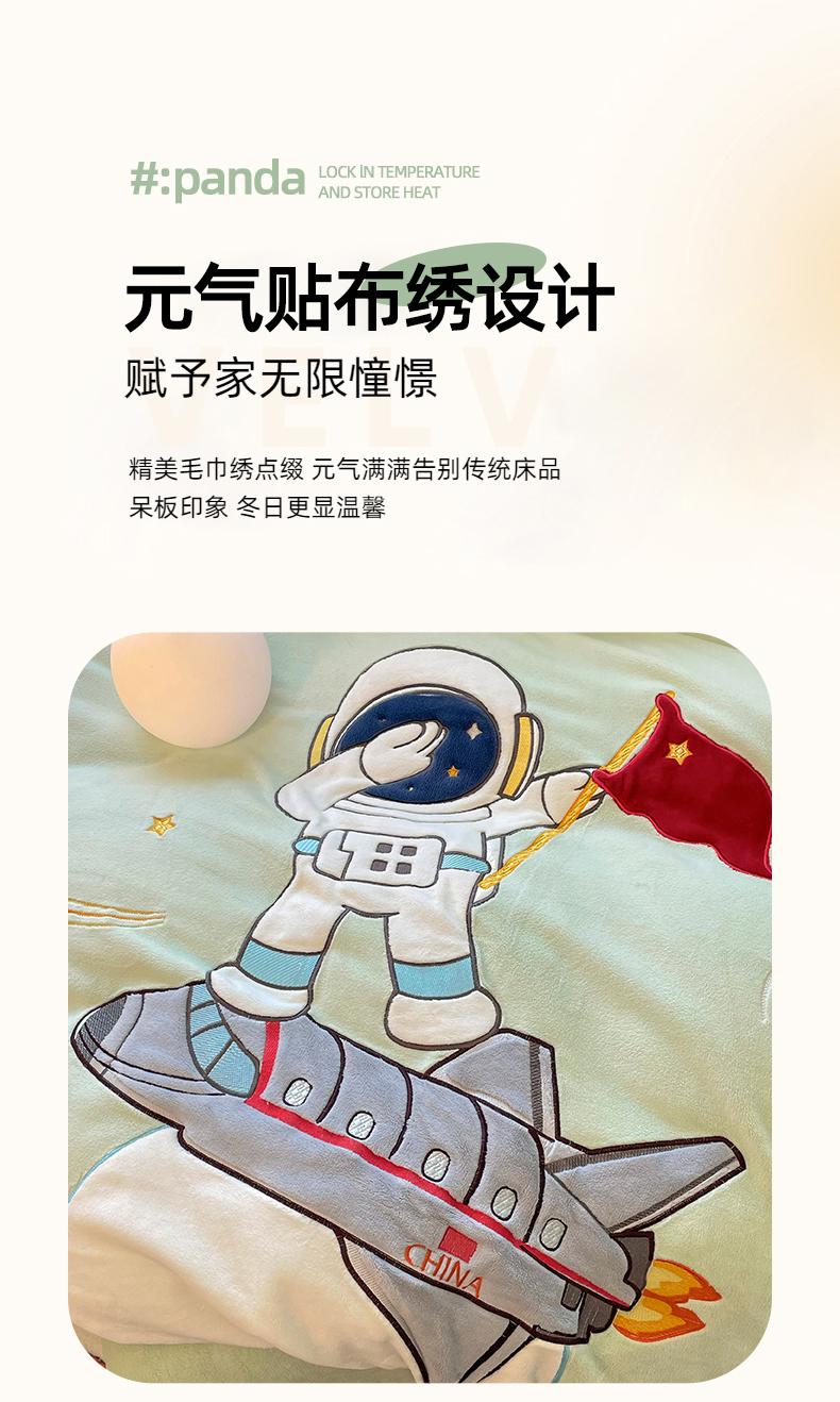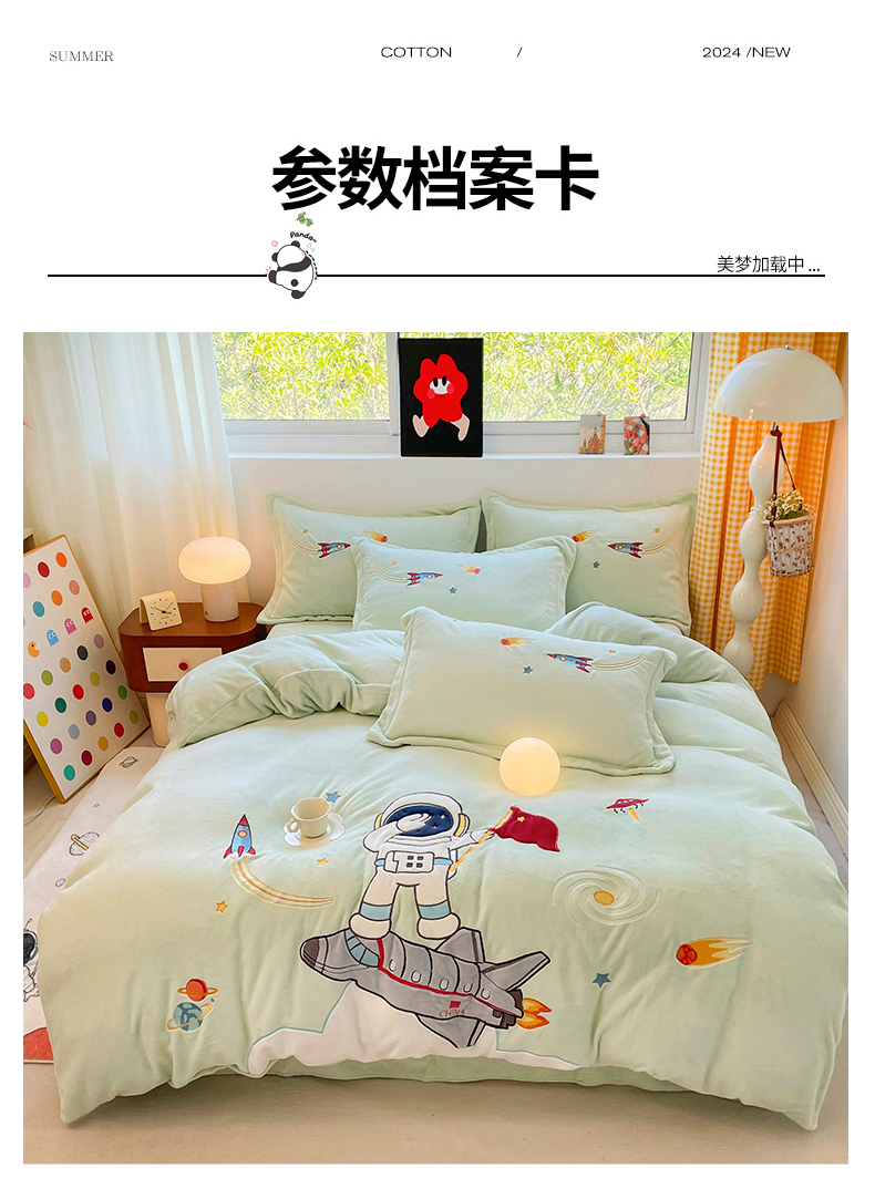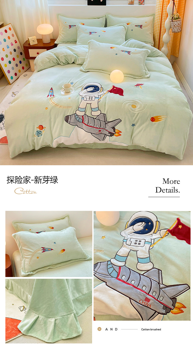 商品名称:金绣美居 2025新款牛奶绒毛绒贴布绣花保暖四件套-探险家 探险家-绿