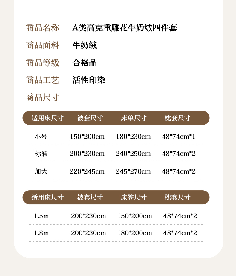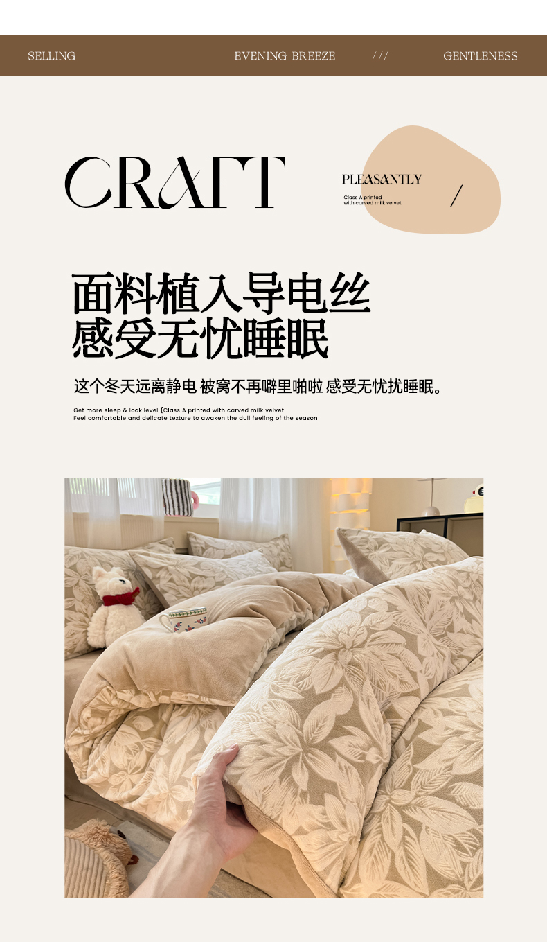 商品名称:莱茵家居 2024新款a类加厚立体雕花牛奶绒四件套 茉莉-卡其