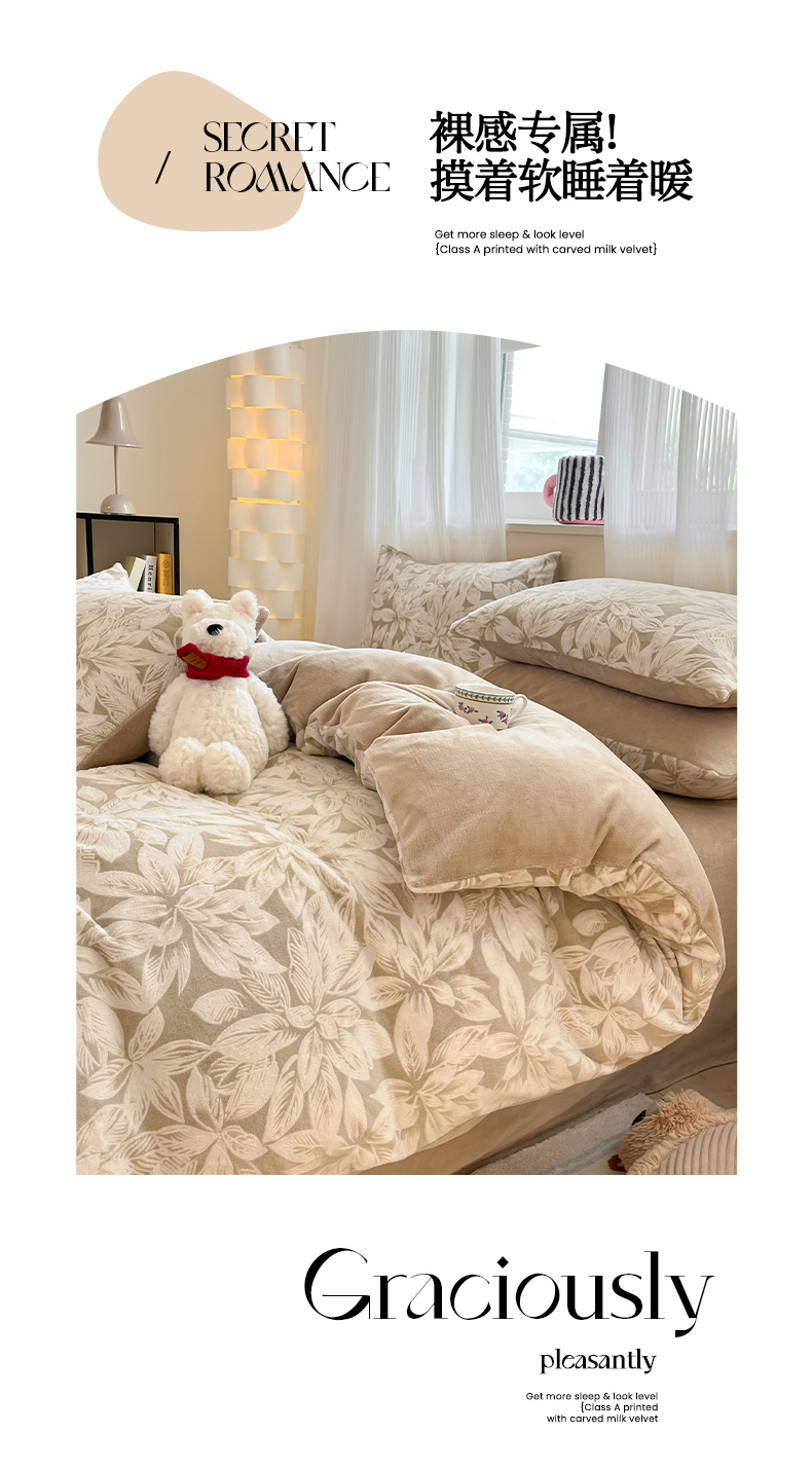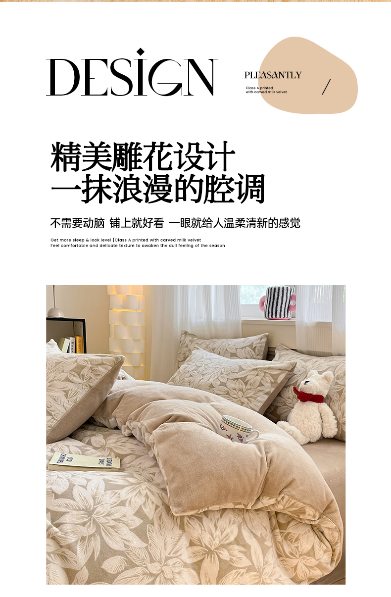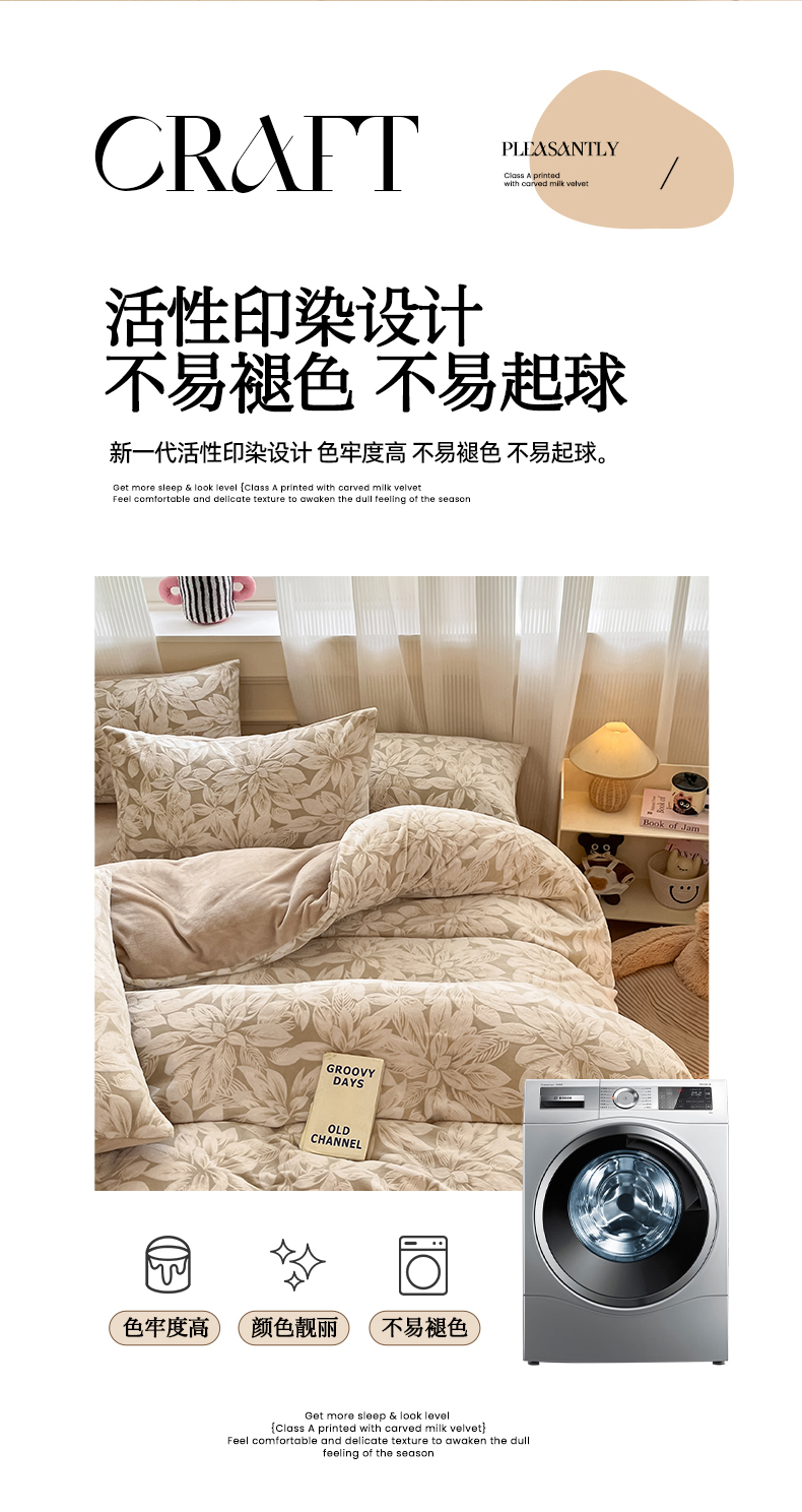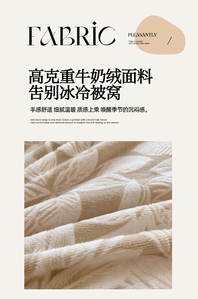 莱茵家居 2024新款a类加厚立体雕花牛奶绒四件套 茉莉-卡其