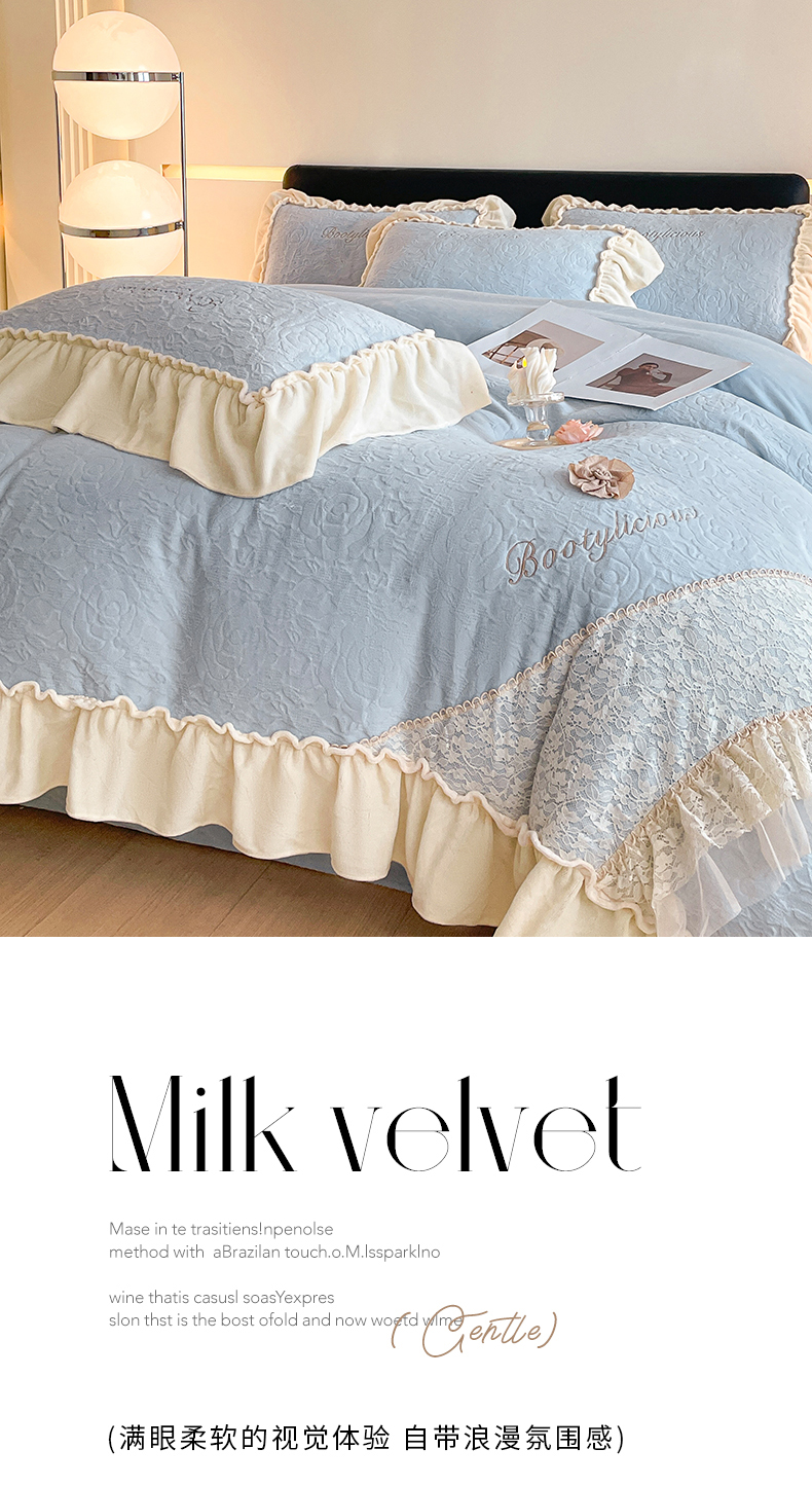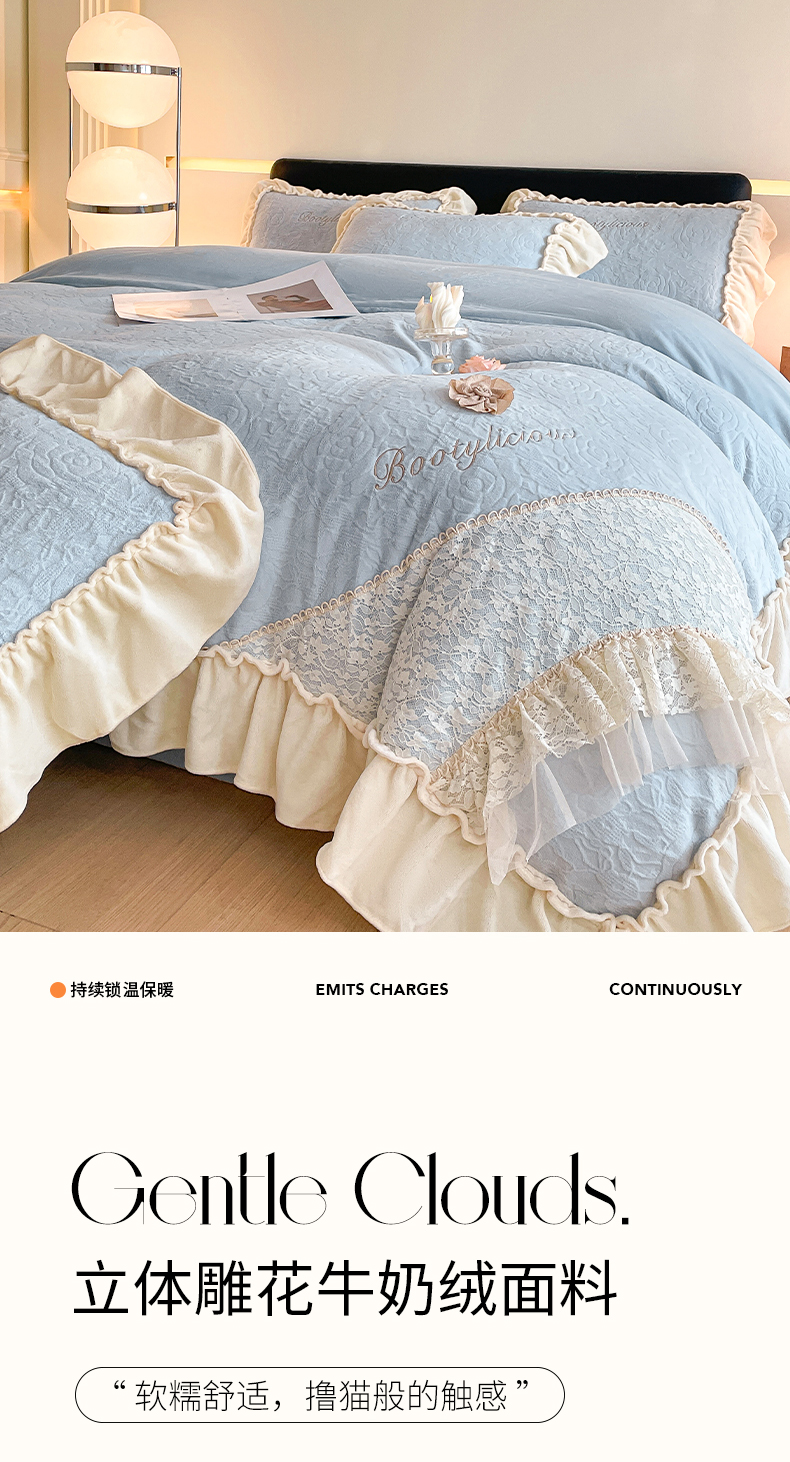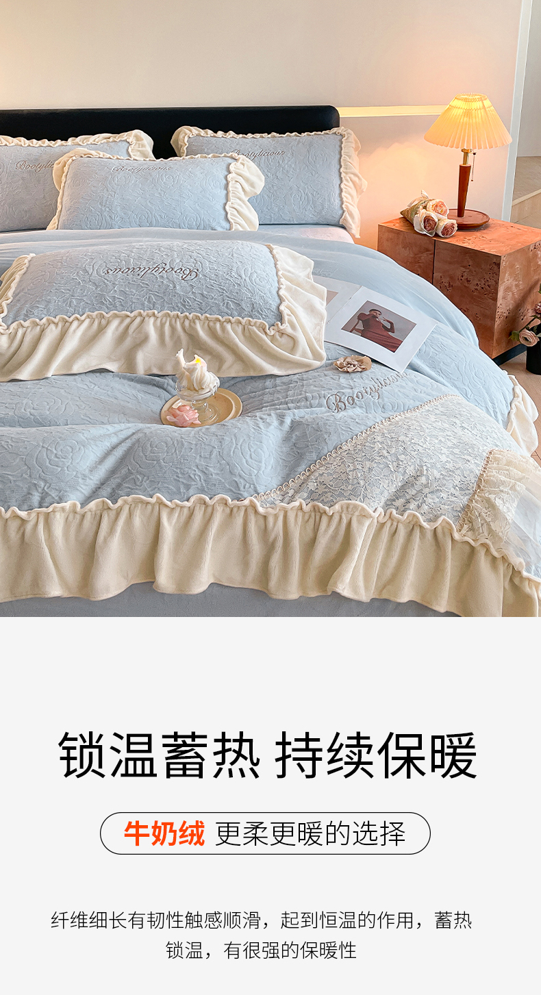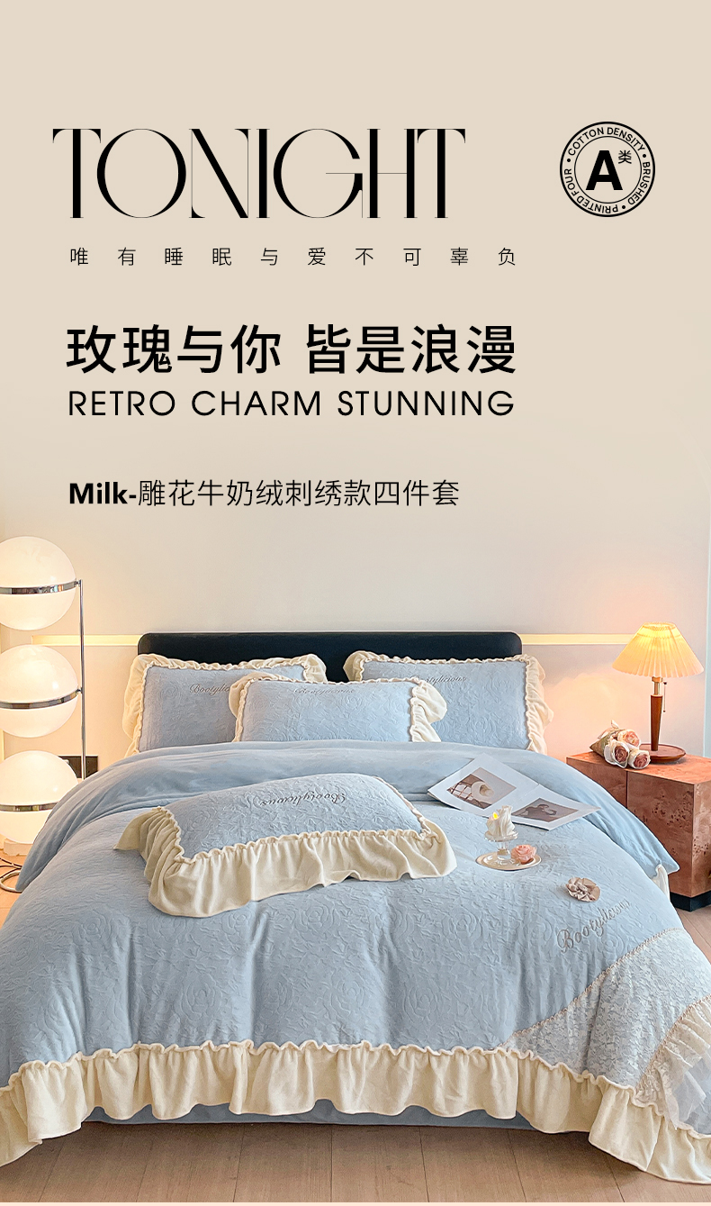嗯呢家纺 2024新款A类高克重全消光韩版雕花贴布绣牛奶绒四件套-玫瑰恋人 玫瑰恋人-湖水蓝